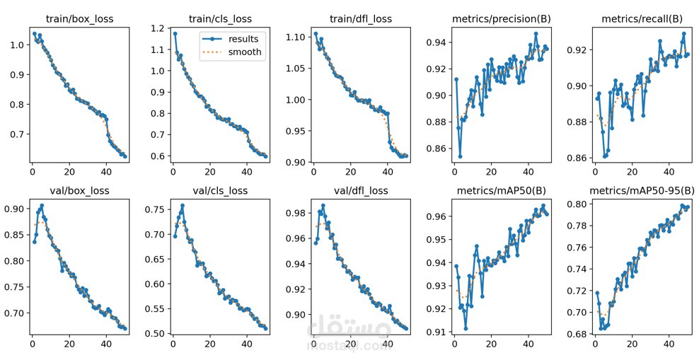 تقييم النموذج باستخدام Precision, Recall, mAP50, and mAP50-95 للوصول لأعلى أداء ممكن.