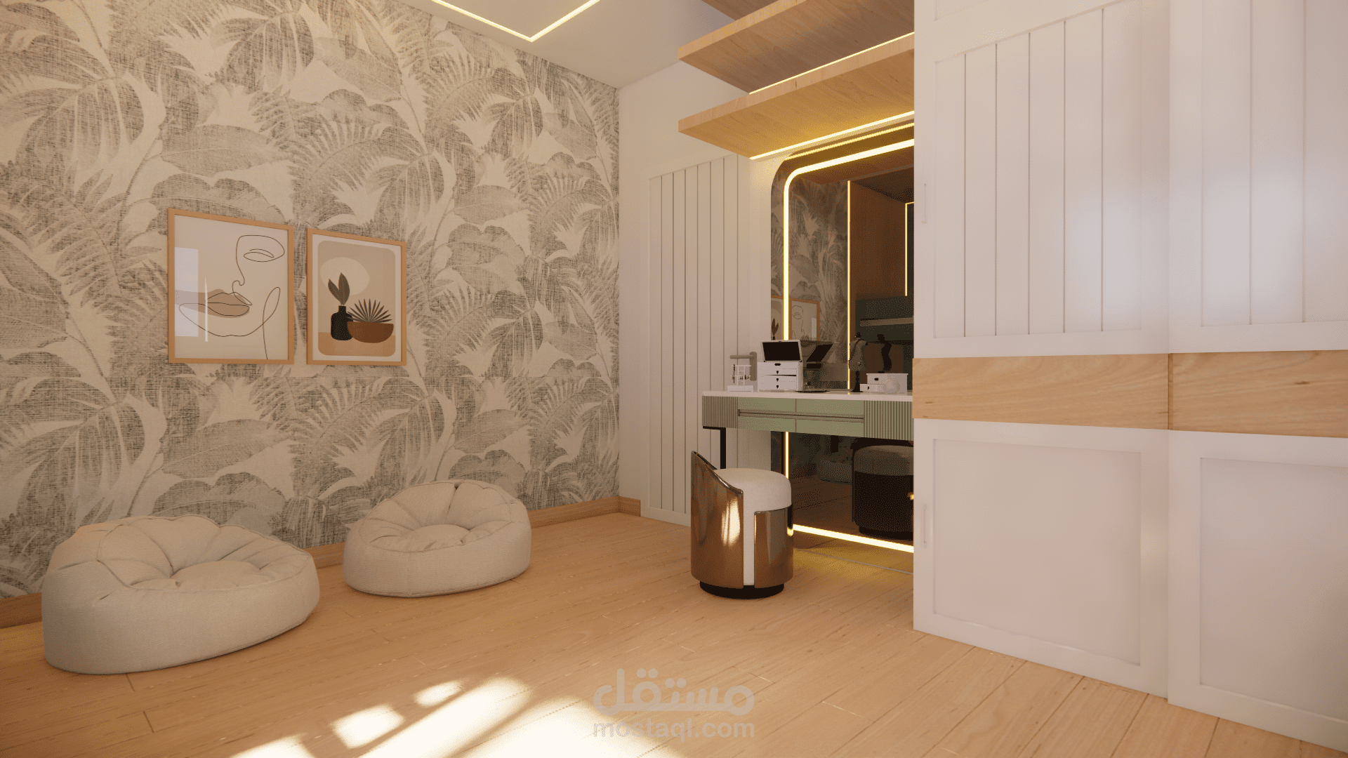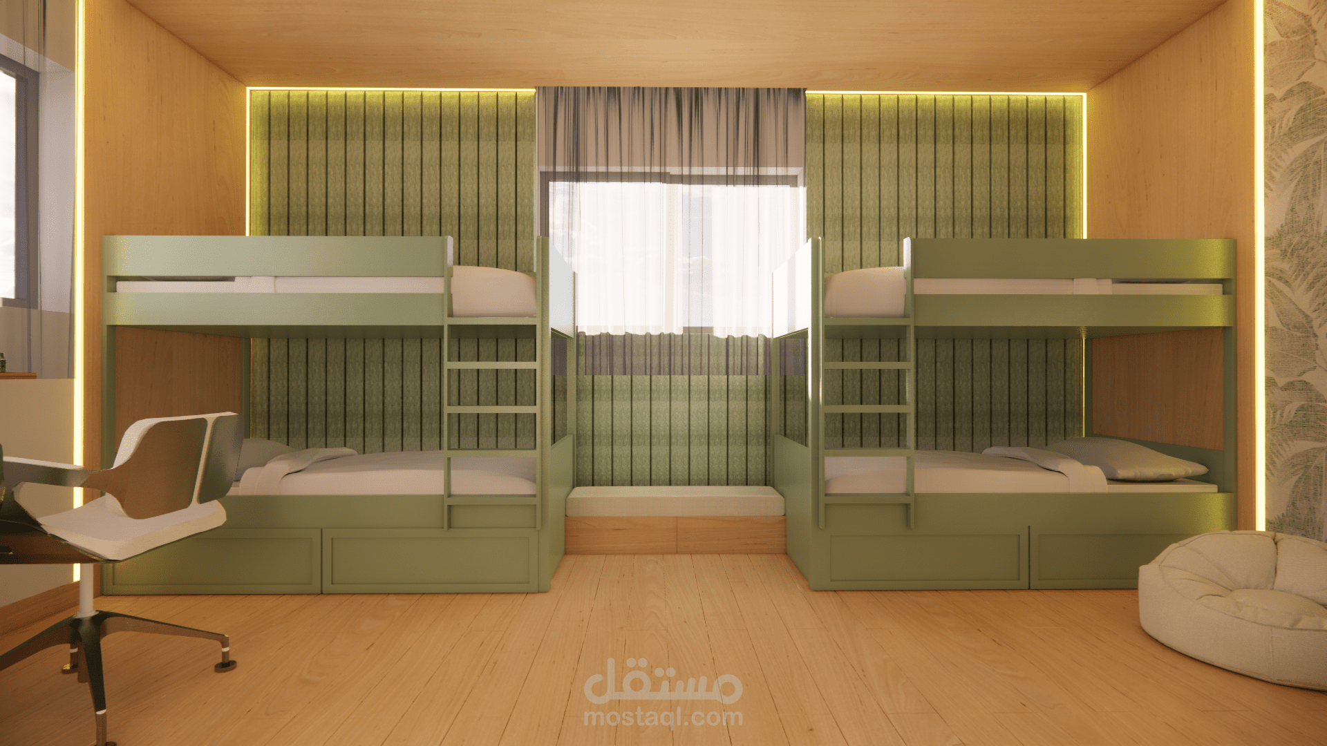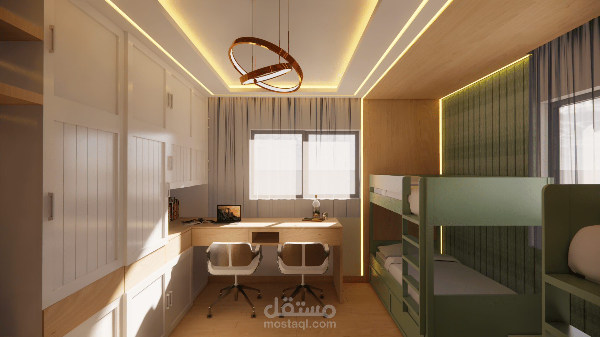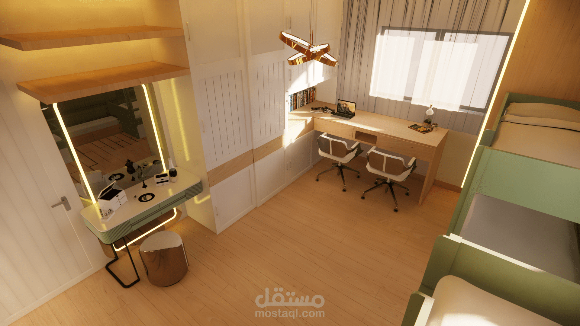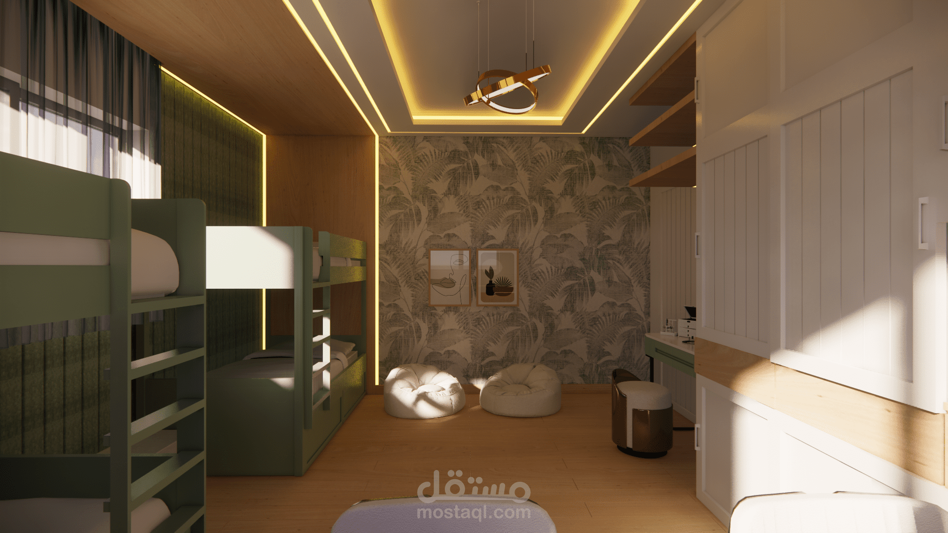 يعتمد على توزيع ذكي للأسِرّة والخزائن لتحقيق أقصى استفادة من المساحة، مع ألوان ناعمة ولمسات أنثوية تضيف جو من الراحة والانسجام