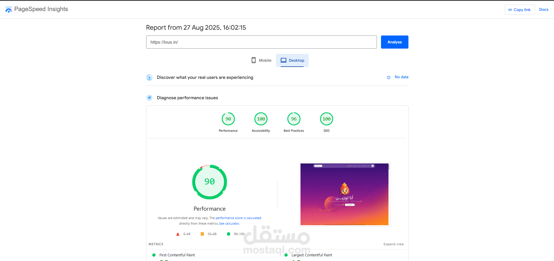 حقق الموقع 90/100 على Lighthouse Performance Score و100/100 على SEO Score.