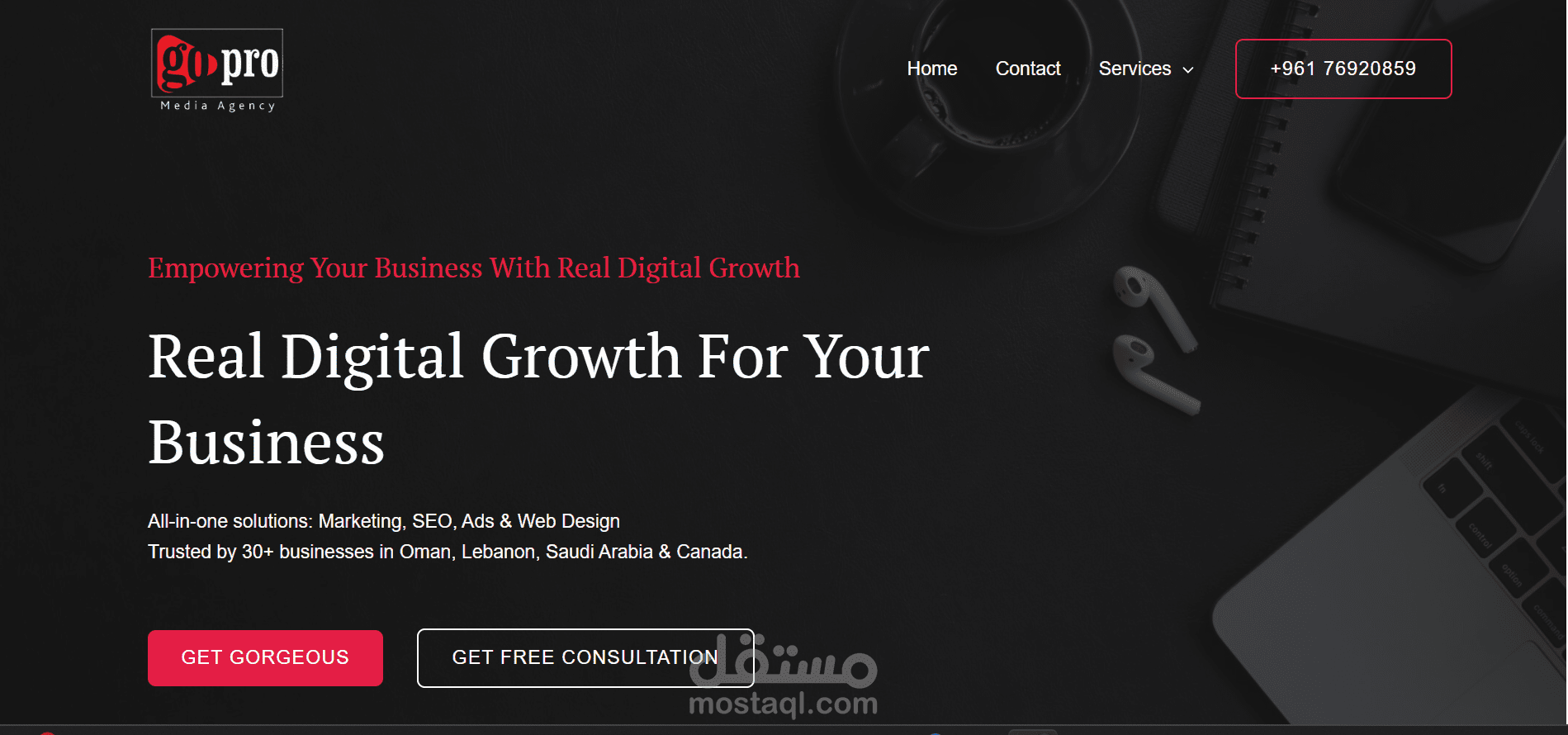 قمت بتصميم وتطوير موقع GoPro باستخدام WordPress وElementor ليعكس هوية وكالة تسويق رقمية احترافية.