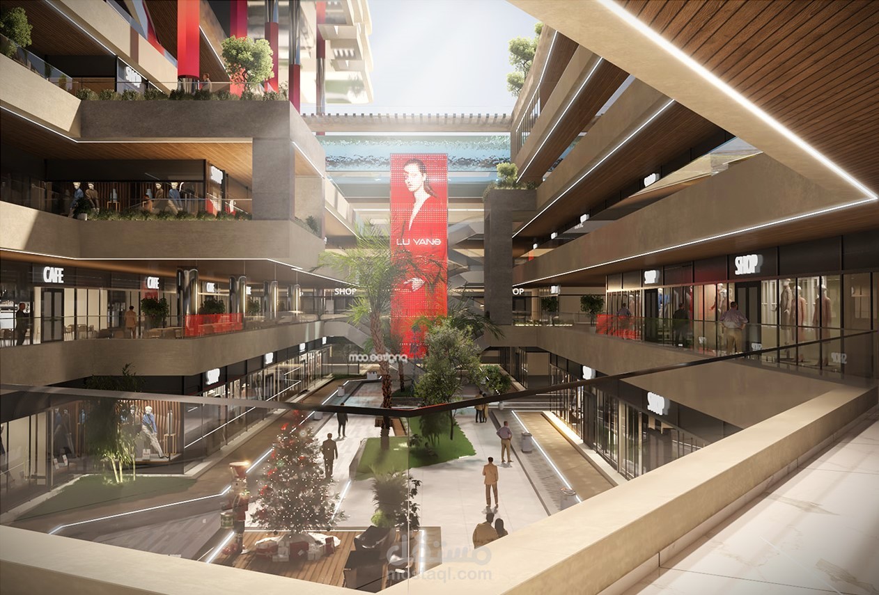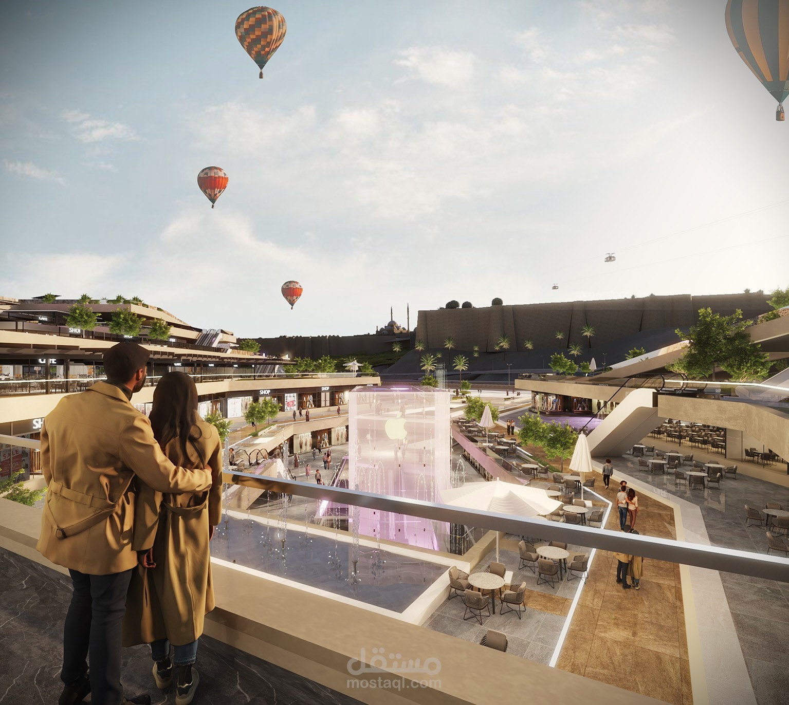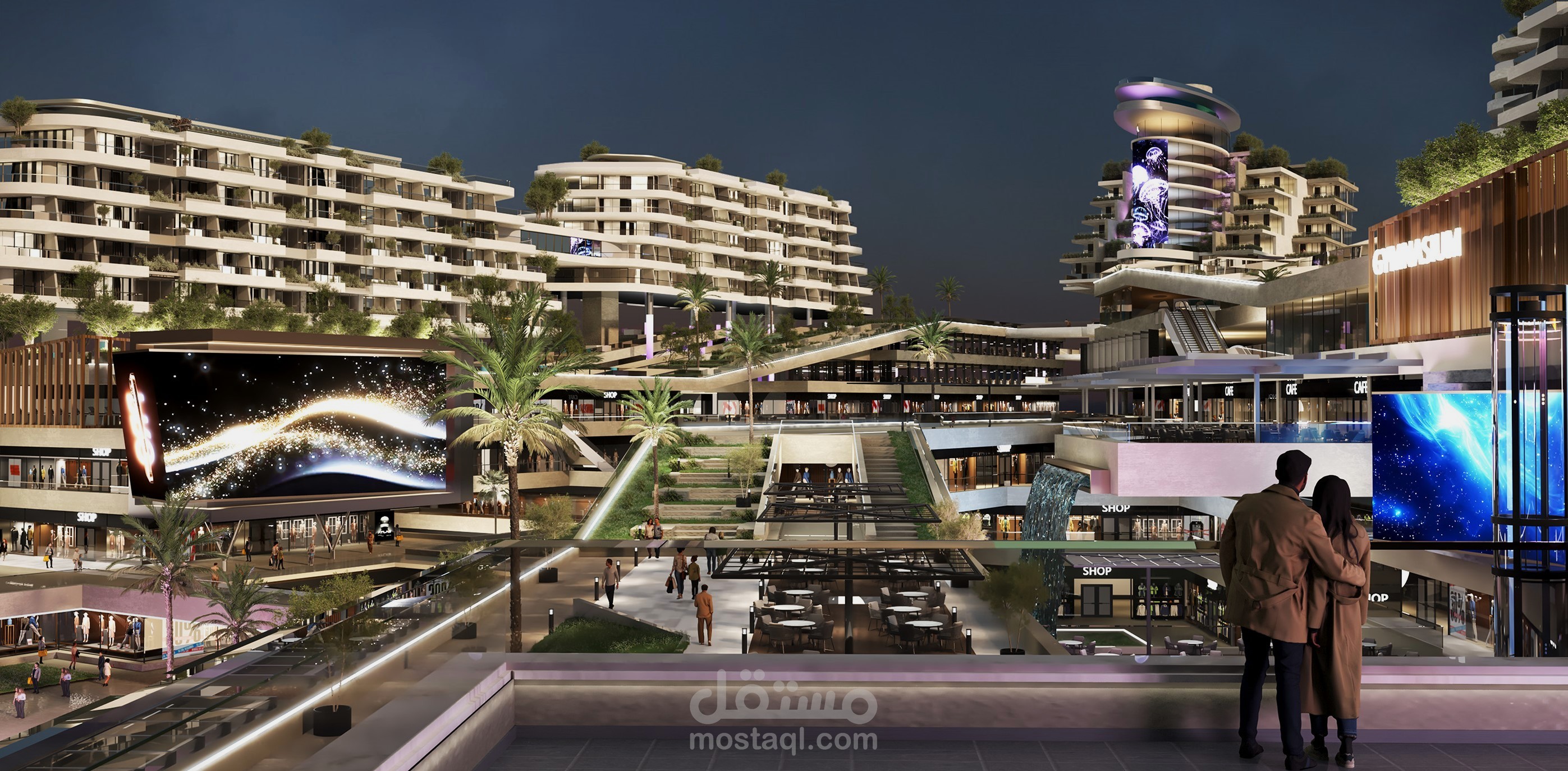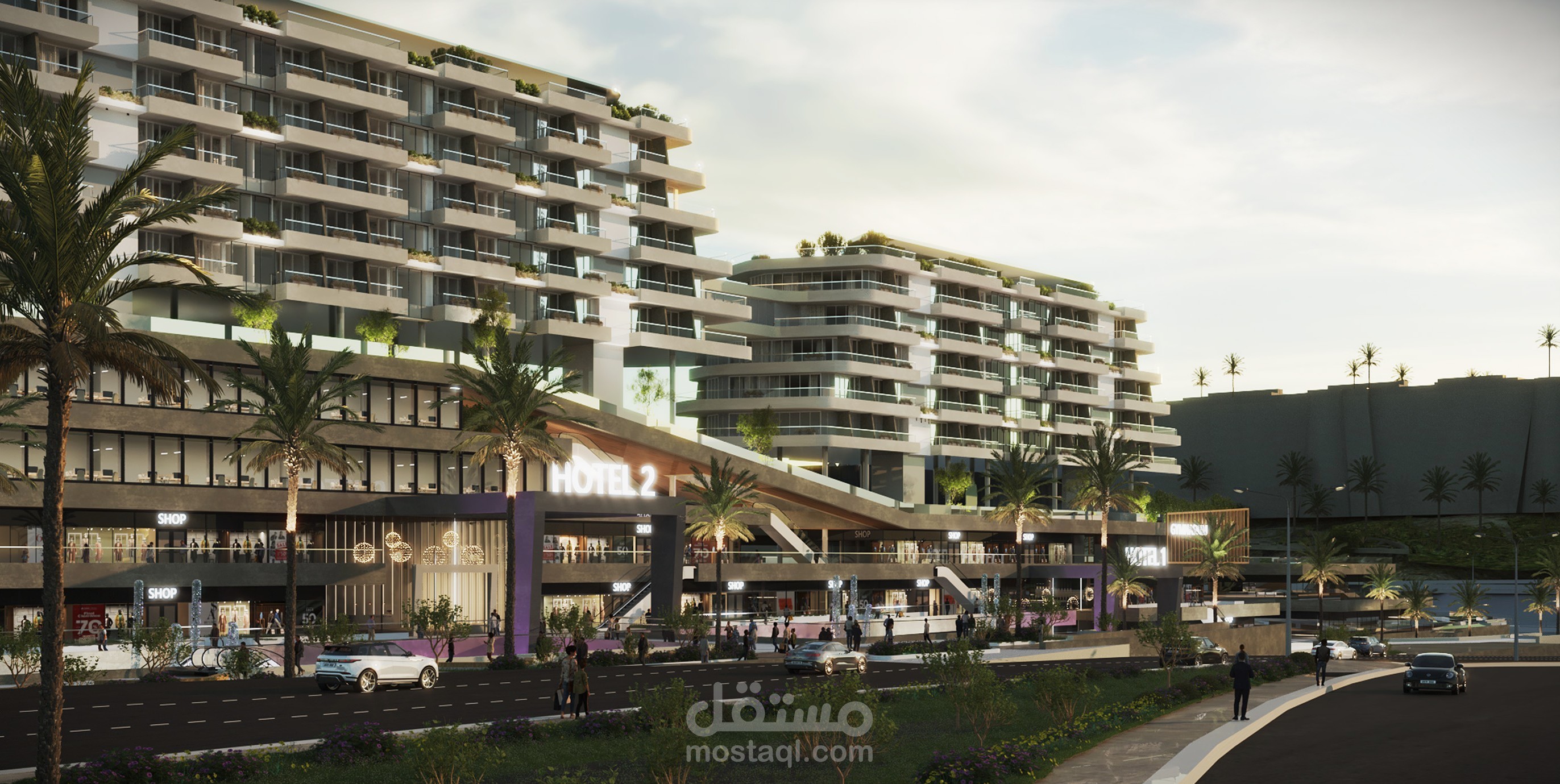 مشروع متعدد الاستخدامات يجمع بين الأنشطة التجارية والترفيهية والفندقية، يتميز بتدرجات مستوحاة من طبوغرافية الموقع بجانب القلعة، ويعبر عن توازن بين التراث والحداثة. تم تنفيذ الموديل على 3ds Max والرندر باستخدام Corona Renderer لإظهار الإضاءة والواقعية المعمارية بدقة عالية.