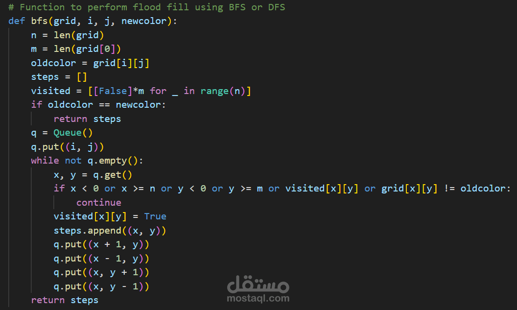 Created a visual Flood Fill algorithm using Python and Tkinter GUI to demonstrate the difference between BFS and DFS in grid traversal.
