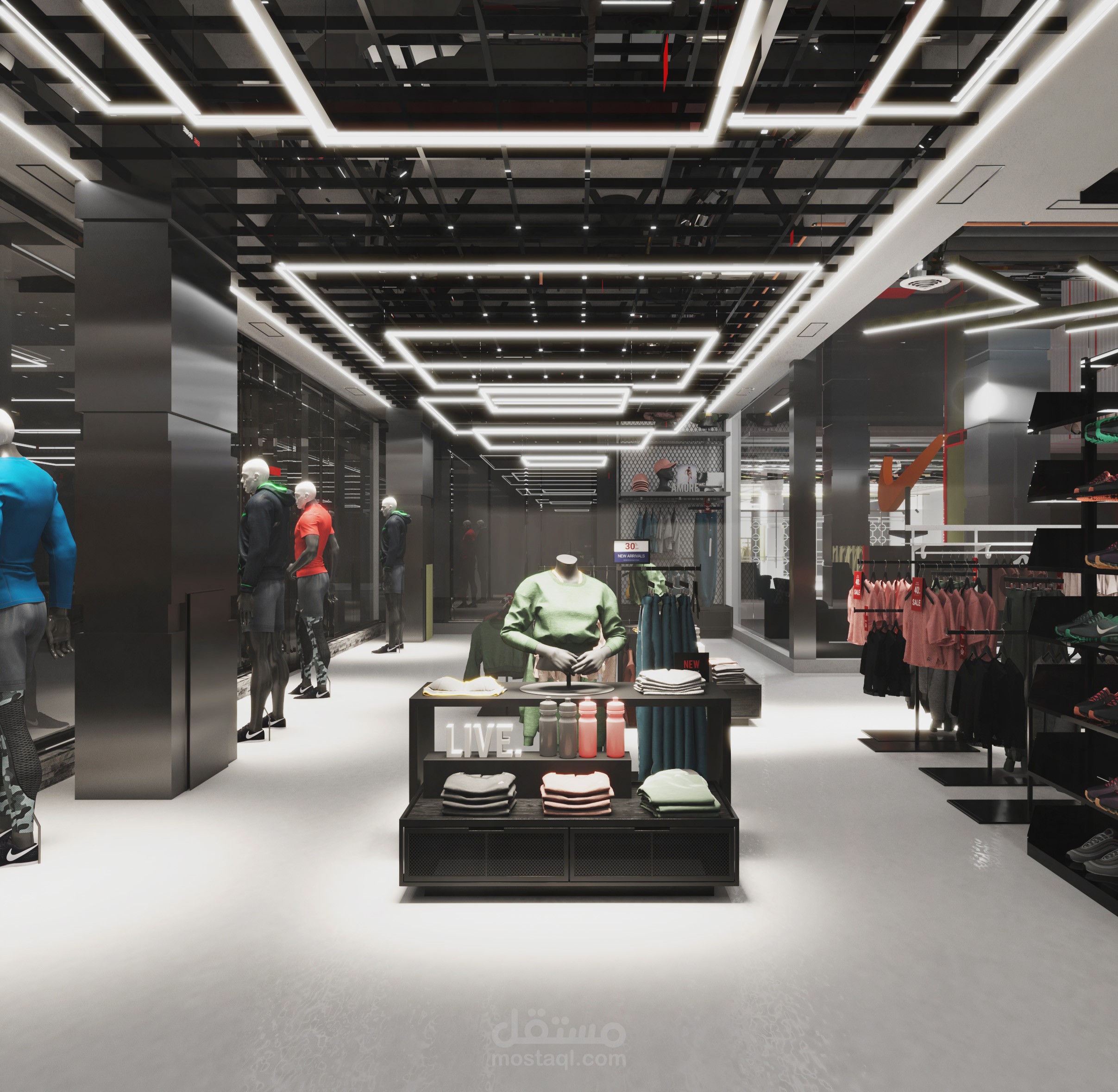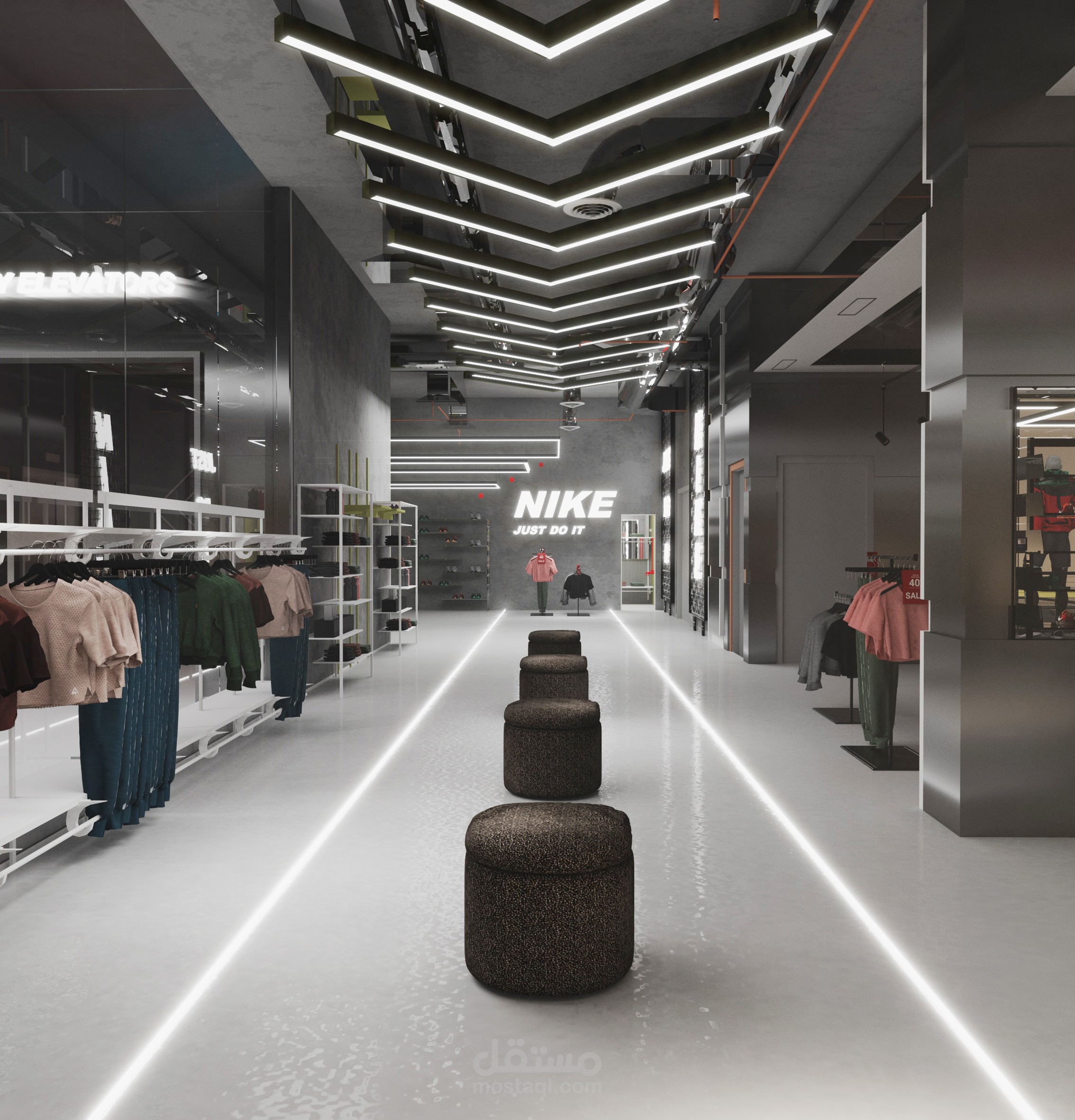 شروع تصميم وتنفيذ لمتجر Nike في القاهرة الجديدة – التجمع، يهدف إلى خلق تجربة تسوّق عصرية تعكس هوية العلامة التجارية وروحها الرياضية. شمل المشروع مراحل الديزاين والوركينج بداية من تطوير الفكرة والمفهوم التصميمي وحتى إعداد باكدج التصميم الكاملة، التي تضمنت الرسومات التنفيذية (shop drawings) والتفاصيل المعمارية والتشطيبات والإضاءة، لضمان واقعية التنفيذ واتساق التصميم مع معايير العلامة التجارية.