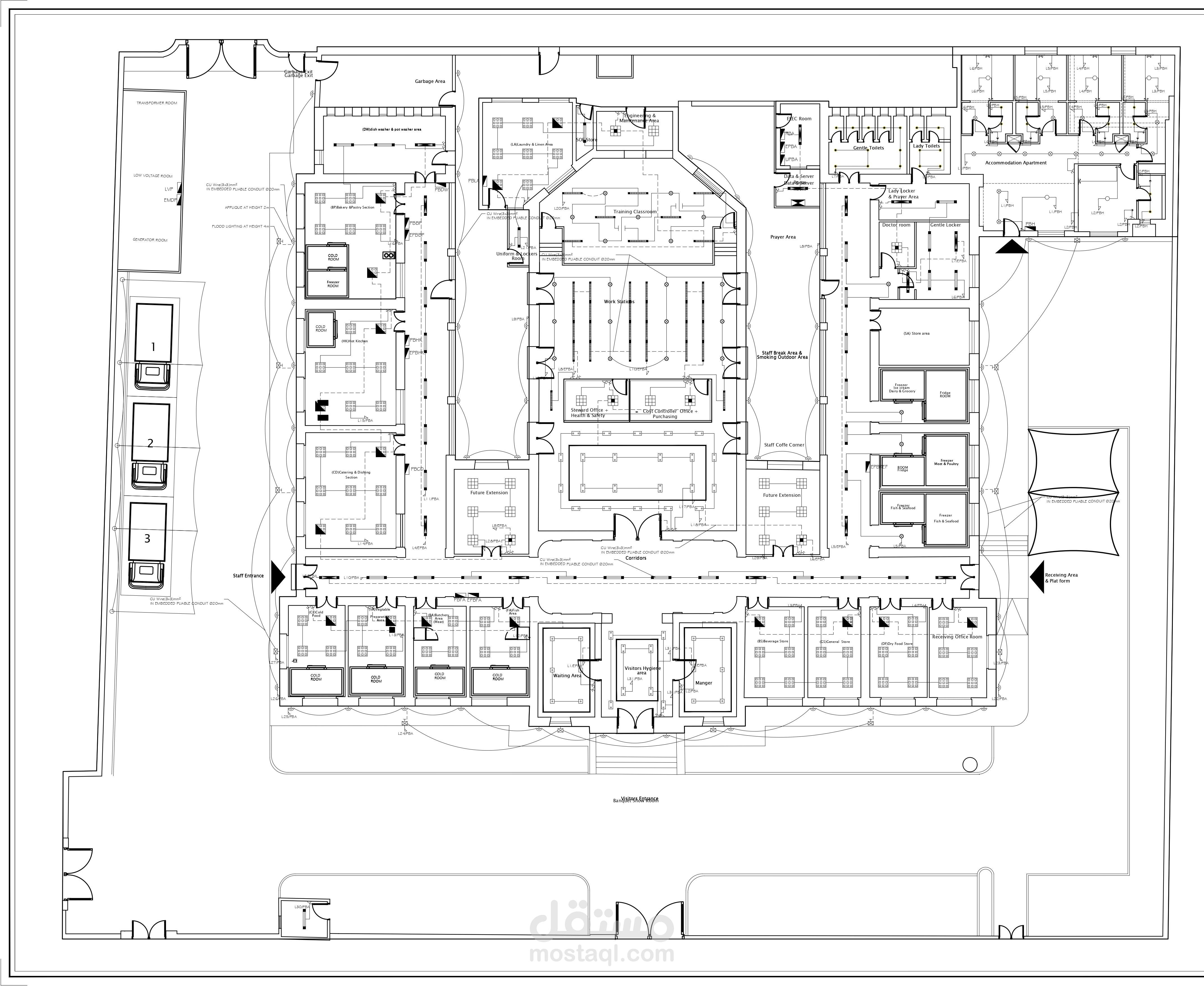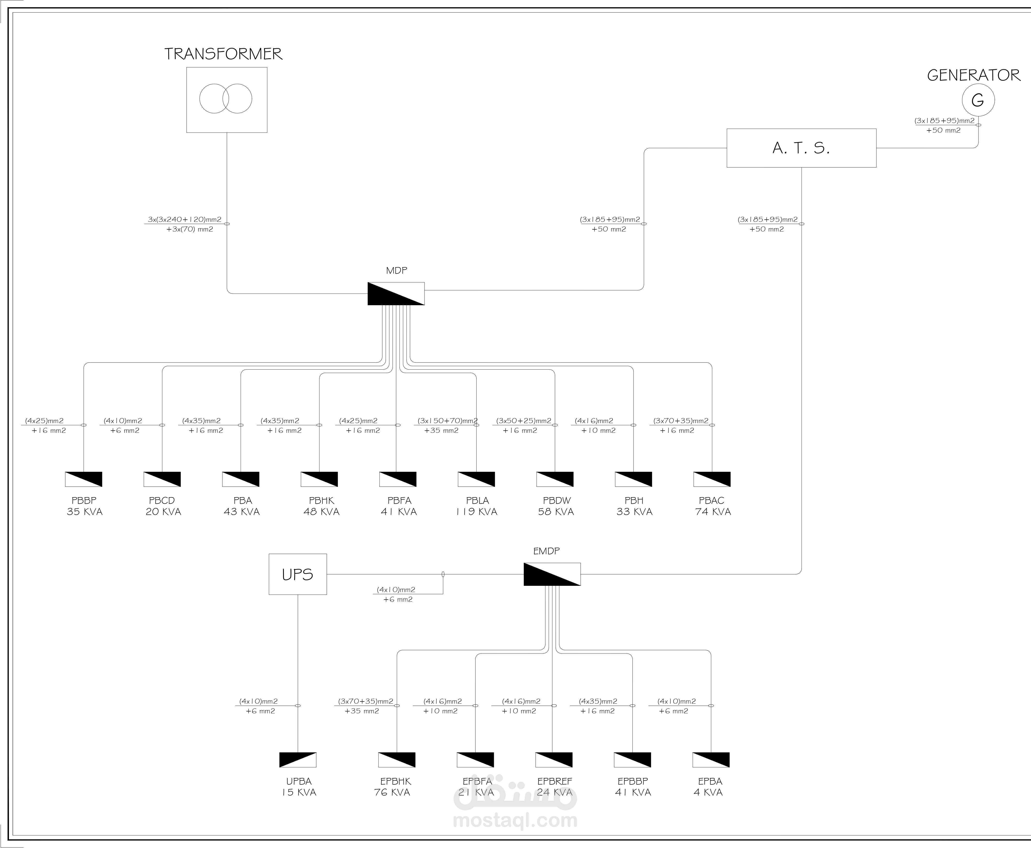 * تصميم نظام القوى (Power Layout) متضمناً توزيع الأحمال، لوحات التوزيع الفرعية، مسارات الكابلات، وحسابات الجهد والتيار.