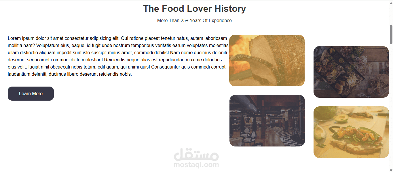 قسم التعريف: نبذة عن تاريخ المطعم وخبرته التي تمتد لأكثر من 25 سنة، مع صور توضح الأجواء والأطباق المميزة.