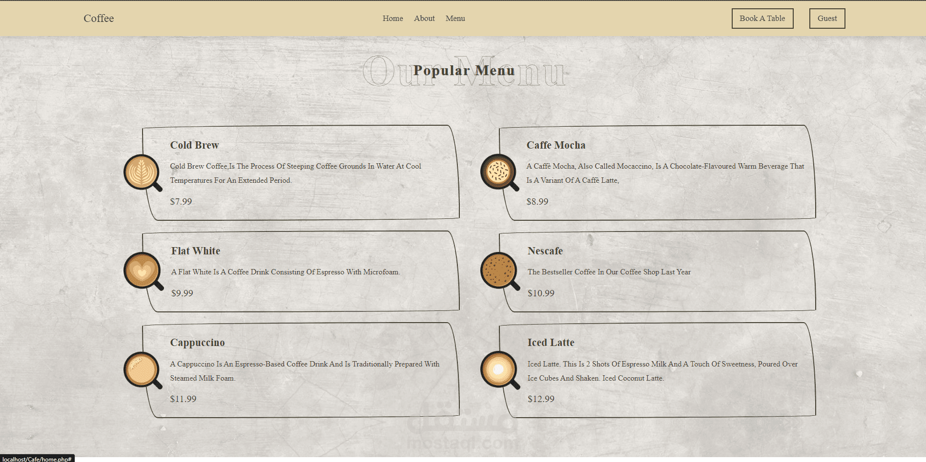 يُعد موقع المقهى تطبيق ويب تفاعلي تم تطويره باستخدام HTML، CSS، JavaScript، وPHP.