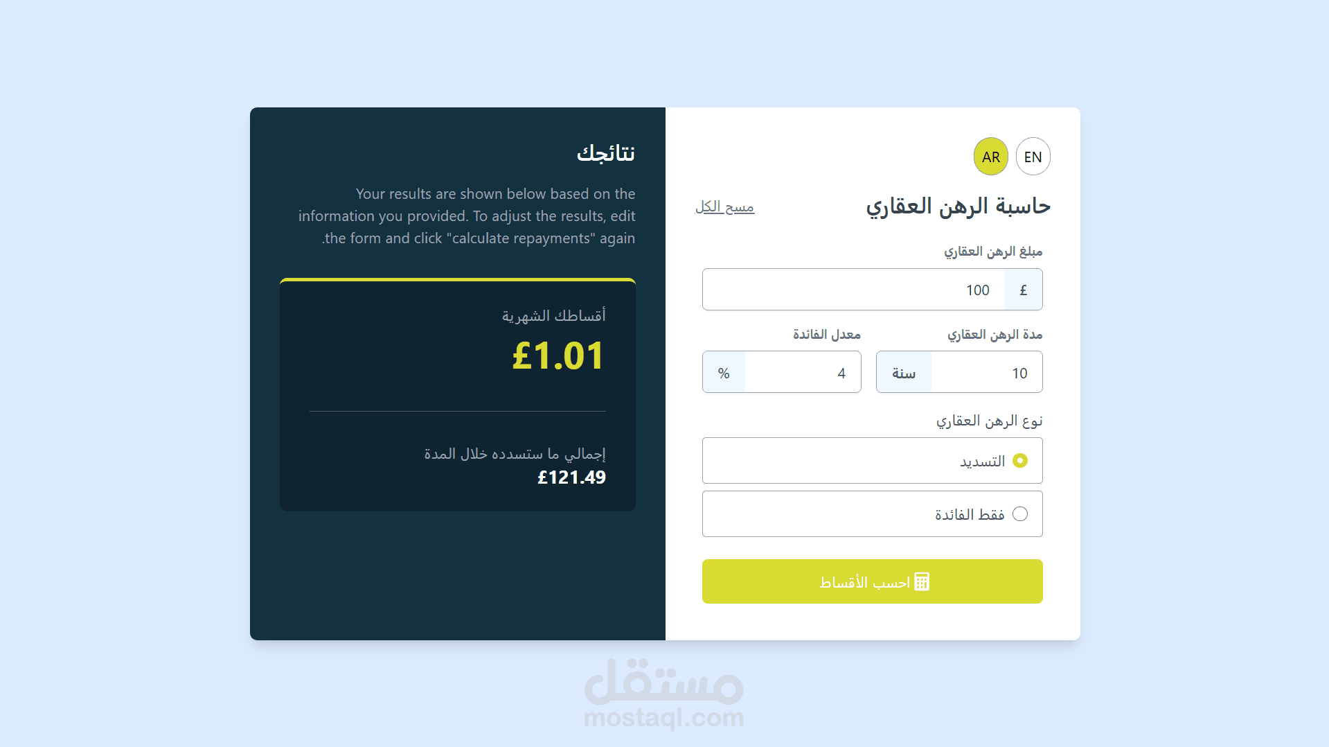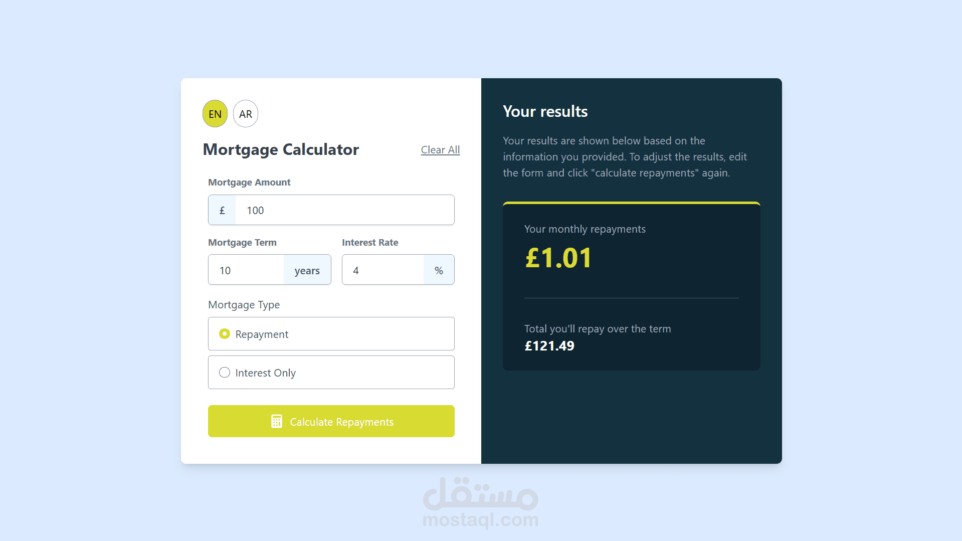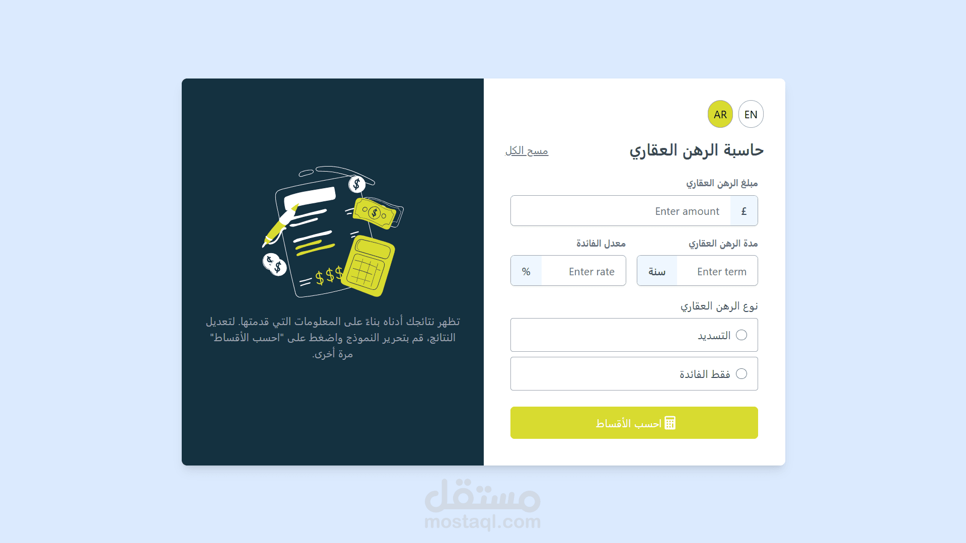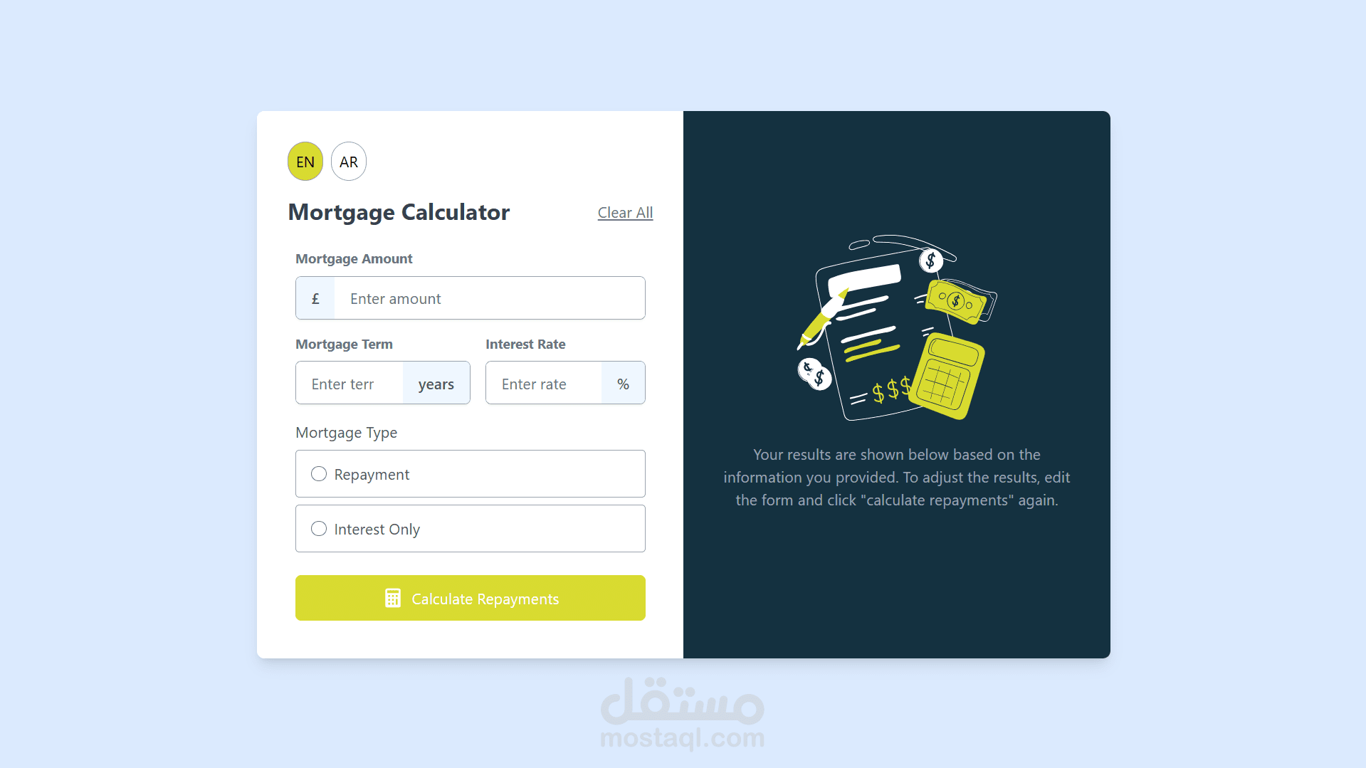 This project is a responsive Mortgage Repayment Calculator built with HTML, JavaScript, and Tailwind CSS. It allows users to estimate their monthly and total mortgage repayments based on the loan amount, term, interest rate, and type (repayment or interest-only). The calculator includes form validation, English/Arabic language toggle with RTL layout, and a clean, user-friendly design.