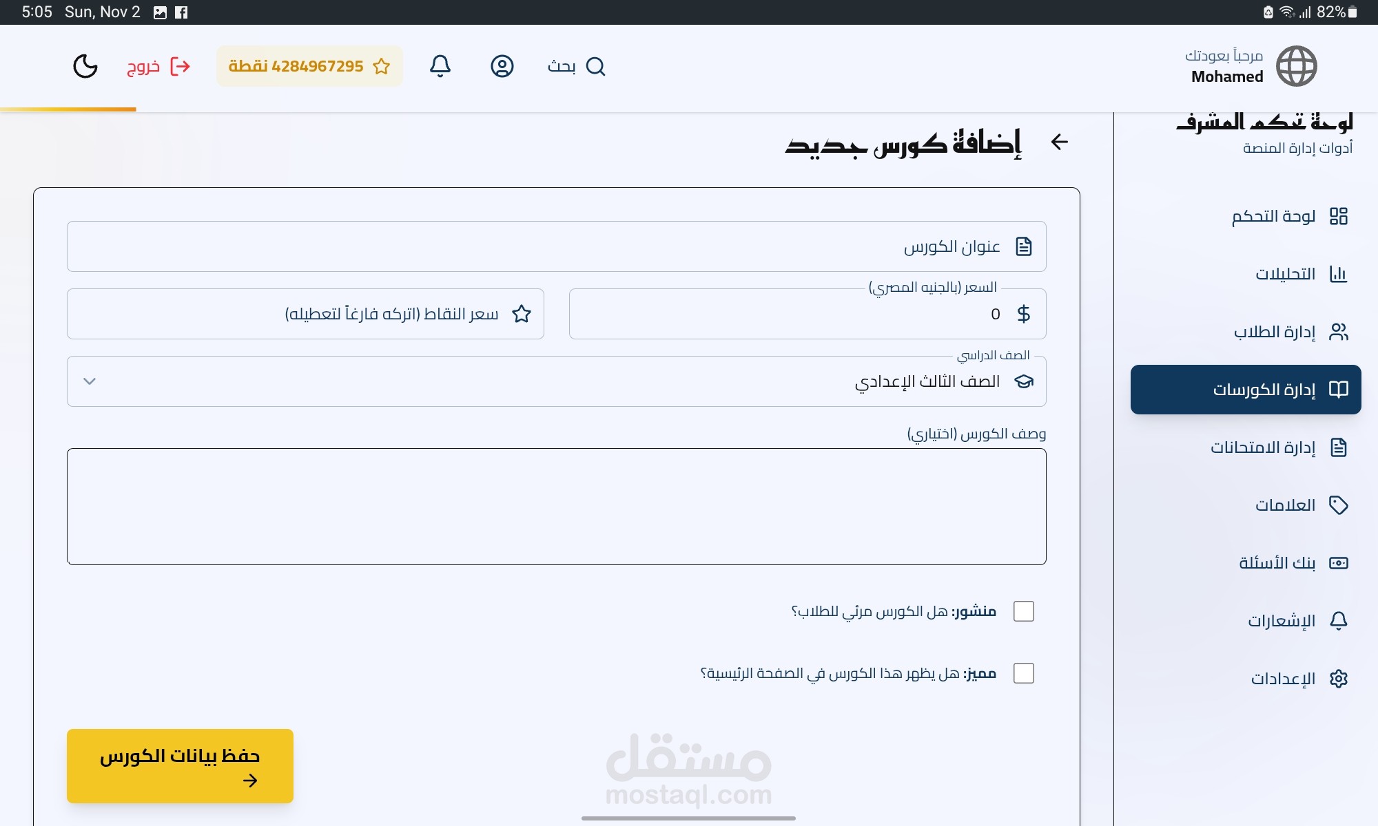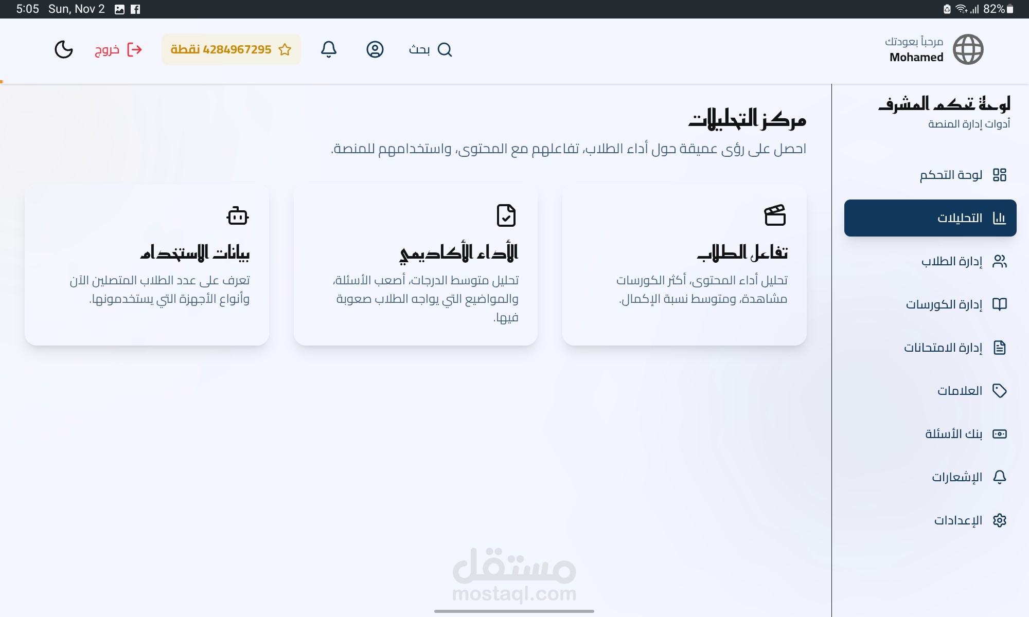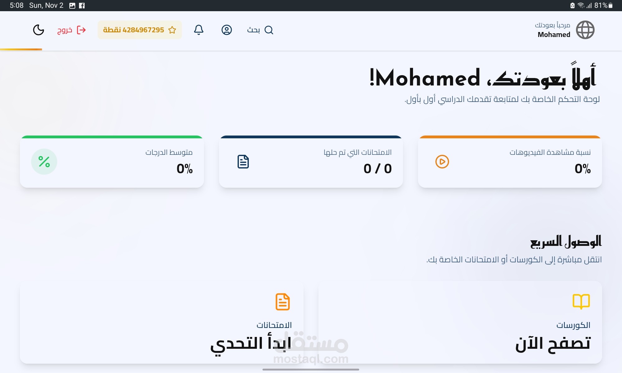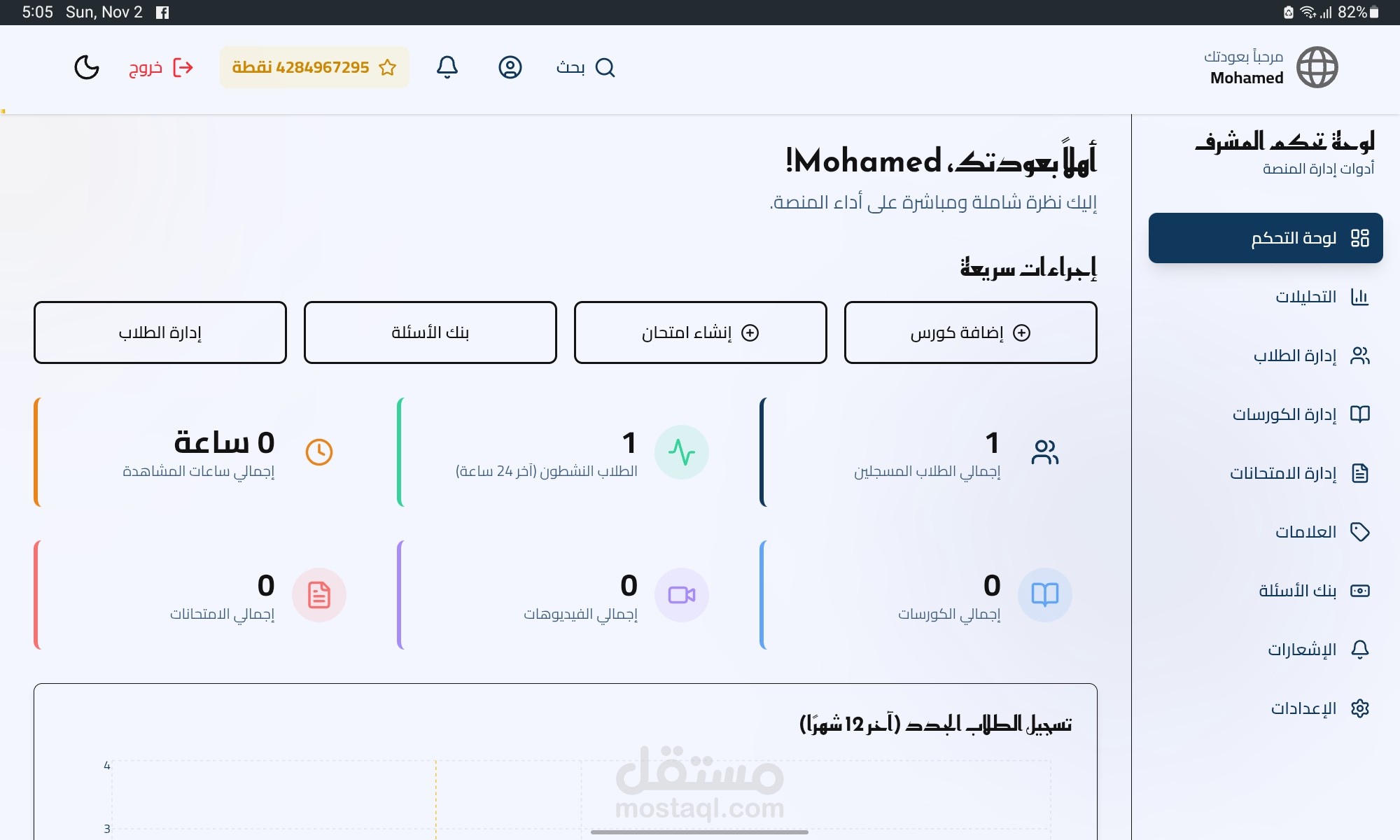 منصة تعليمة متكاملة لمدرس لغة انجليزية قمت بإنشاءه بالكامل يتكون من صفة لانشاء حساب بنظام تحقق مخصص، صفحة لتفعيل الحساب عن طريق إرسال sms، صفحة لتسجيل الدخول، شاشة راسية للطالب تعرض ملخص تقدمه، صفحة لعرض الكورسات المتاحة لصفه، صفحة لعرض محتوي الكورس وصفحة لعرض الفيديو وتنزيل المرفقات، صفحة لاداء الامتحانات مع نظام مكافئات، صفحة لعرض تحليل لتقدمه الدراسي، لوحة تحكم متكاملة للمدير تسمح له بتحليل الأداء العام للموقع مع انشاء وتعديل وحذف الكورسات والفديوهات والاسالة والعلامات