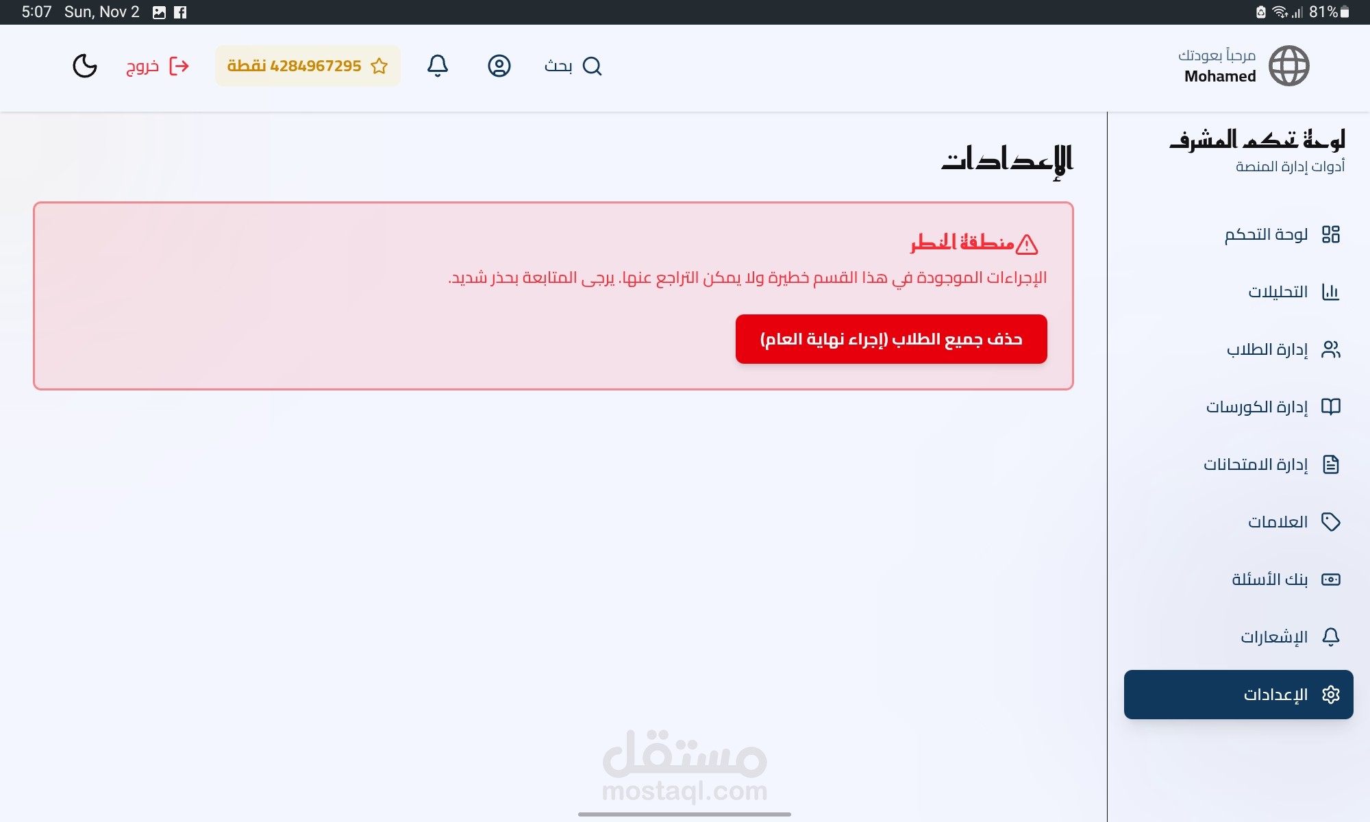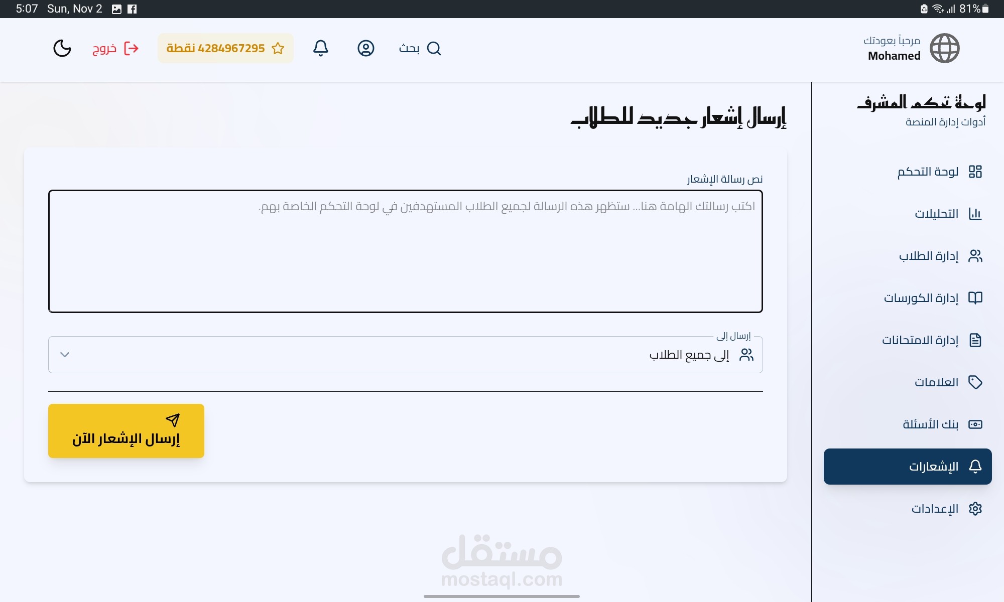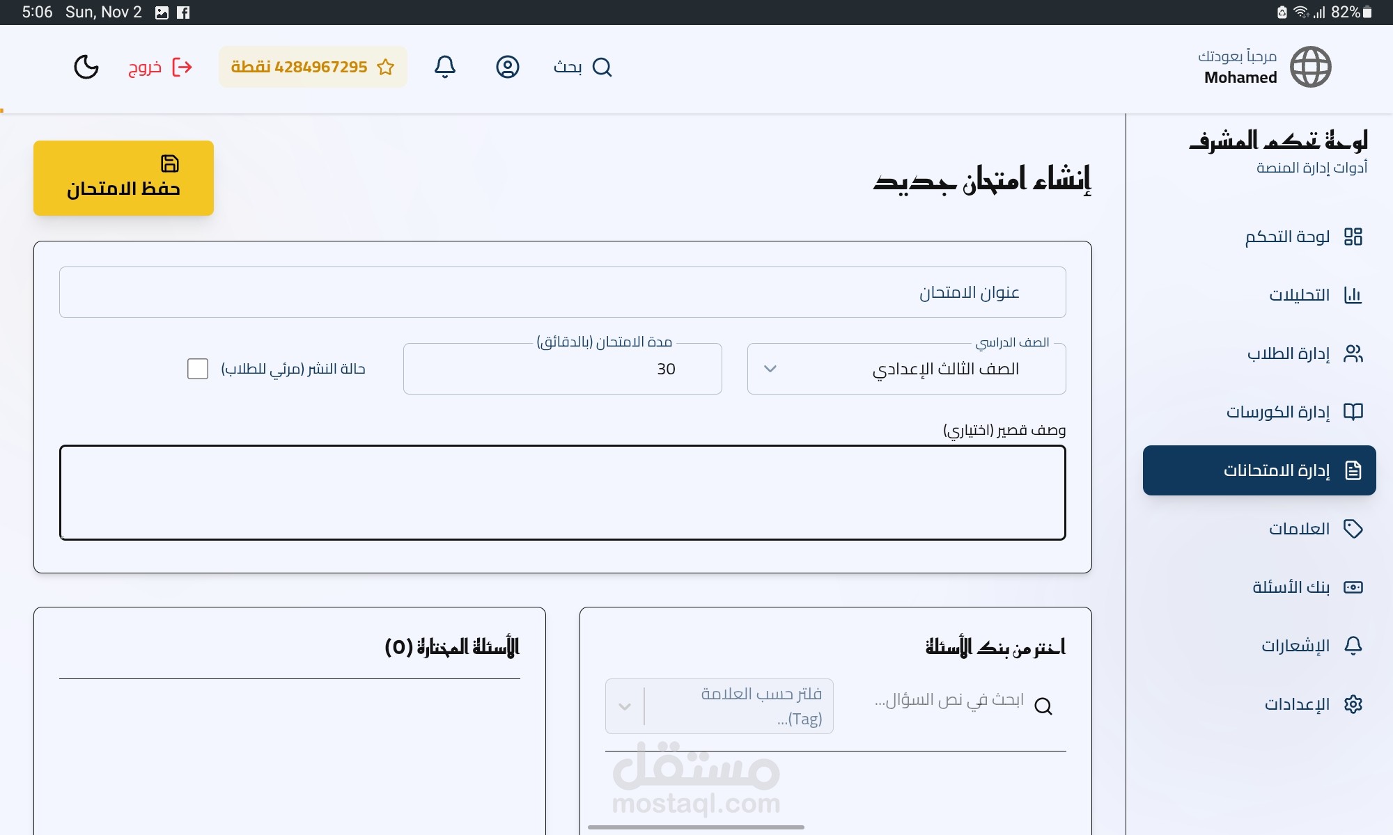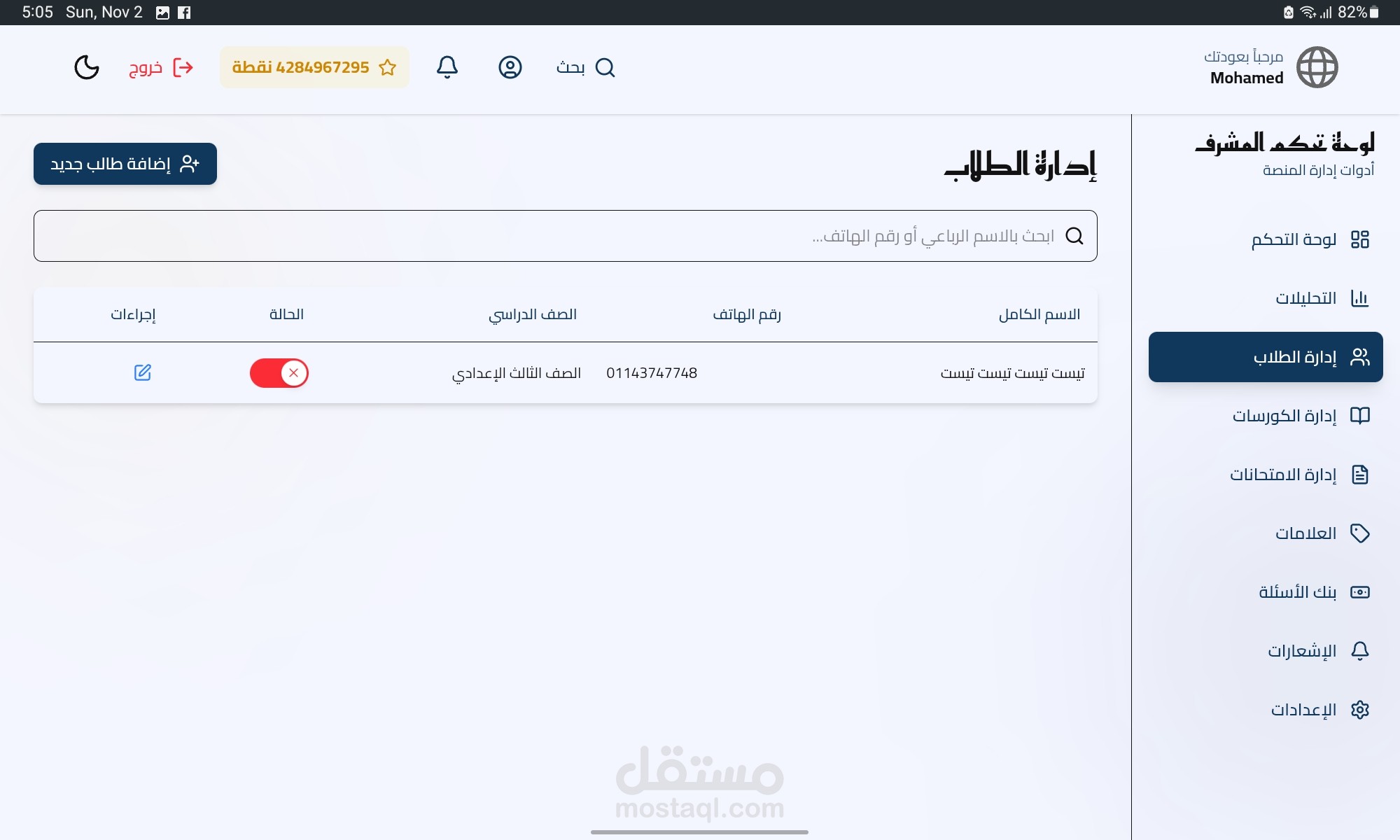 منصة تعليمة متكاملة لمدرس لغة انجليزية قمت بإنشاءه بالكامل يتكون من صفة لانشاء حساب بنظام تحقق مخصص، صفحة لتفعيل الحساب عن طريق إرسال sms، صفحة لتسجيل الدخول، شاشة راسية للطالب تعرض ملخص تقدمه، صفحة لعرض الكورسات المتاحة لصفه، صفحة لعرض محتوي الكورس وصفحة لعرض الفيديو وتنزيل المرفقات، صفحة لاداء الامتحانات مع نظام مكافئات، صفحة لعرض تحليل لتقدمه الدراسي، لوحة تحكم متكاملة للمدير تسمح له بتحليل الأداء العام للموقع مع انشاء وتعديل وحذف الكورسات والفديوهات والاسالة والعلامات