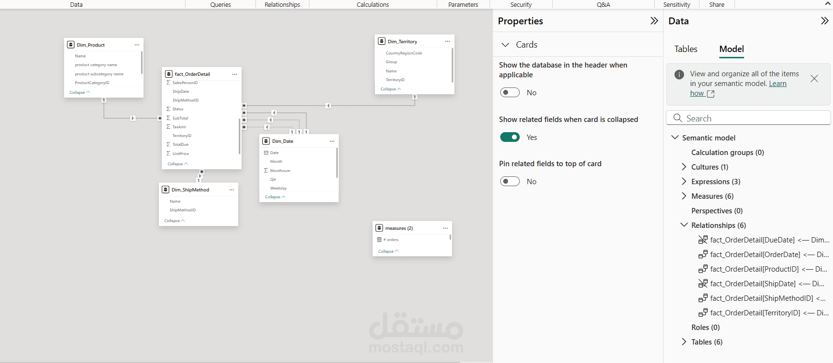 تم استخدام Power Query لإزالة التكرارات، توحيد التنسيقات، وإنشاء أعمدة مخصصة، بينما تم بناء نموذج بيانات على شكل Star Schema لزيادة كفاءة التحليل. كما تم تطوير مقاييس DAX لحساب النمو، متوسط قيمة الطلب، ونسب كل فئة من إجمالي المبيعات.