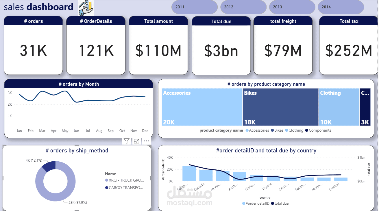 الملف يحتوي على مؤشرات رئيسية (KPIs) مثل عدد الطلبات، إجمالي المبيعات، الضرائب، والشحن، بالإضافة إلى رسوم بيانية متنوعة: