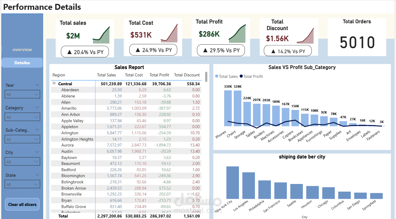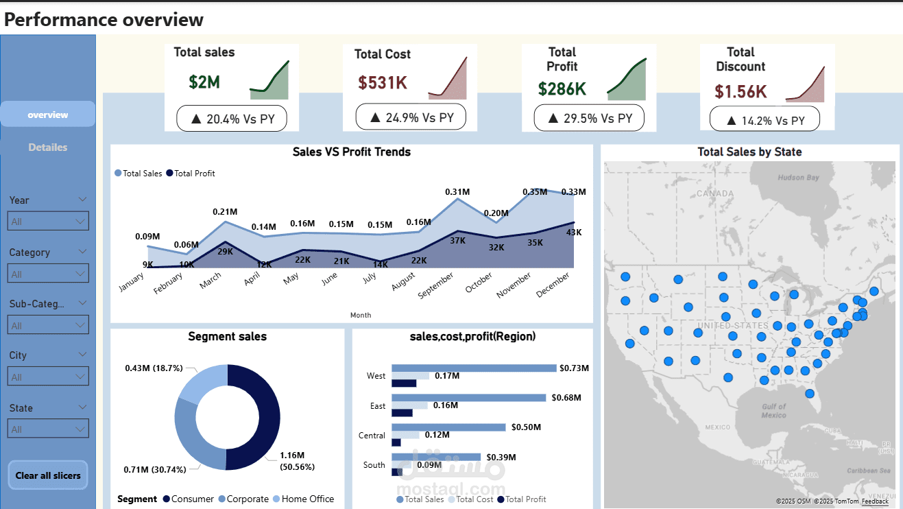 عرض المبيعات حسب الفئة والمنطقة والولاية بطريقة مرئية وواضحة.