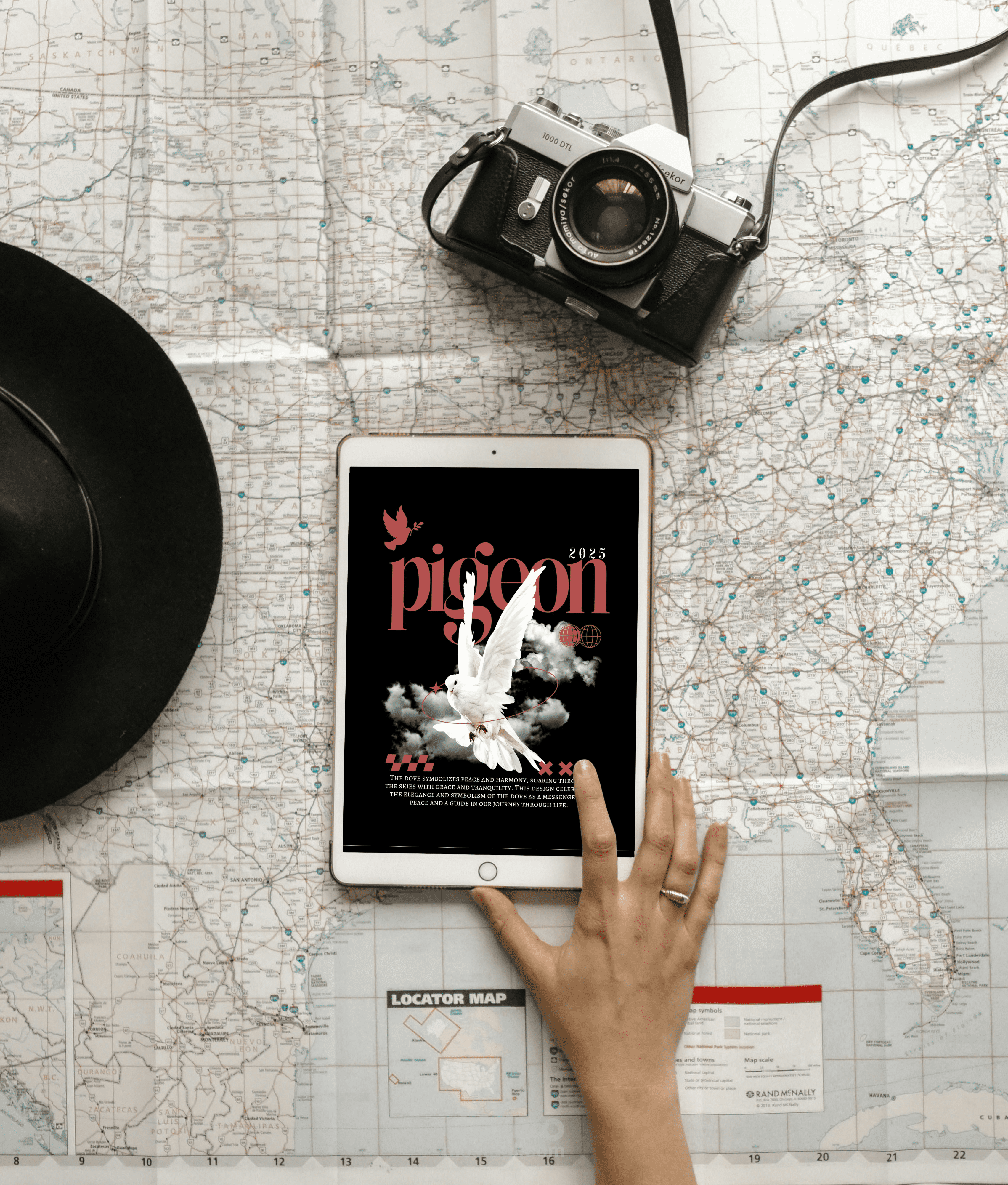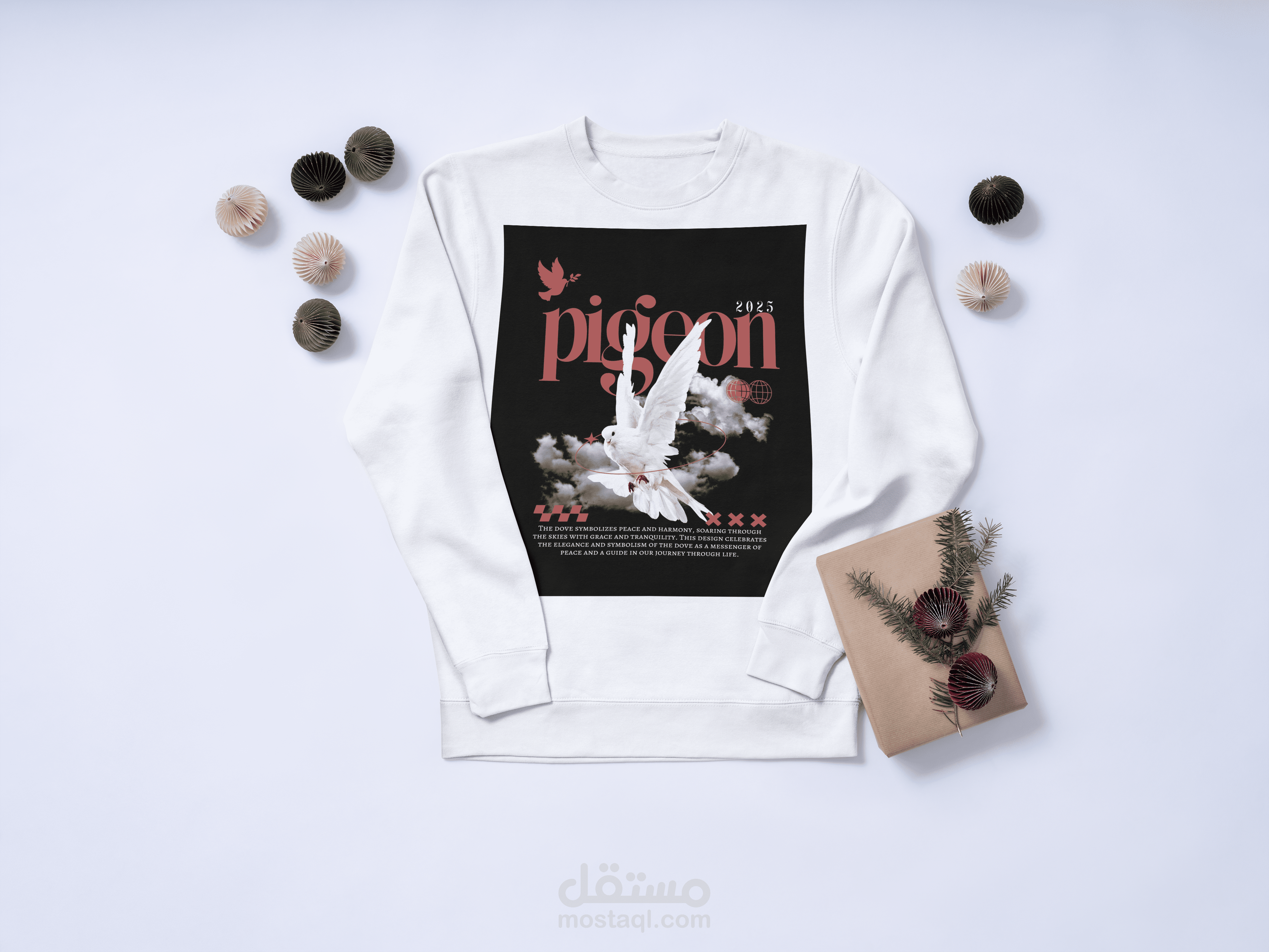 تصميم بصري يجمع بين الأناقة والرمزية؛ الحمامة تمثل السلام والسكينة، في تكوين جرافيكي حديث يدمج عناصر الغيوم بأسلوب فني متوازن. التصميم مناسب للاستخدام على التيشيرتات، البوسترات، أو كهوية بصرية لعلامة أزياء عصرية.