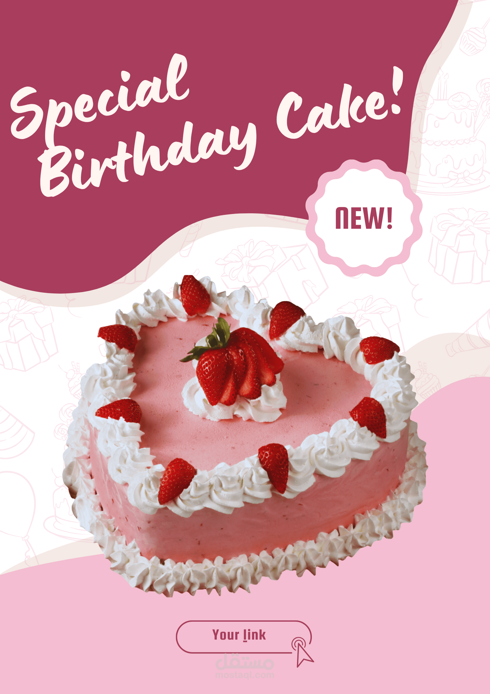 تصميم بوست إعلان كيكة يوم ميلاد بلون زهري ناعم.