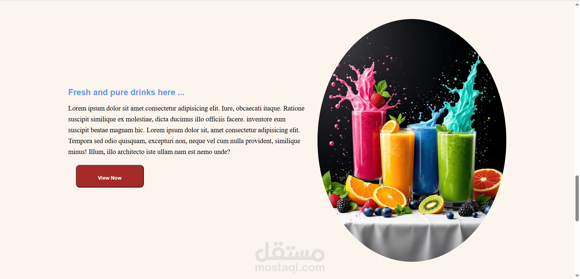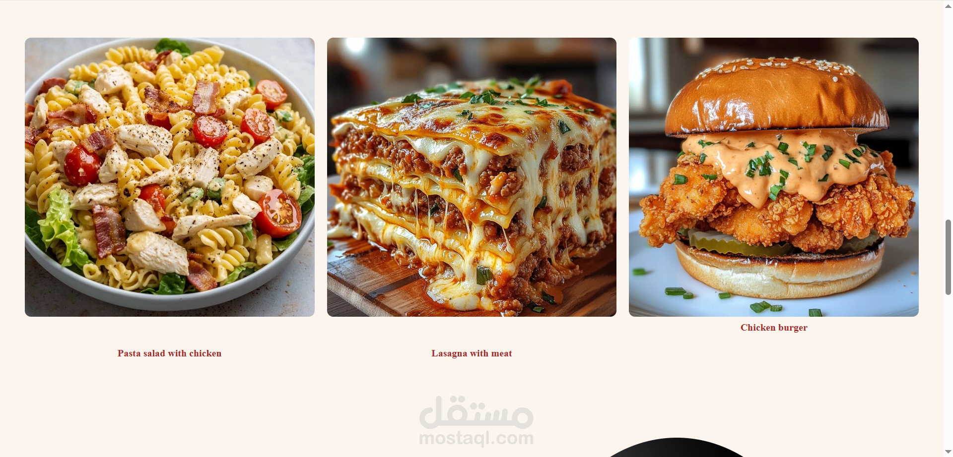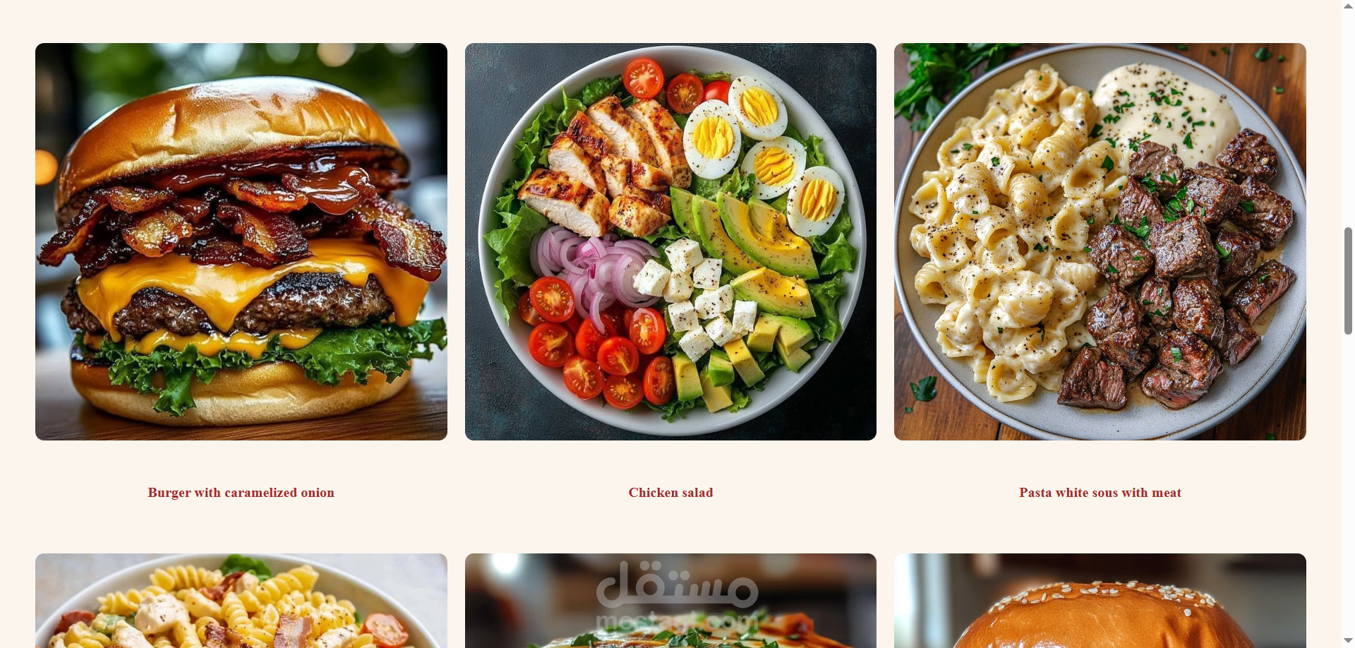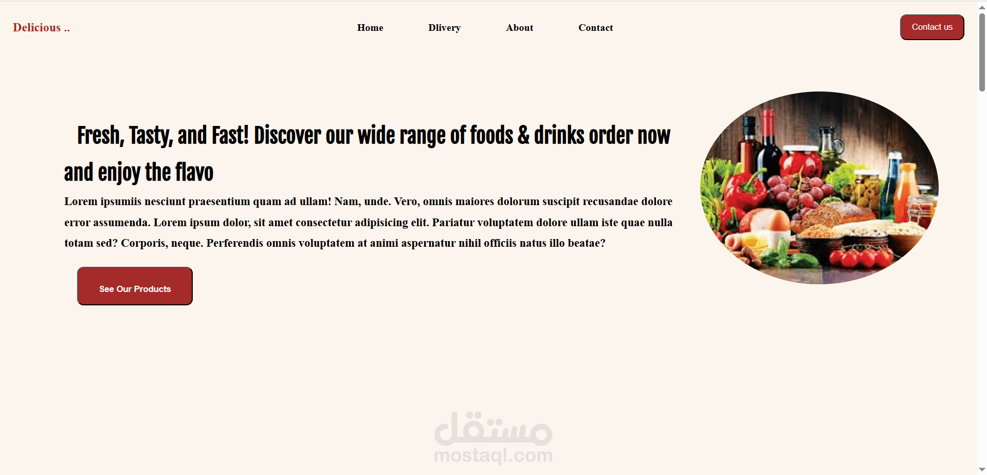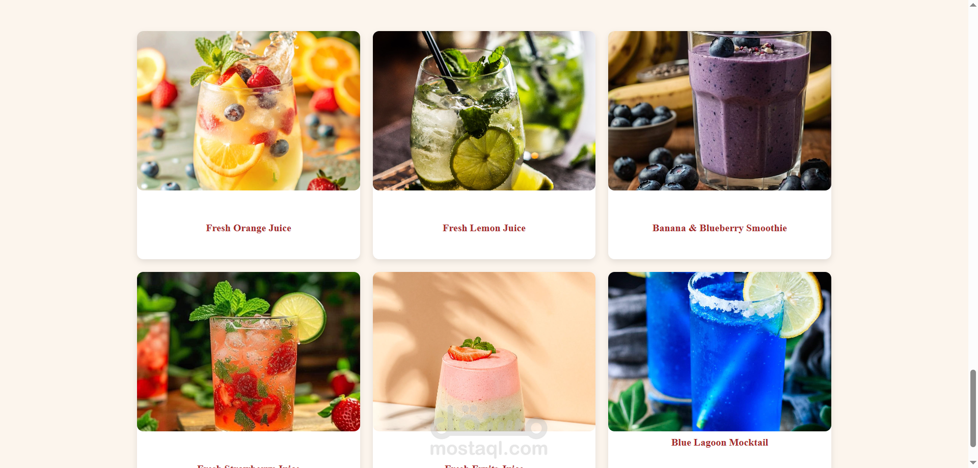 موقع بسيط لعرض المأكولات والمشروبات تم تصميمه باستخدام HTML و CSS فقط، مع الاعتماد على أبسط الخصائص في CSS لبناء تصميم أنيق وسهل التصفح.