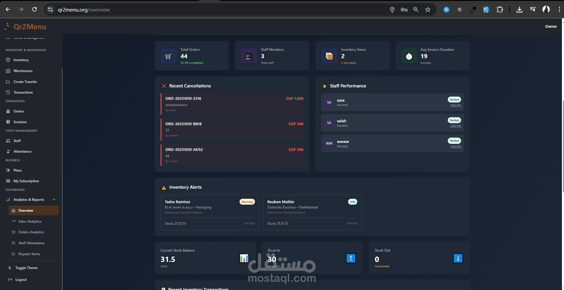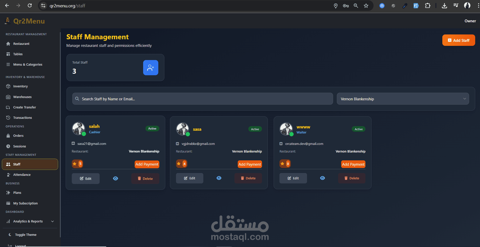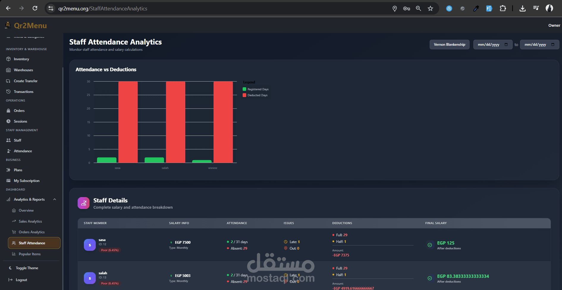 The system also includes a QR-based staff attendance system, where employees scan in/out to track working hours, automatically generating monthly attendance reports for the restaurant owner.