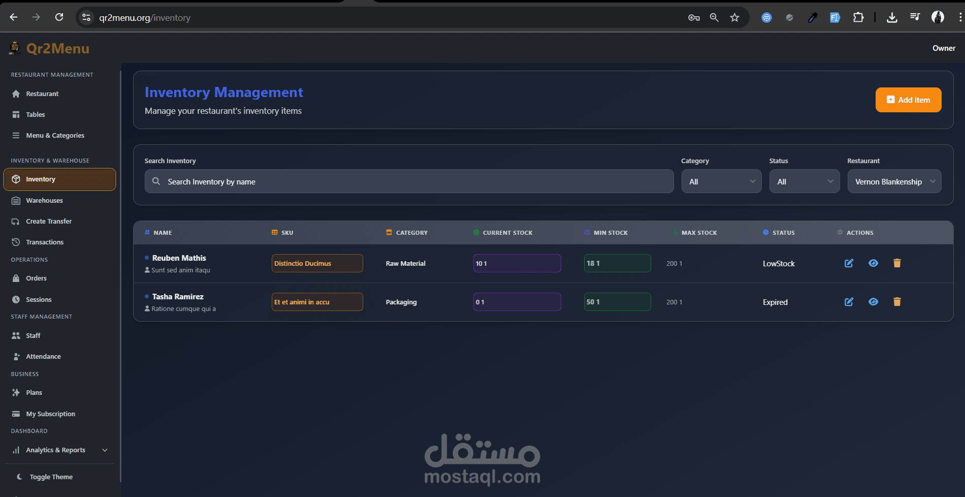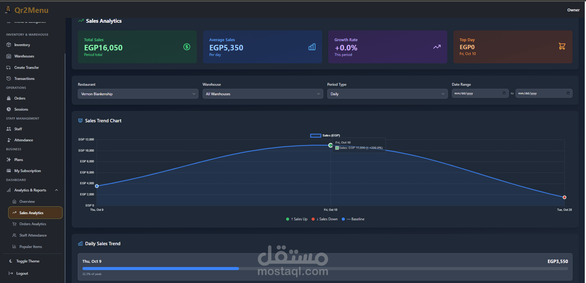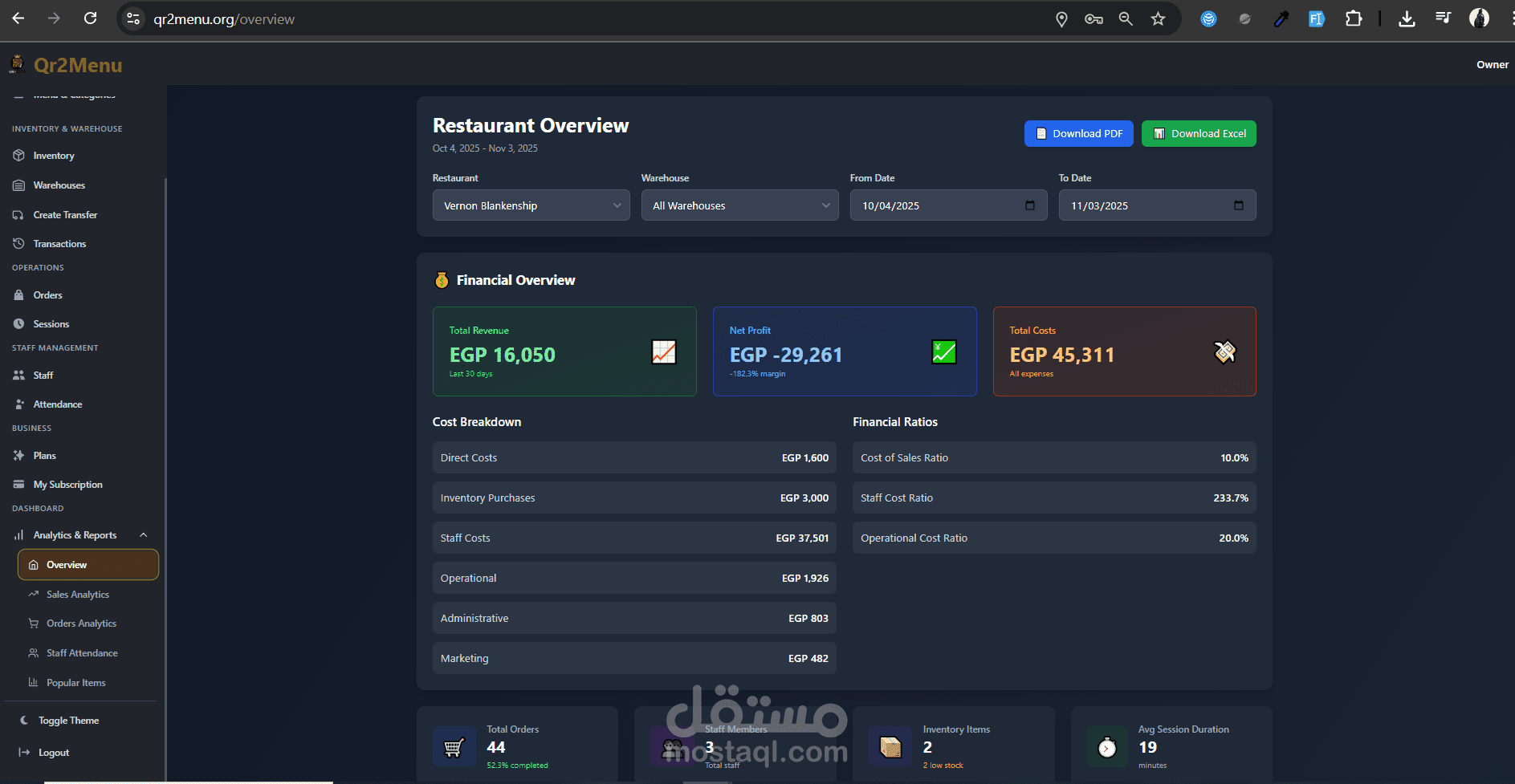 The system also includes a QR-based staff attendance system, where employees scan in/out to track working hours, automatically generating monthly attendance reports for the restaurant owner.