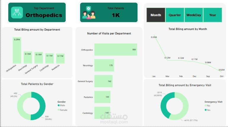 حسب القسم (Billing by Department): يُظهر أن جراحة العظام (Orthopedics) هي الأعلى في مبالغ الفواتير (0.29M) وفي عدد الزيارات (380 زيارة).