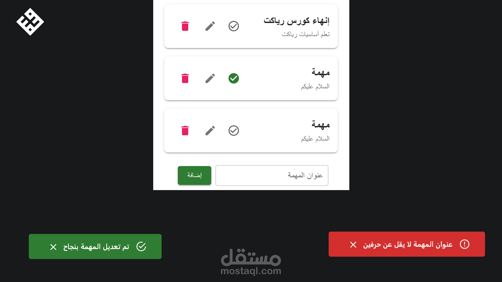 - إدارة كاملة للمهام (إنشاء – عرض – تعديل – حذف)