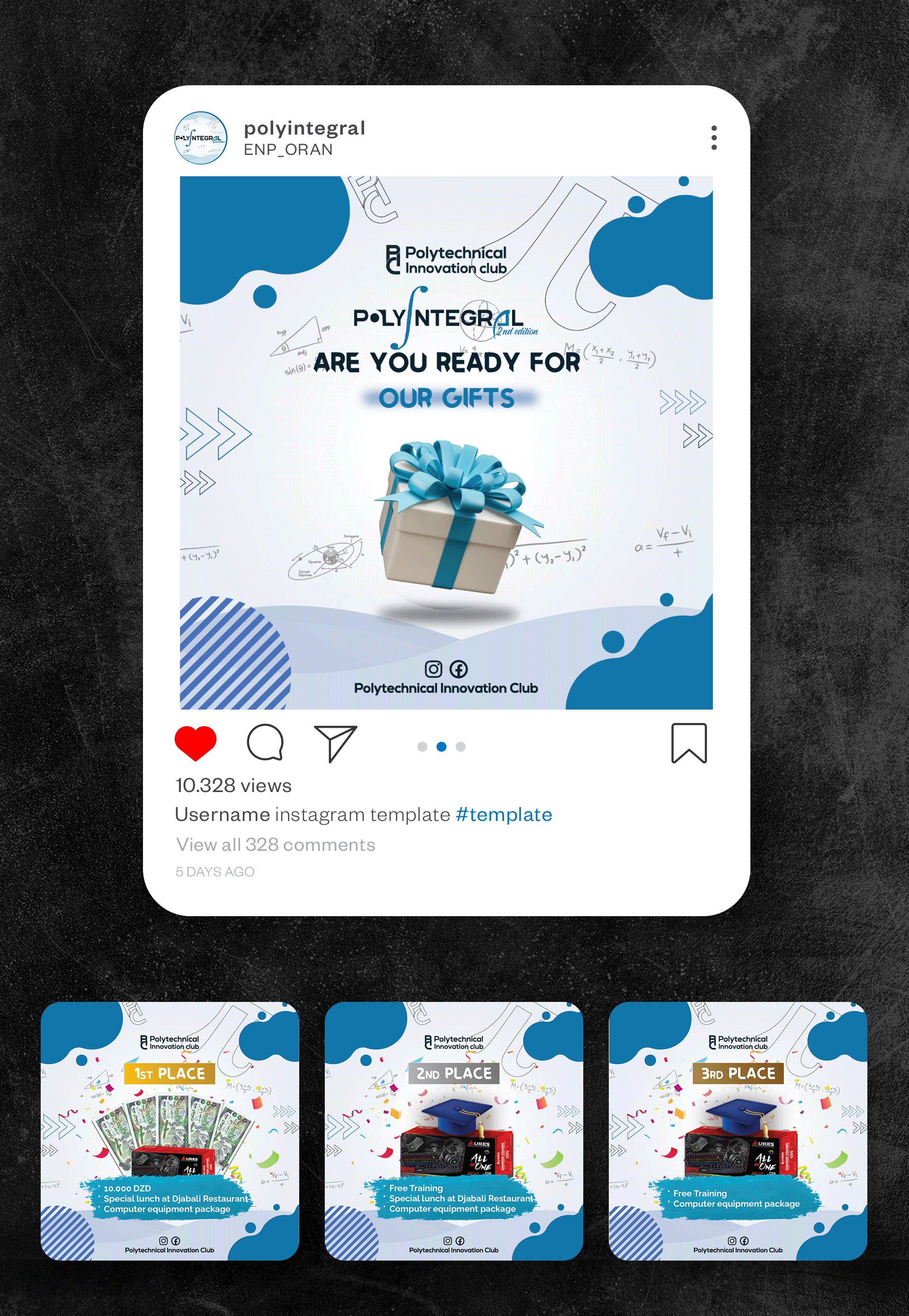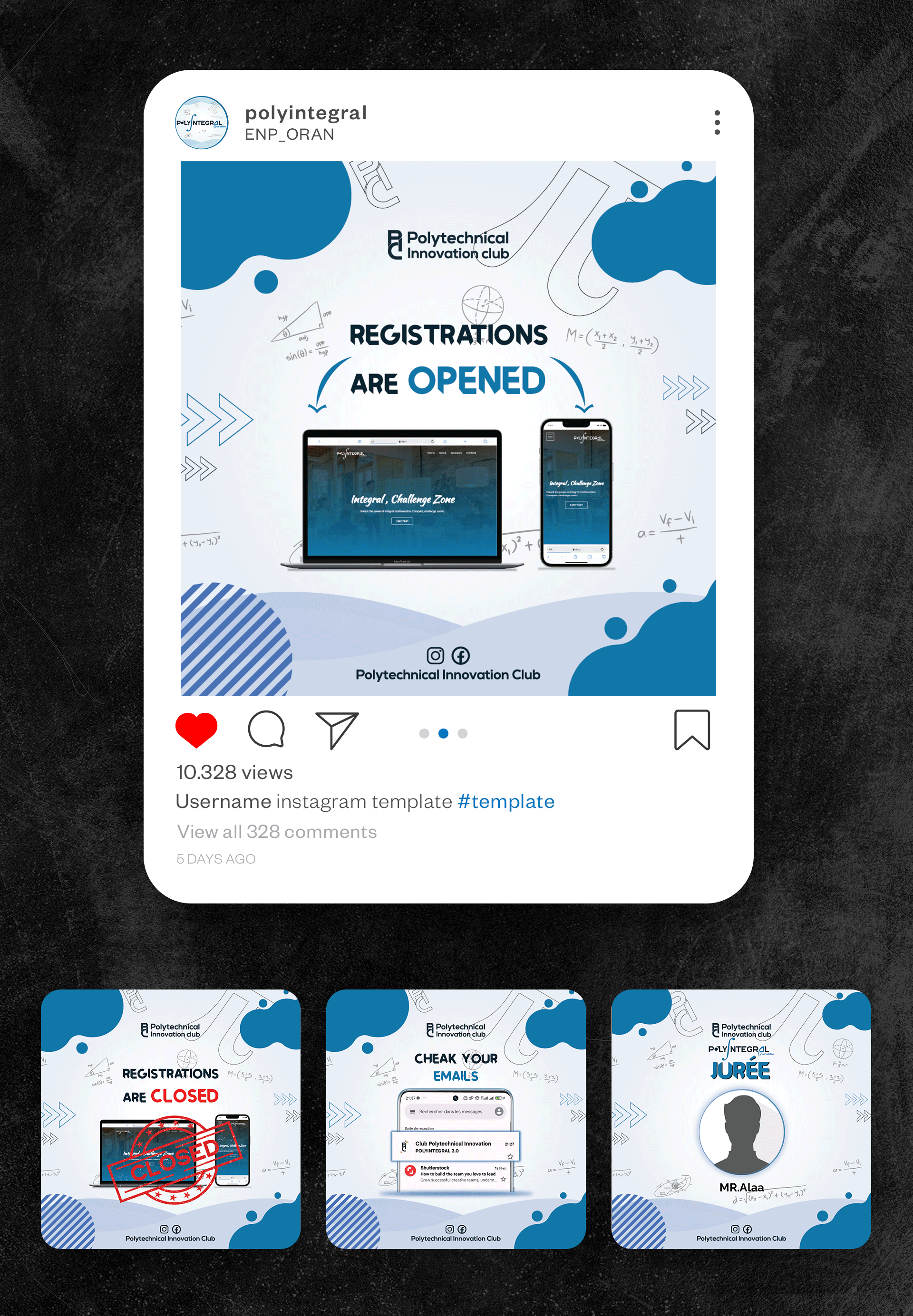 تصميم مجموعة من المنشورات البصرية الخاصة بمسابقة Polyintegral التي نظمها نادي الابتكار بالمدرسة الوطنية المتعددة التقنيات.