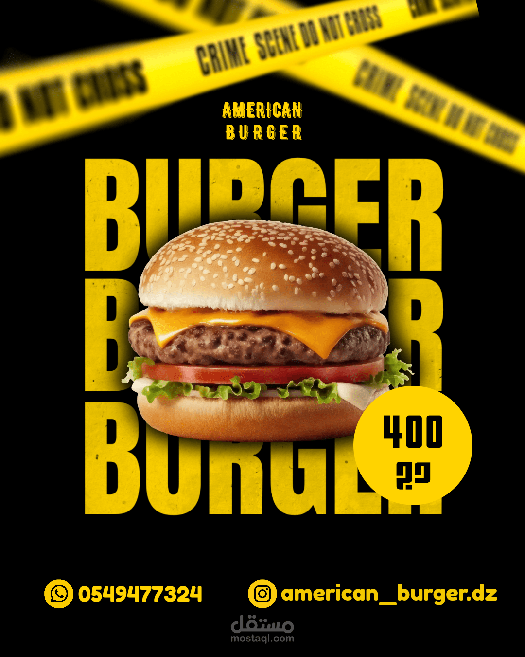 A bold promotional poster for American Burger, designed to grab attention and express the idea that this burger is a “crime of taste.”