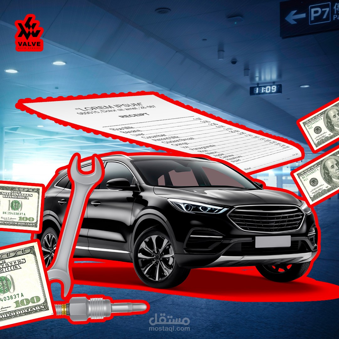 التصميم بيضم سيارة في المقدمة مع عناصر رمزية زي النقود الطايرة في الخلفية (مع تأثير Blur لإضافة عمق وحركة)، وفاتورة وأدوات صيانة في المقدمة بتعبّر عن الخدمة بشكل مباشر.