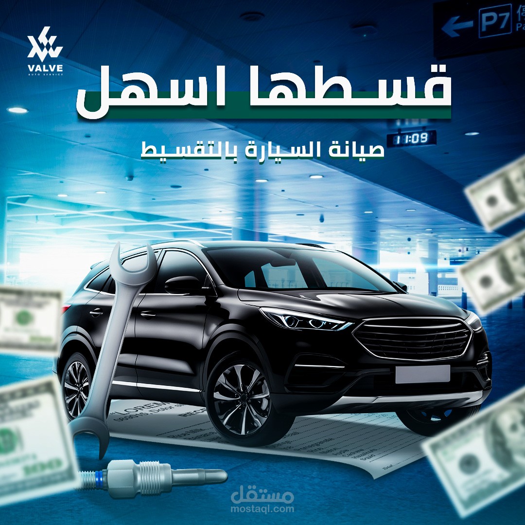 تصميم إعلان ترويجي لخدمة تقسيط صيانة السيارات، بهدف جذب العملاء بطريقة عصرية وبصرية قوية.