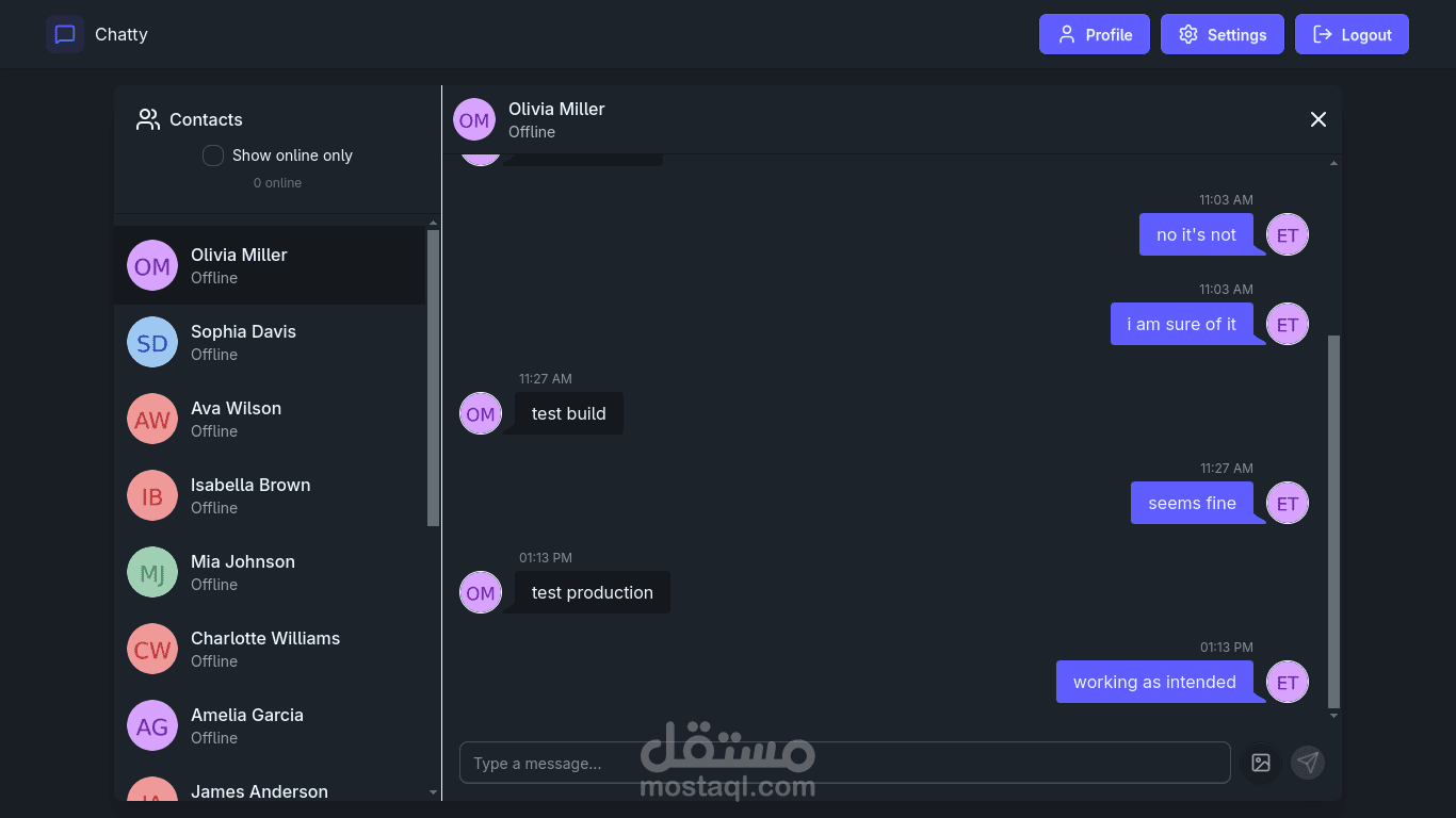 طبيق محادثة فورِي (في الوقت الفعلي) مبني باستخدام React، و TailwindCSS، و Node.js، و Express، و MongoDB، و Socket.io. يحتوي على مصادقة (Authentication) وإدارة حسابات، ويعرض حالة المستخدمين سواء كانوا متصلين (Online) أو غير متصلين (Offline).