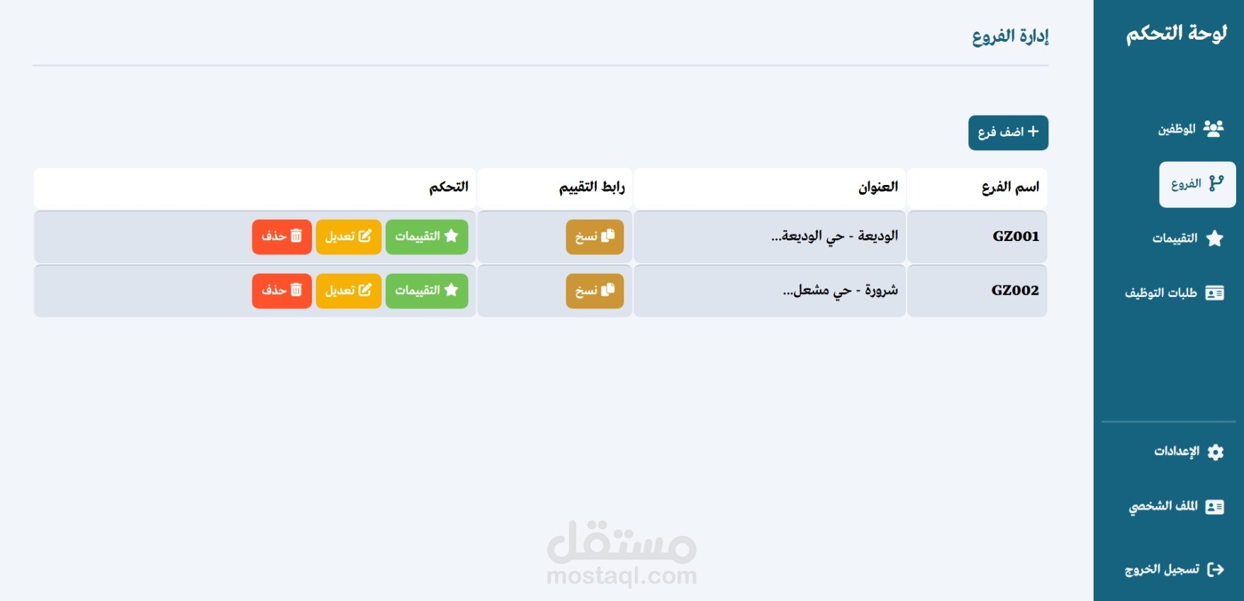 × قسم لإدارة الفروع مع إمكانية إضافة وتعديل بيانات كل فرع.