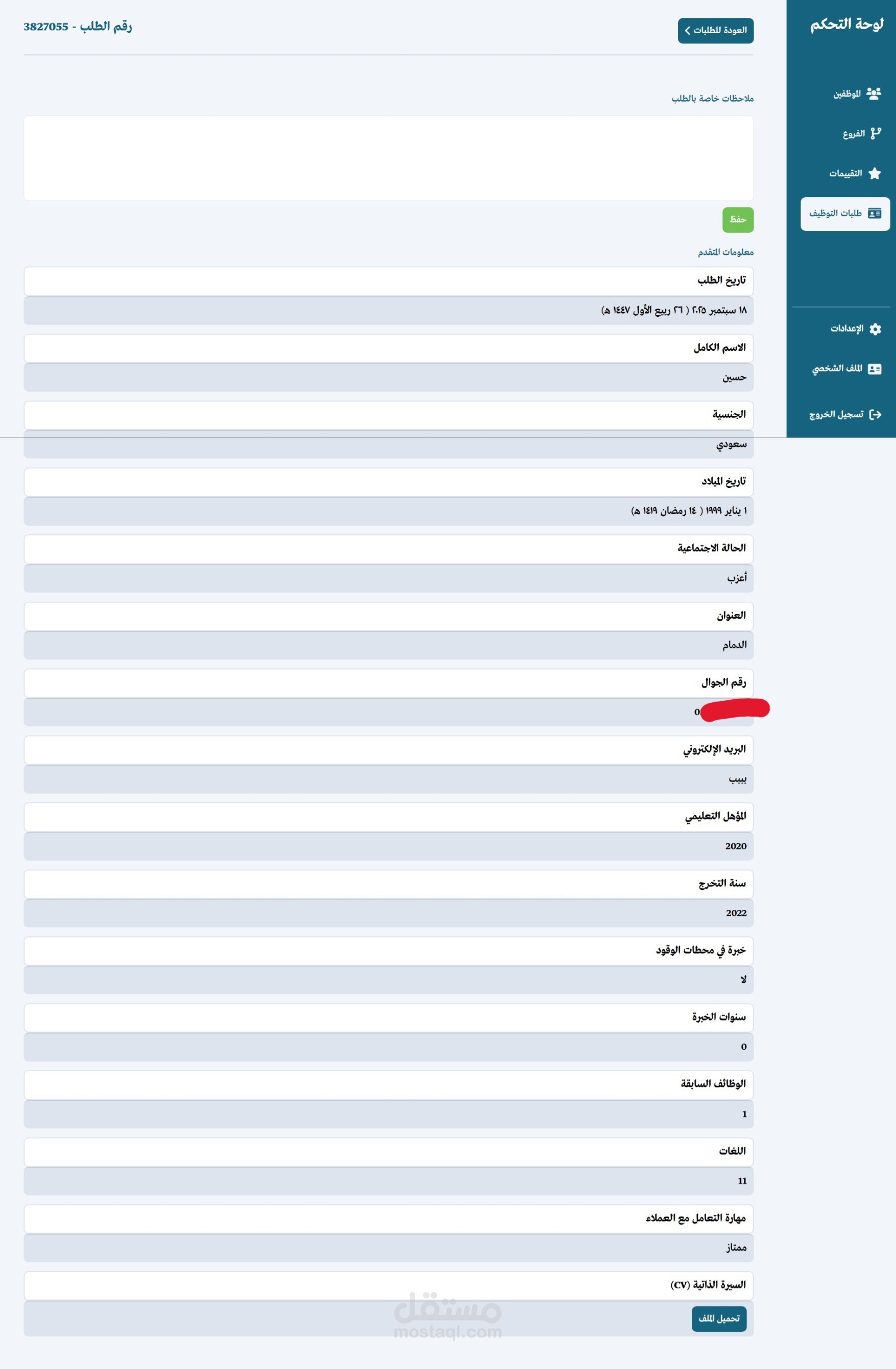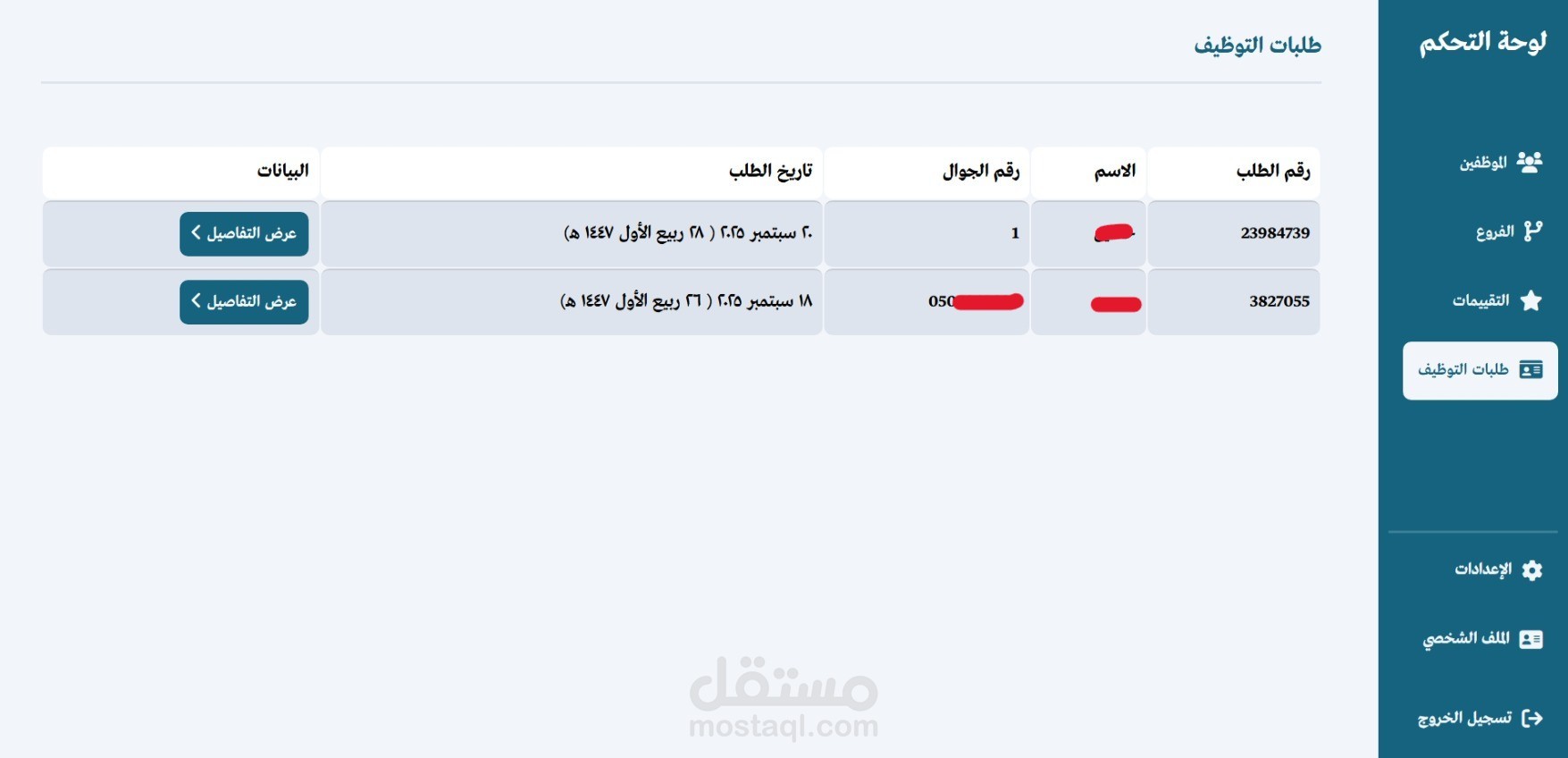 × نظام كامل لإدارة طلبات التوظيف وعرض بيانات المتقدمين بشكل منظم.