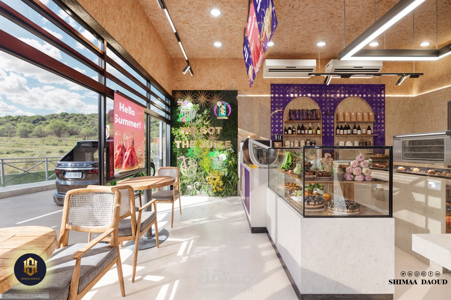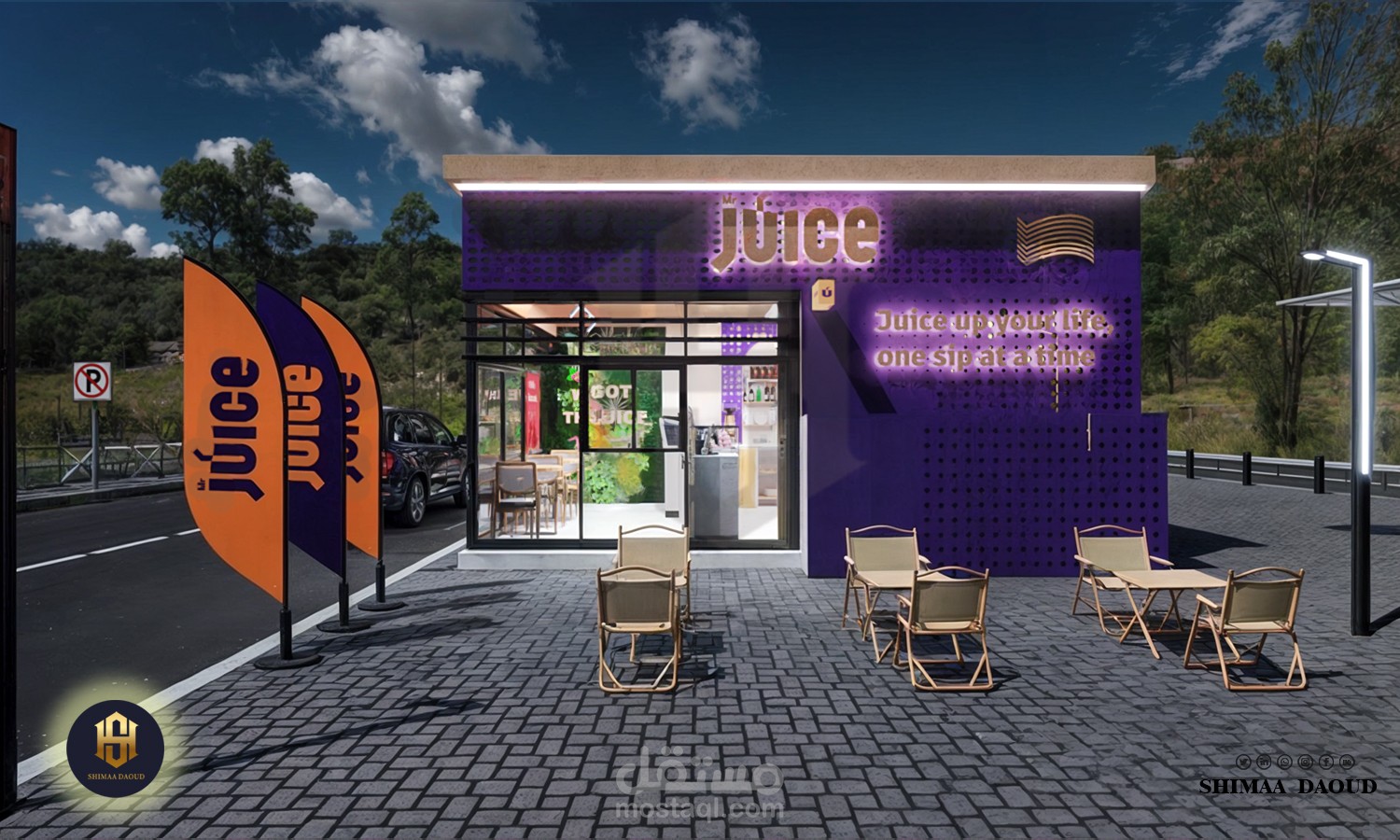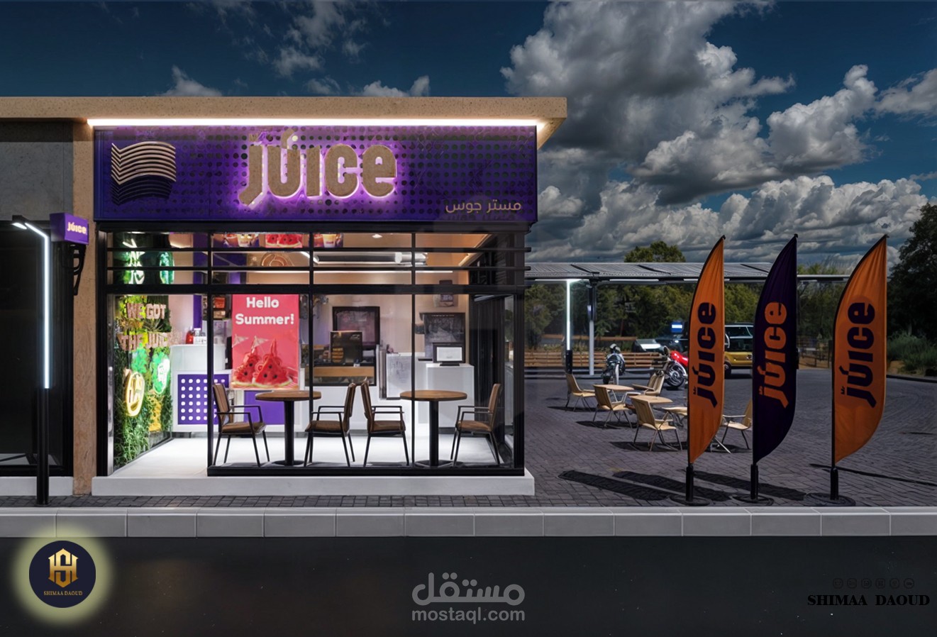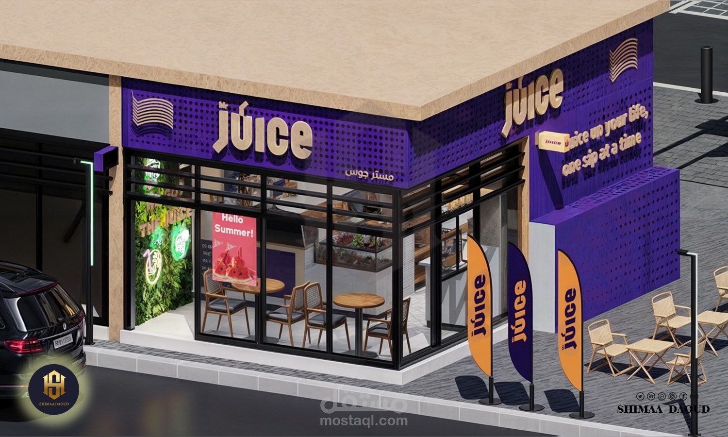 يُجسّد تصميم محل العصائر العصري هذا أجواءً نابضةً بالحيوية والنشاط، وهو مثاليٌّ لمن يبحثون عن استراحةٍ منعشة. تجذب لوحة الألوان الجريئة البنفسجي والبرتقالي الأنظار، مُجسّدةً المنتجات الطازجة والحيوية المُقدّمة في الداخل. تتميز العلامة التجارية بطابعها العصري والواضح، حيث تُعرض لافتة "مستر جوس" بفخرٍ بتقنية ثلاثية الأبعاد، مما يُسهّل تمييزها عن بُعد.