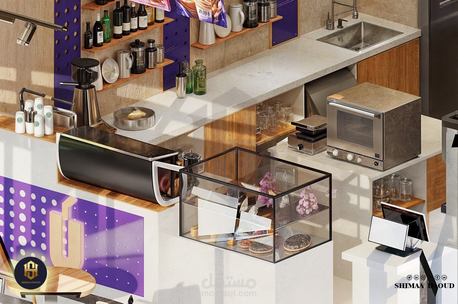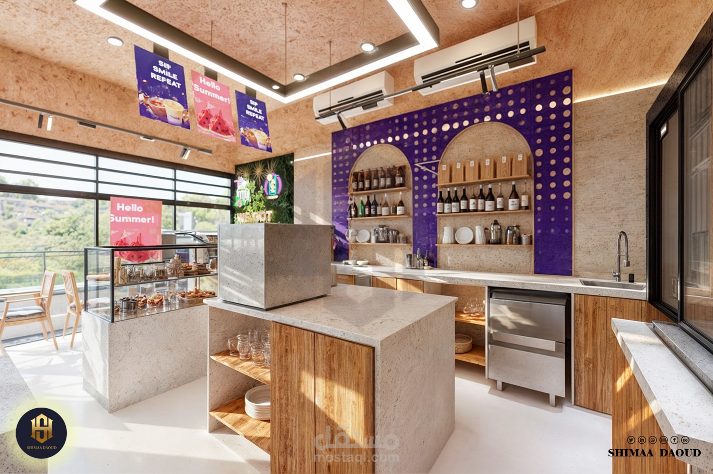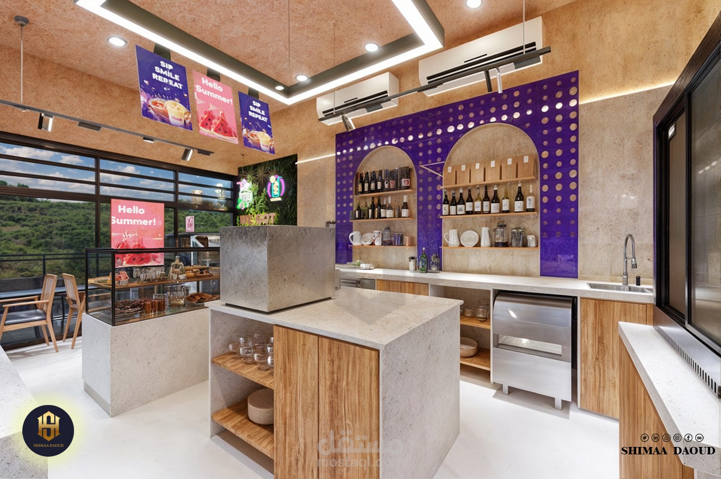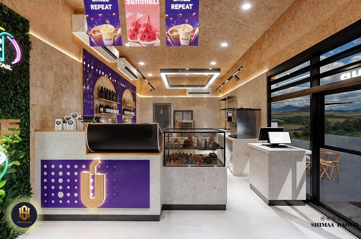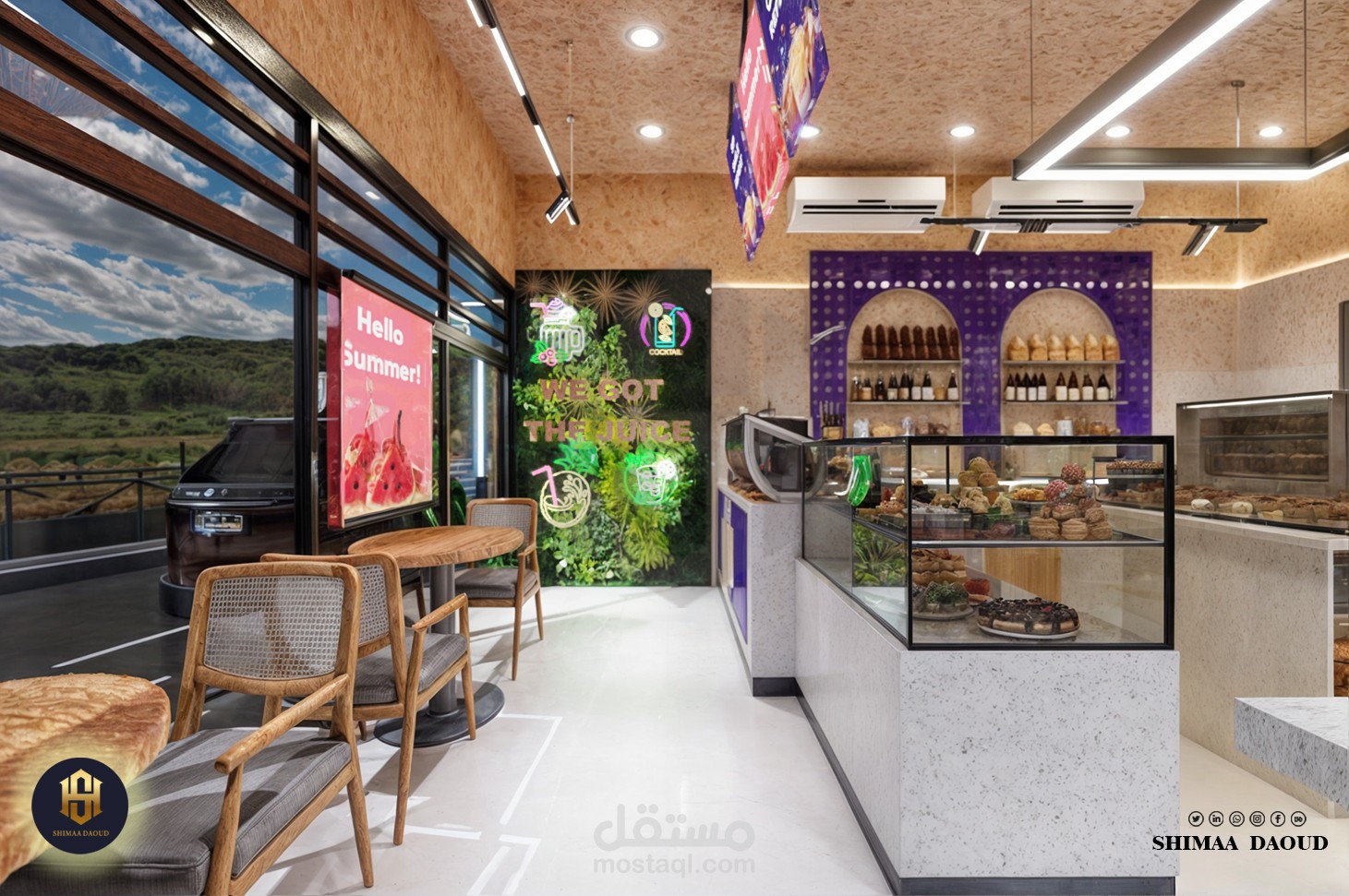 يُجسّد تصميم محل العصائر العصري هذا أجواءً نابضةً بالحيوية والنشاط، وهو مثاليٌّ لمن يبحثون عن استراحةٍ منعشة. تجذب لوحة الألوان الجريئة البنفسجي والبرتقالي الأنظار، مُجسّدةً المنتجات الطازجة والحيوية المُقدّمة في الداخل. تتميز العلامة التجارية بطابعها العصري والواضح، حيث تُعرض لافتة "مستر جوس" بفخرٍ بتقنية ثلاثية الأبعاد، مما يُسهّل تمييزها عن بُعد.