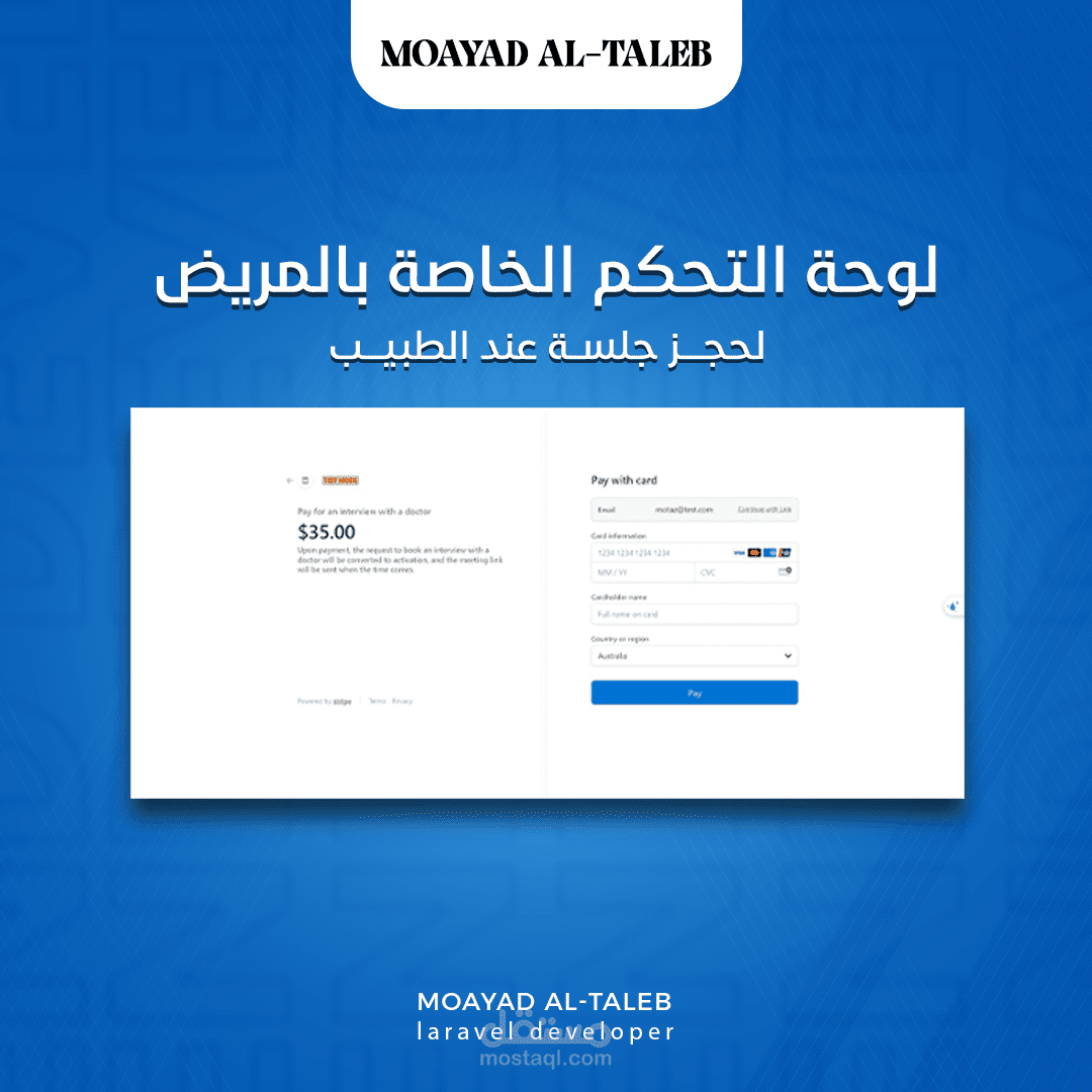 تم تحقيق الدفع الإلكتروني بواسطة Stripe وتحقيق اجتماعات بين الطبيب والمريض بواسطة Google Meet.