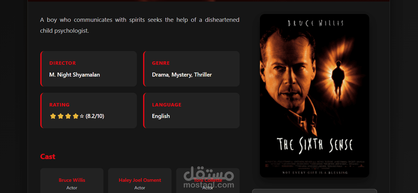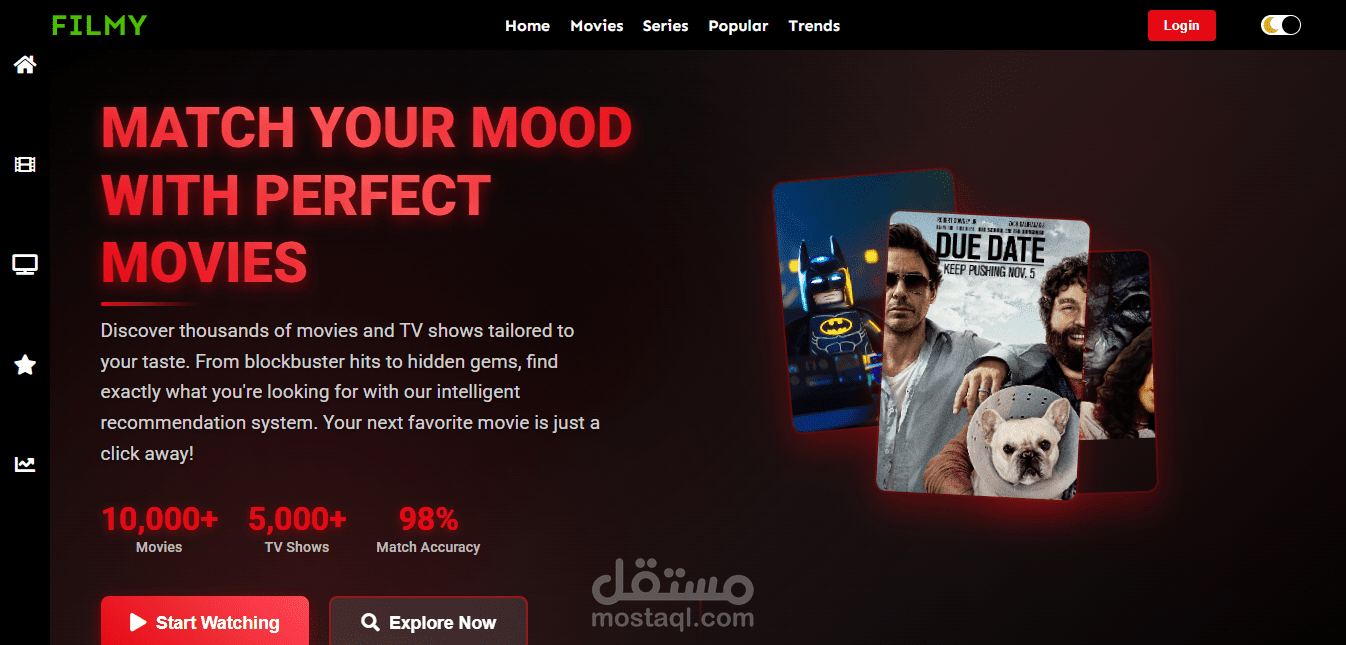 مشروع Filmy هو تطبيق ويب متكامل (Full Stack) يهدف إلى عرض معلومات حول الأفلام بطريقة بسيطة وجذابة. تم بناء الواجهة الأمامية باستخدام HTML، CSS، JavaScript، وBootstrap لتقديم تصميم متجاوب وسهل الاستخدام على مختلف الأجهزة. أما في الواجهة الخلفية فقد تم استخدام Node.js لمعالجة الطلبات وربط صفحات الموقع بالبيانات. يتيح المشروع للمستخدم استعراض الأفلام، مشاهدة تفاصيل كل فيلم مثل الصورة والوصف والتصنيف، والتنقل بين الصفحات بسهولة بفضل تنظيم الواجهة وتدفق المعلومات بشكل واضح.