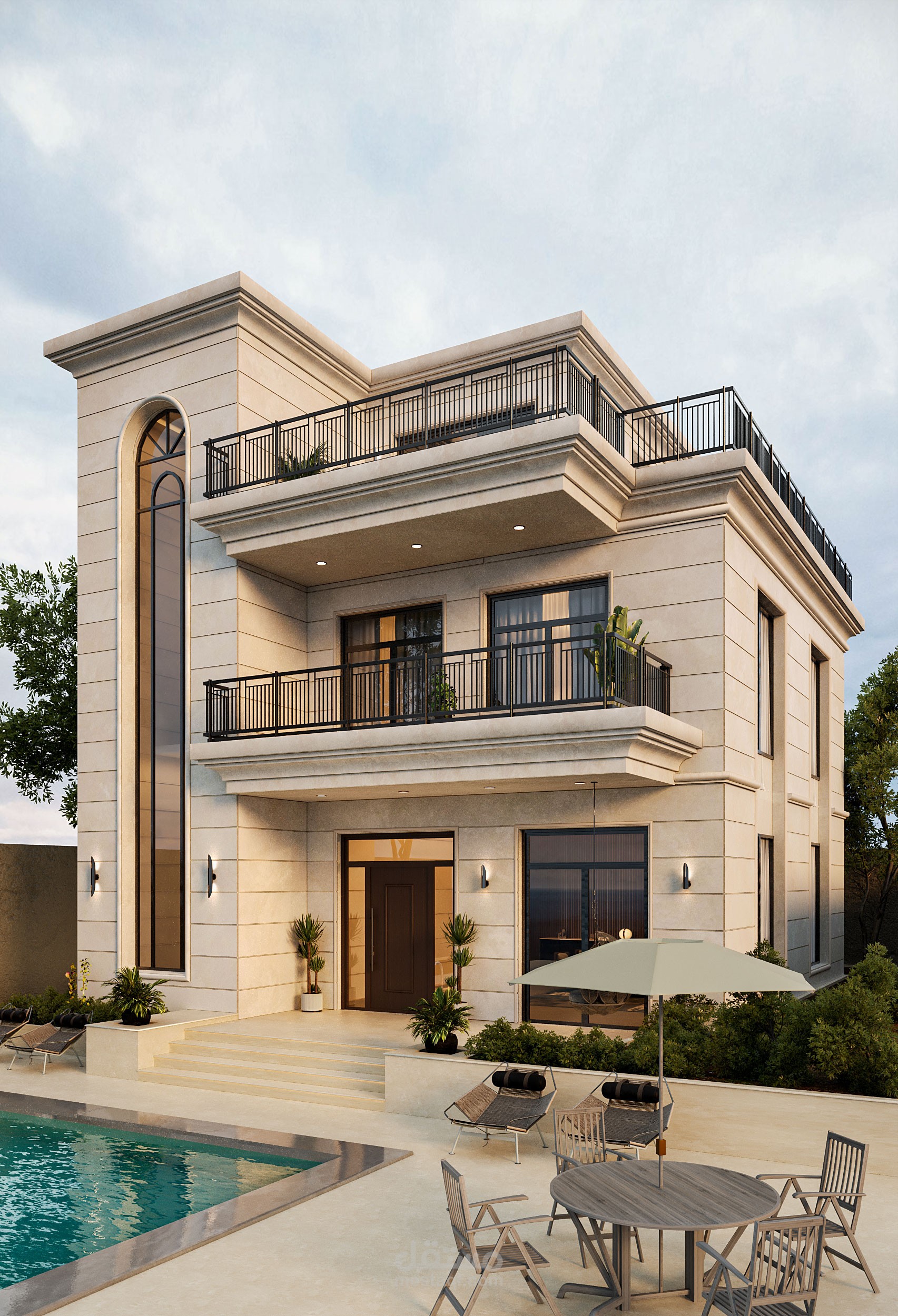A Neo-Classical façade in Damascus city that blends elegance and simplicity — featuring light stone cladding, sleek black metal accents, and a refined poolside view that perfectly balances modern luxury with timeless charm.