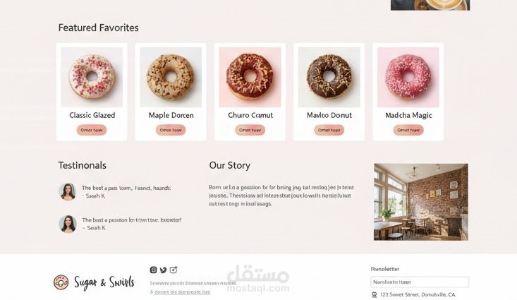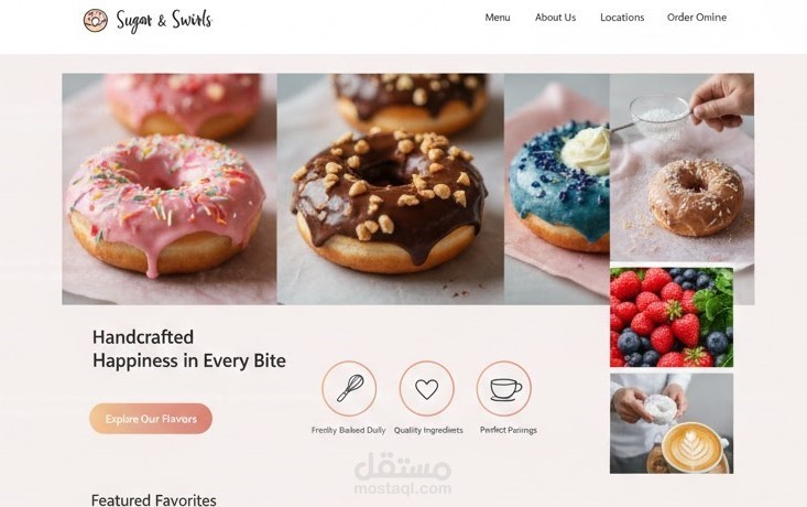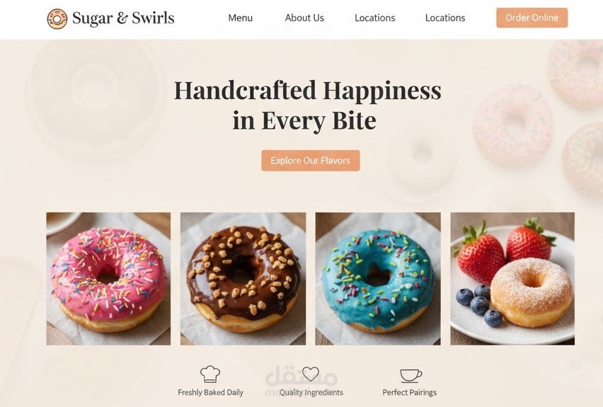موقع Sugar & Swirls هو صفحة هبوط (Landing Page) ترويجية لمتجر دونات يهدف إلى جذب العملاء الجدد لطلب المنتجات عبر الإنترنت.