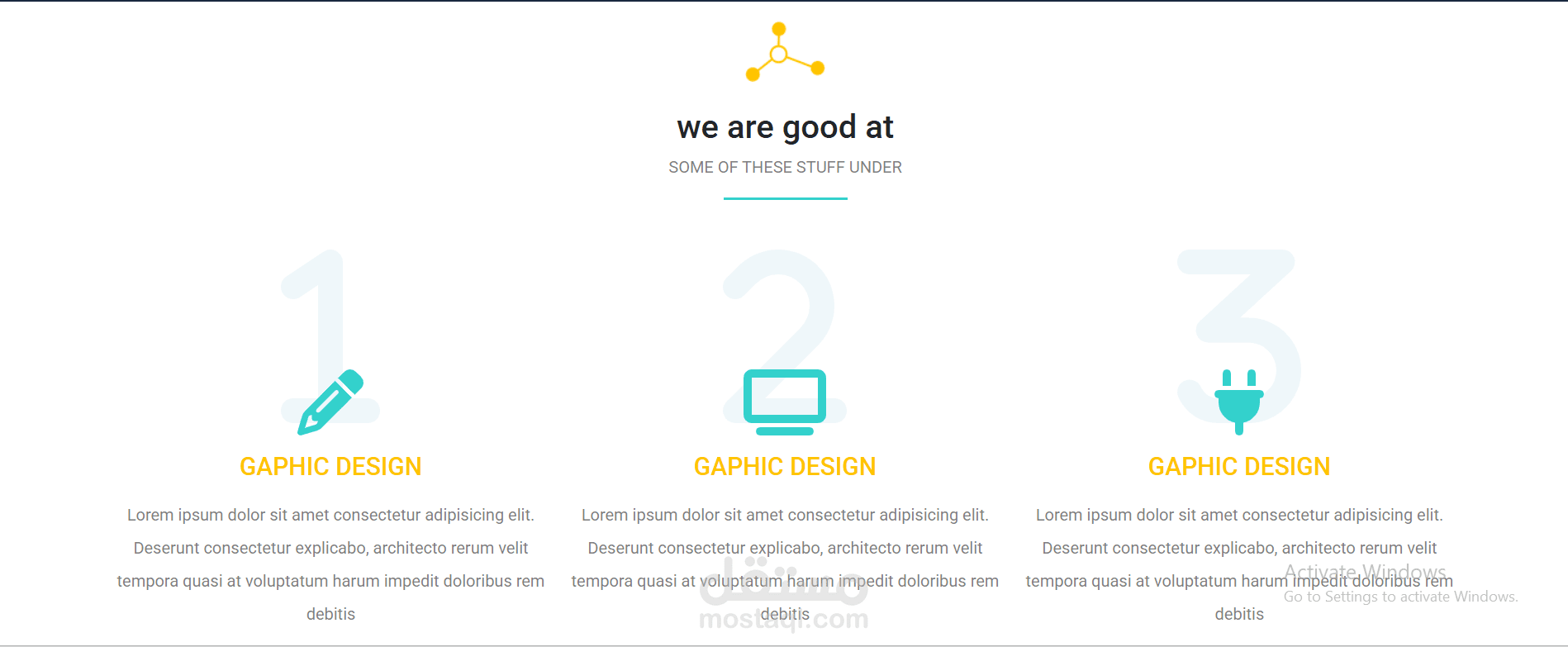 قسم الخدمات (Services): تصميم "مينيماليست" (بسيط أوي) بيعرض الخدمات بأيقونات وأرقام مميزة.