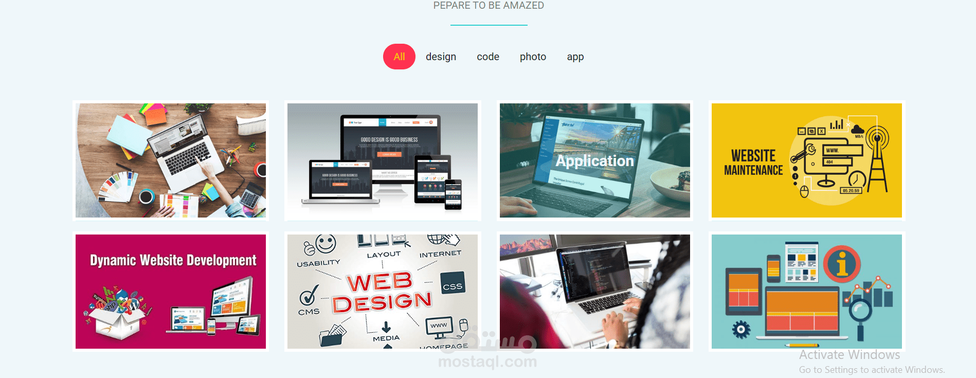 معرض الأعمال (Portfolio): قسم كامل لعرض الشغل القديم، وفيه "فلاتر" عشان الزاير يختار هو عاوز يشوف إيه (تصميمات، برمجة، صور، ...إلخ).