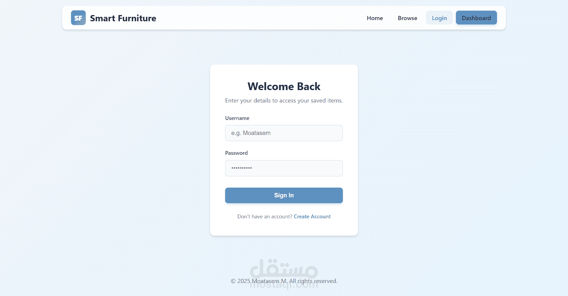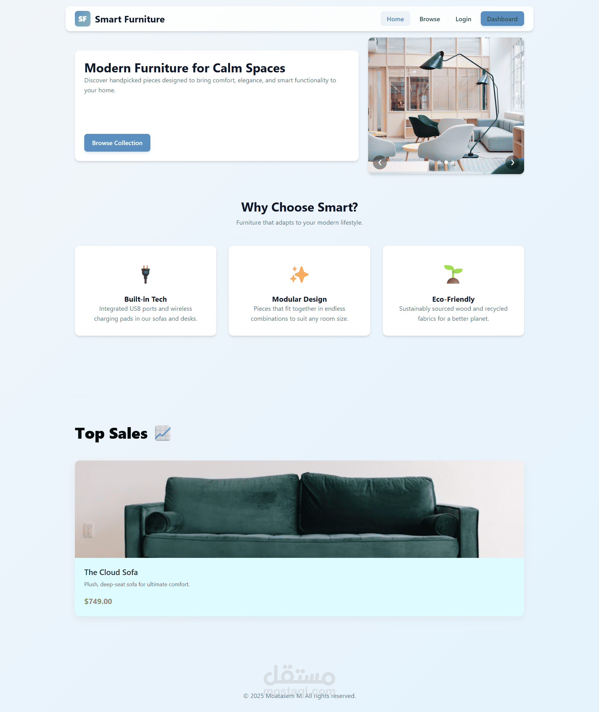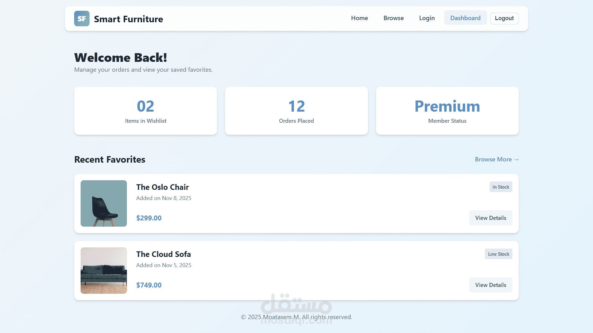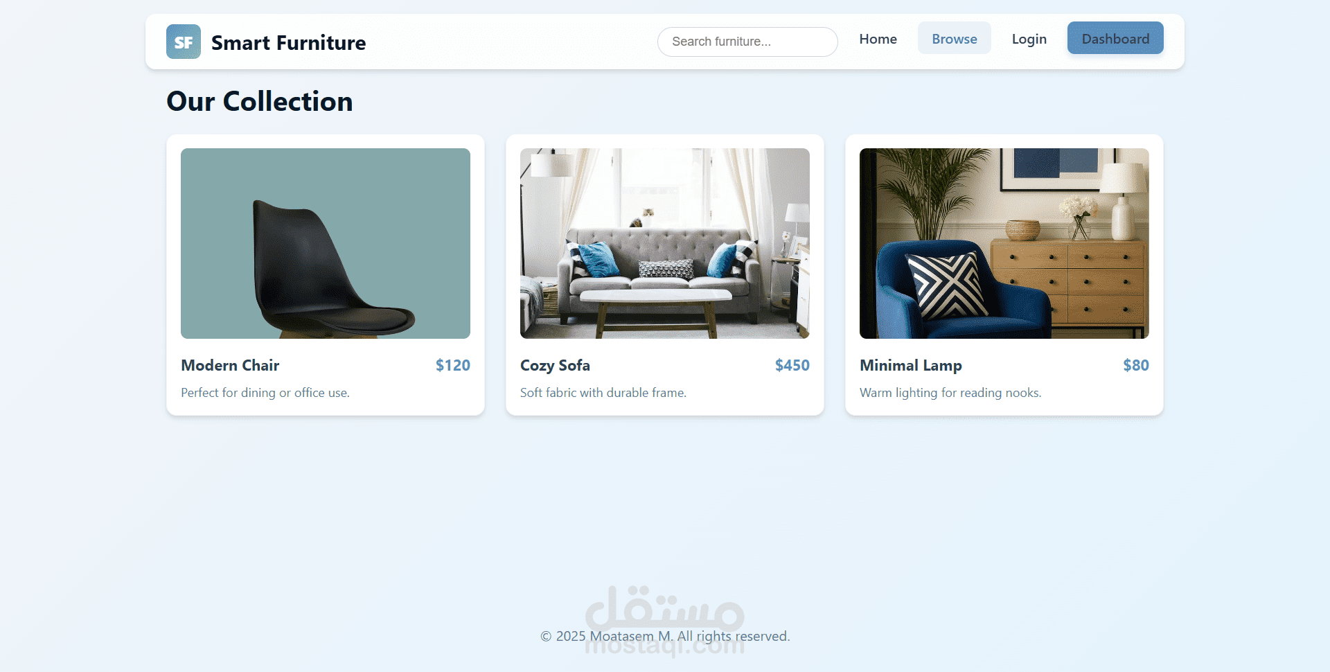 هذا المشروع عبارة عن موقع إلكتروني بسيط لبيع الأثاث العصري، يهدف إلى عرض المنتجات وإتاحة تجربة تصفح وتسجيل دخول للمستخدمين.