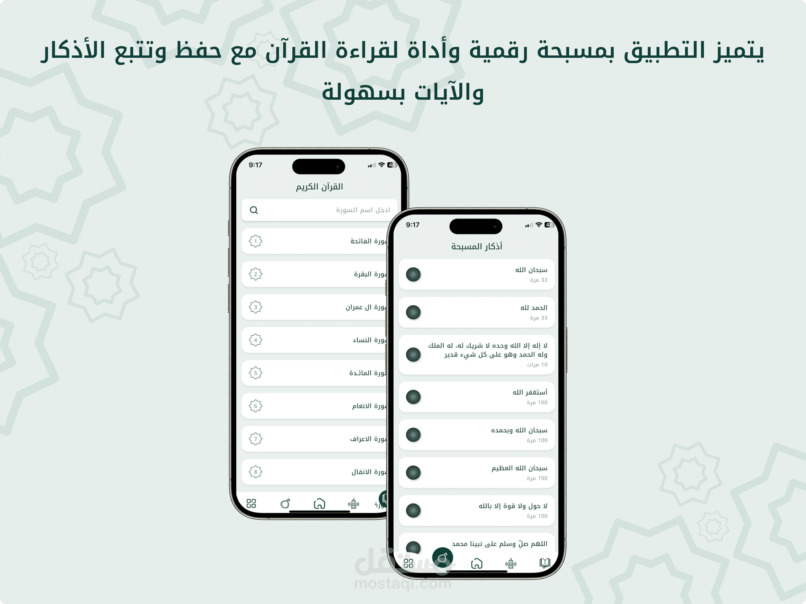 - عداد رقمي مدمج لمساعدة المستخدم في التسبيح والذكر بسهولة.