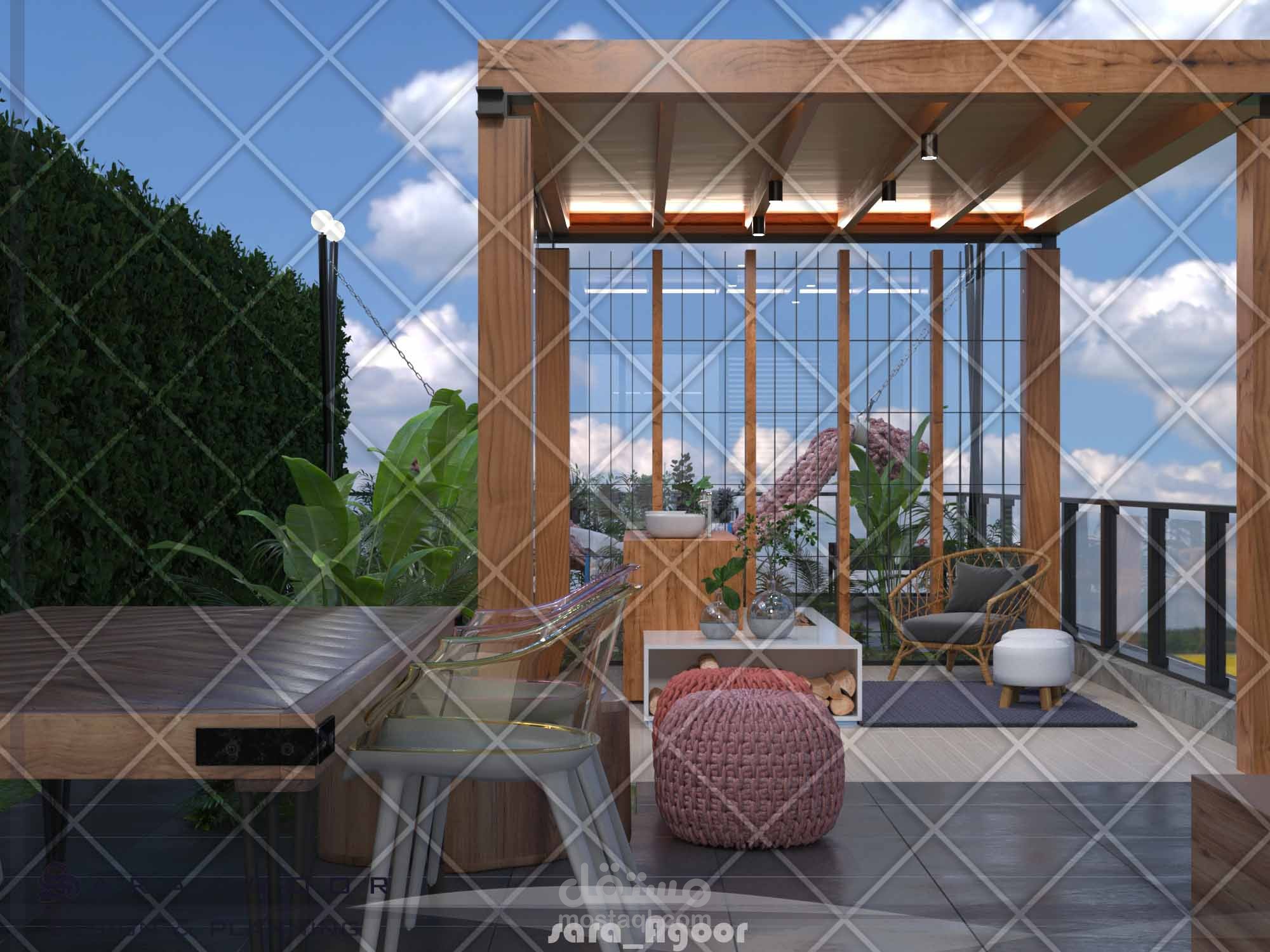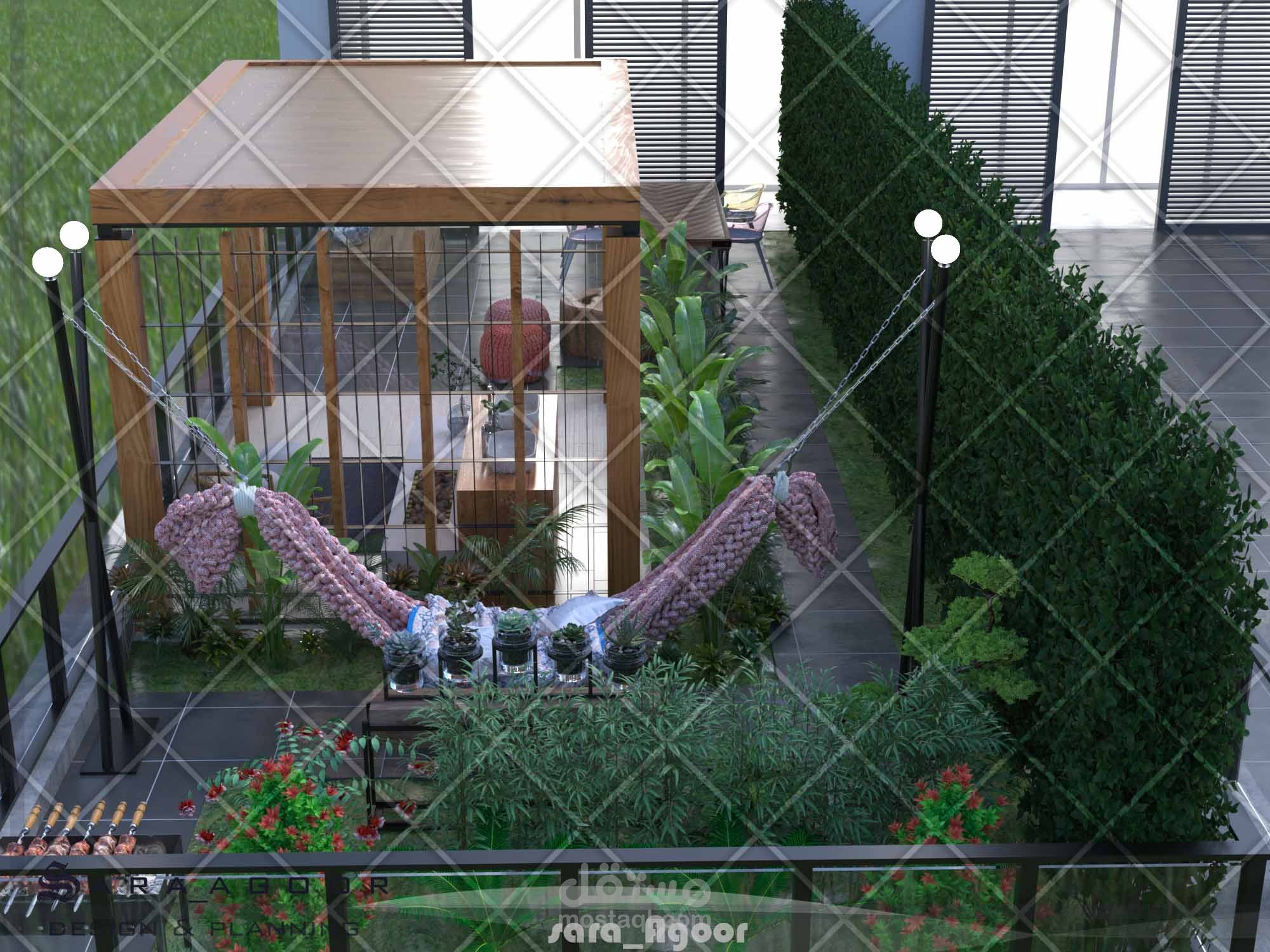 العمل عبارة عن تراس كبير ملحق بمنزل والعميل كان يريد ان يتم عمل ديزاين متنوع وبسيط كحديقة صغيرة ملحقة بالمنزل بحيث يكون جزء بها عبارة عن مساحة خضراء وجزء اخر مظلة مغطاة والثالث هارد سكيب