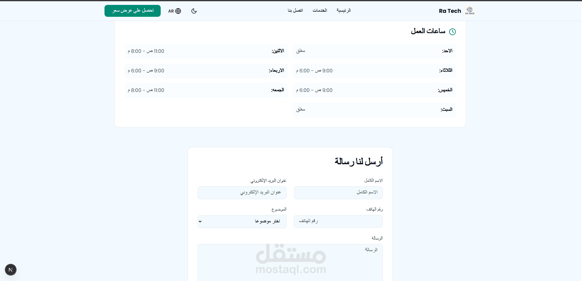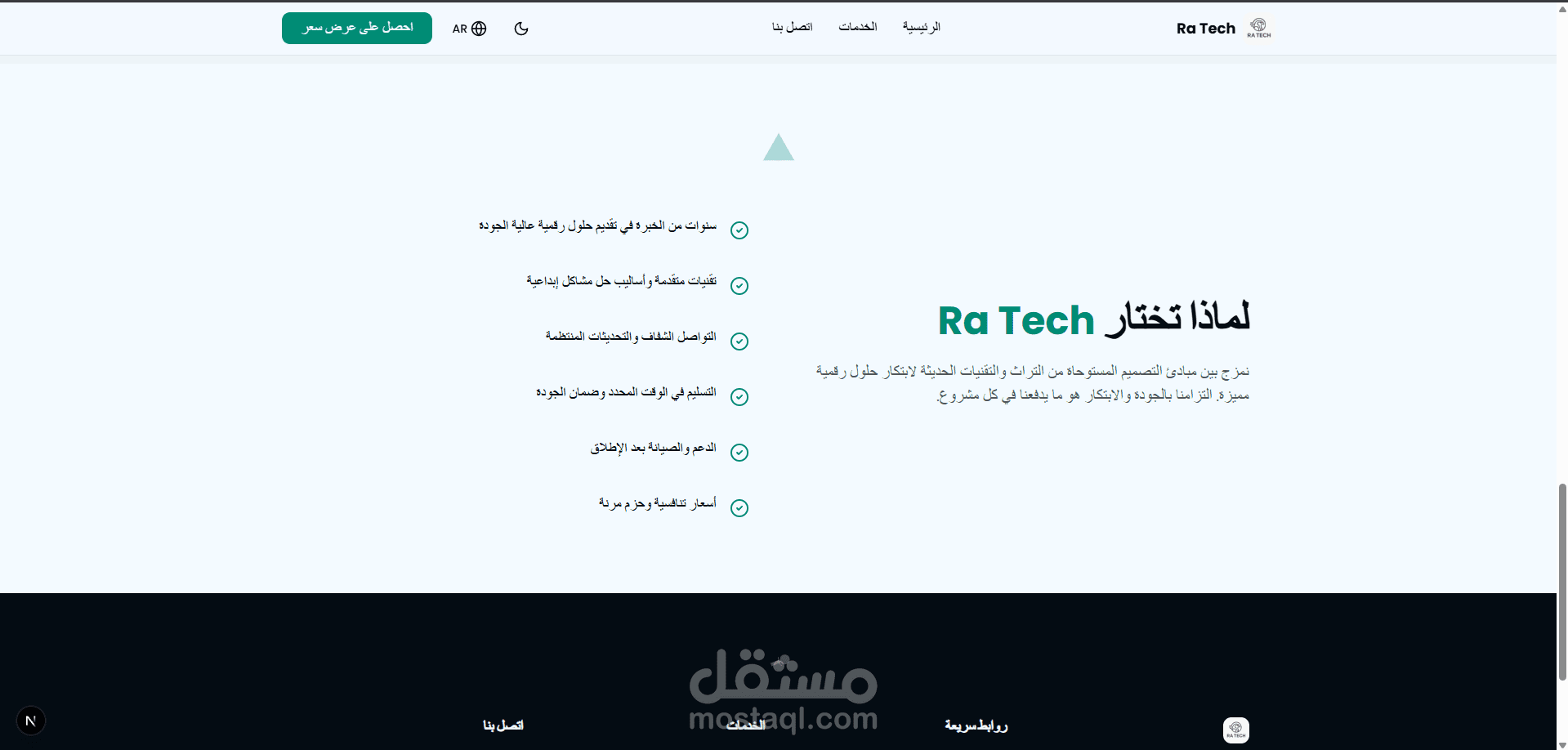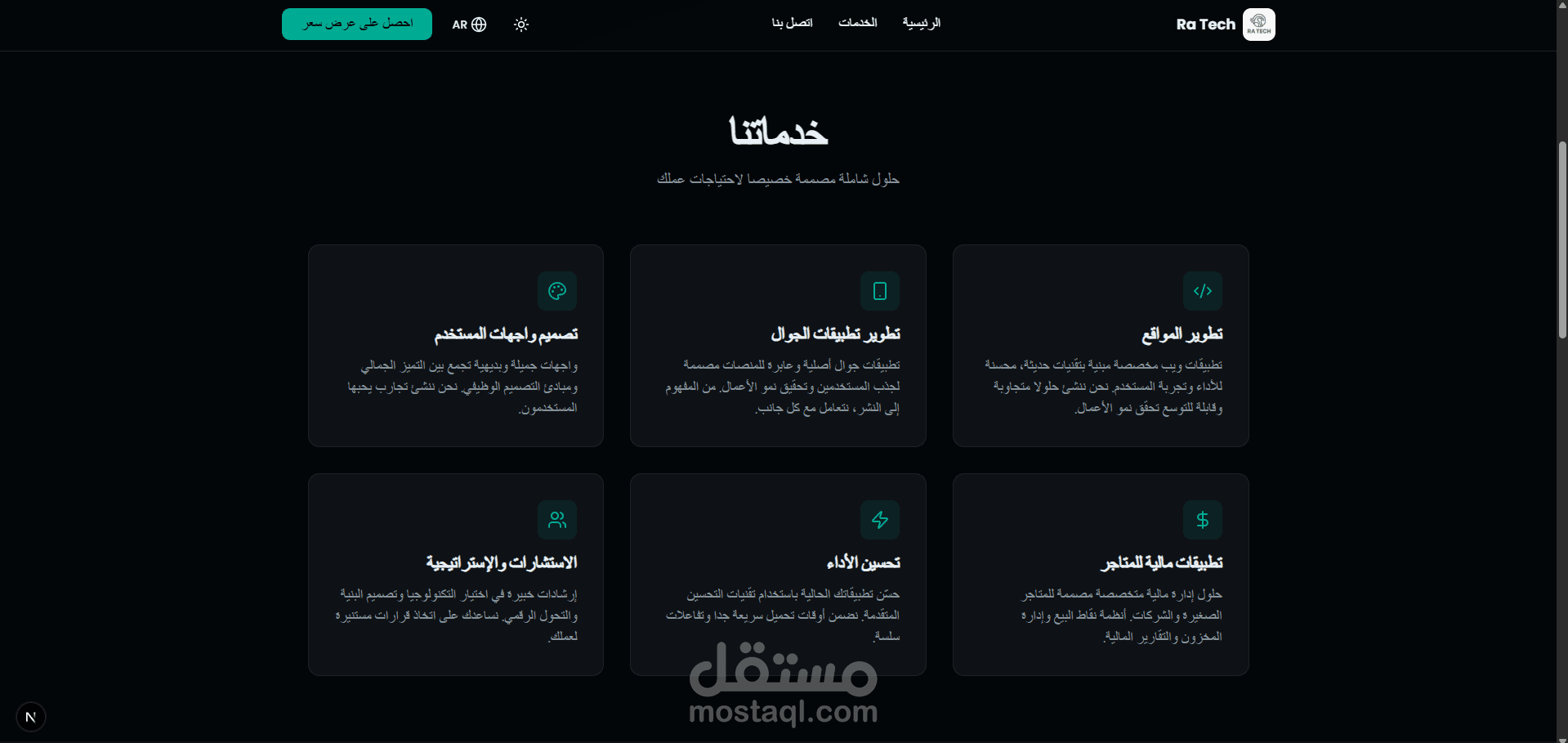 أستعرض نموذج واجهة أمامية (Frontend) مطوّرة باستخدام Next.js لموقع شركة تقنية حديثة باسم رع تك.
