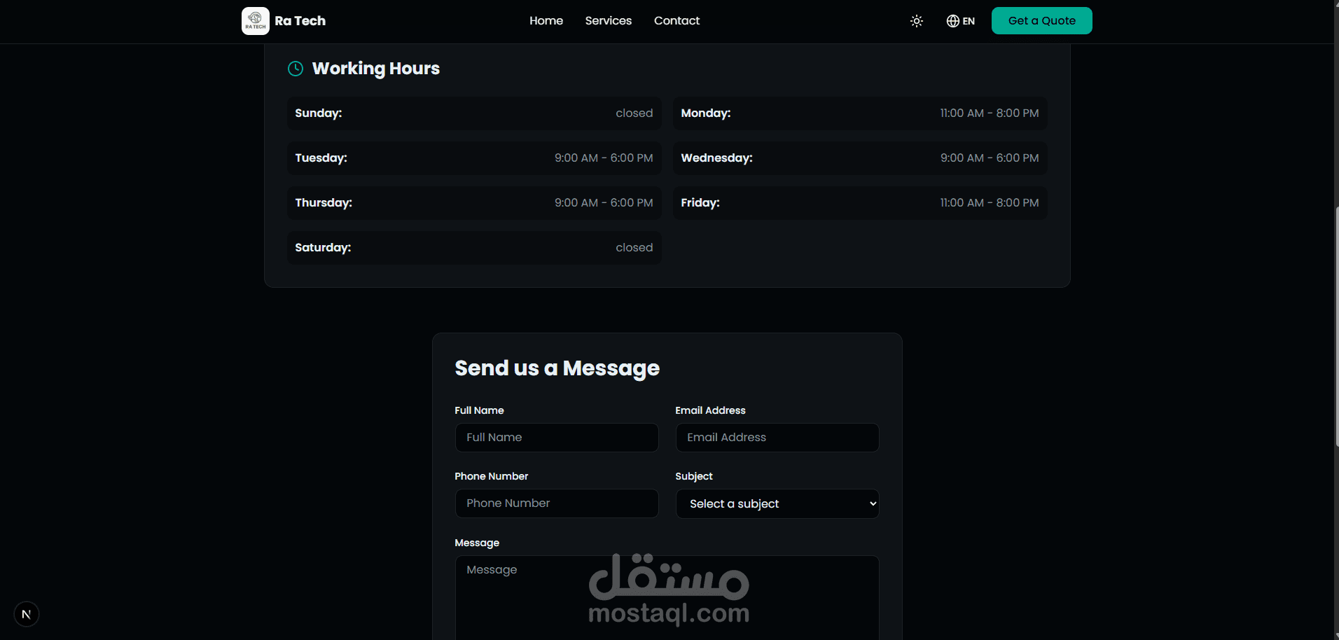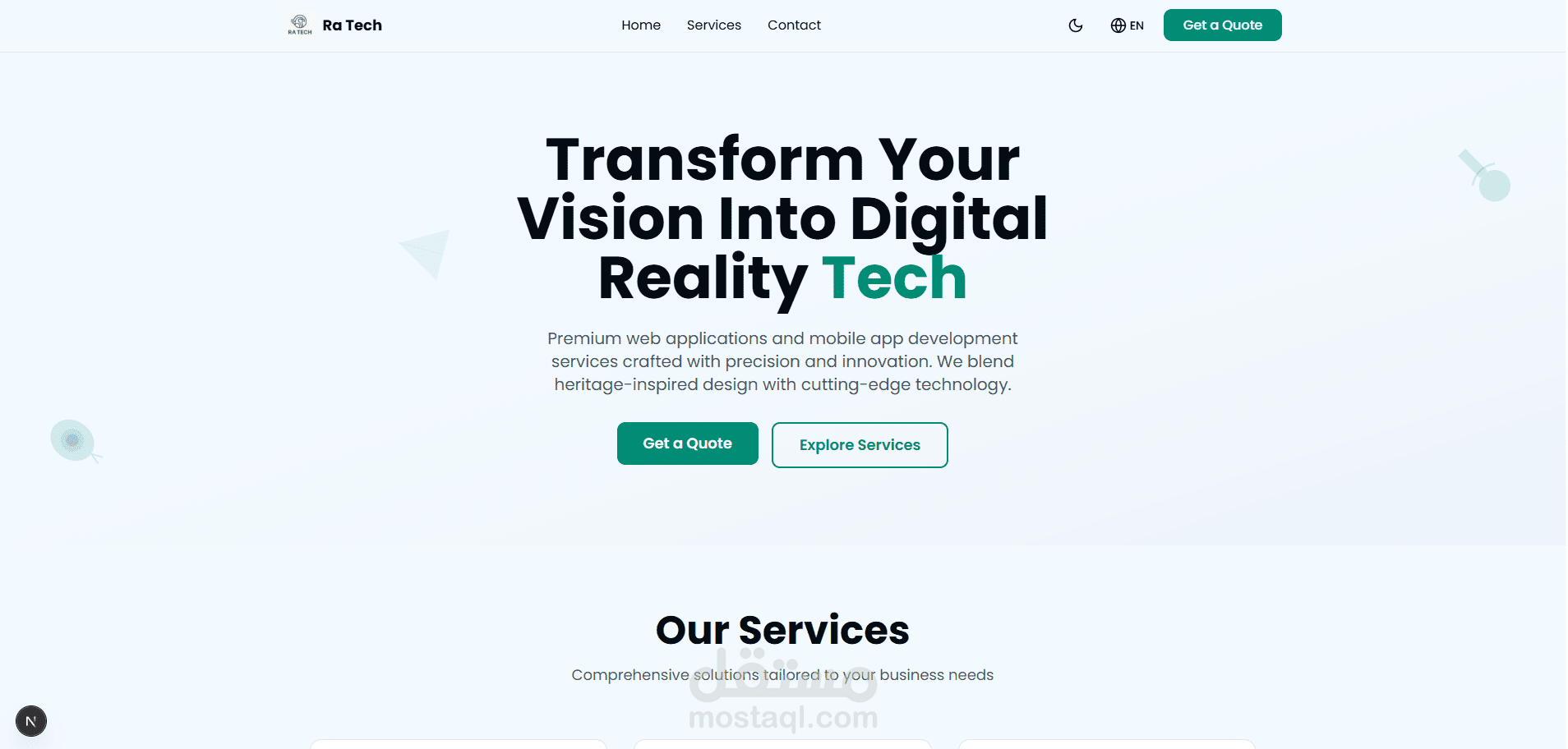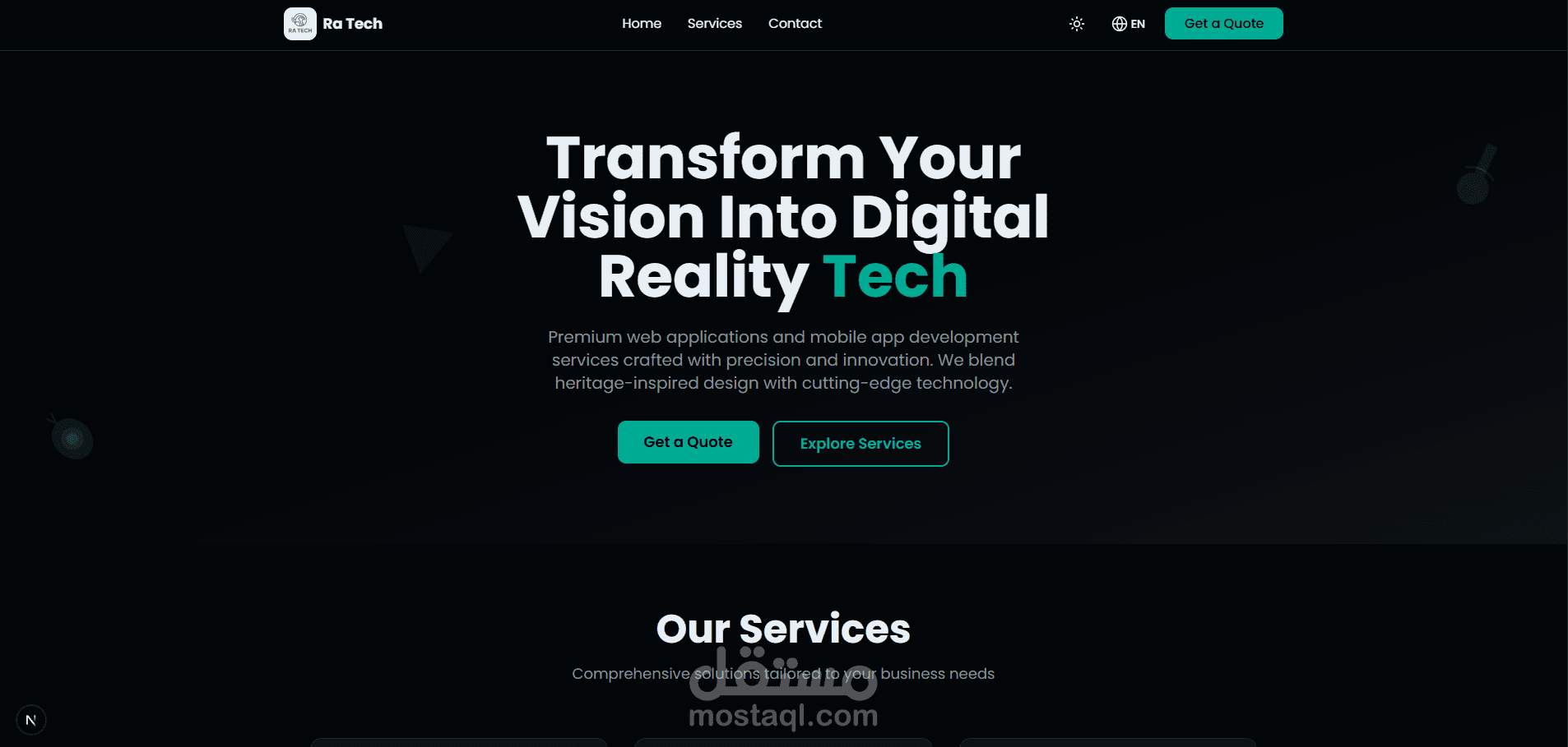 أستعرض نموذج واجهة أمامية (Frontend) مطوّرة باستخدام Next.js لموقع شركة تقنية حديثة باسم رع تك.