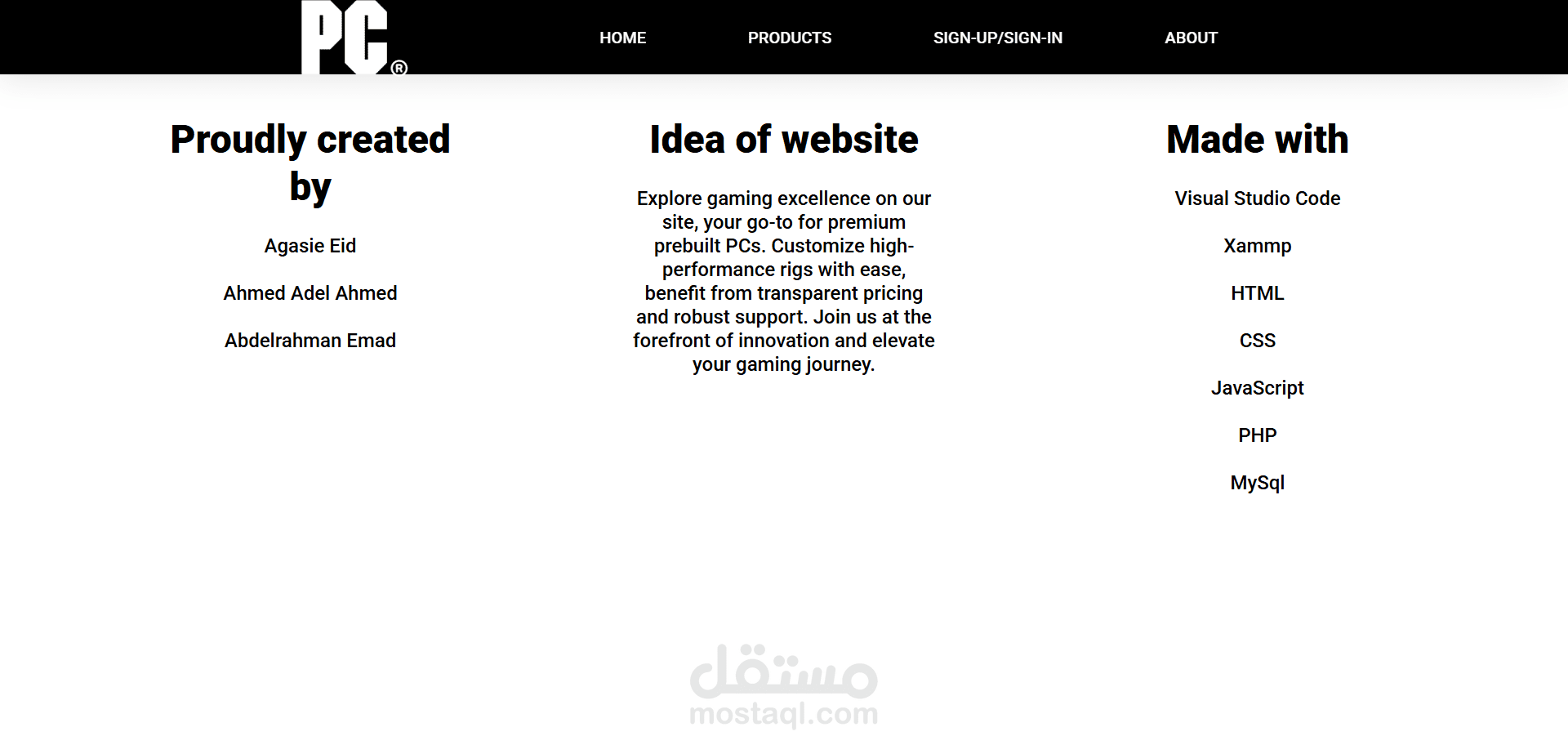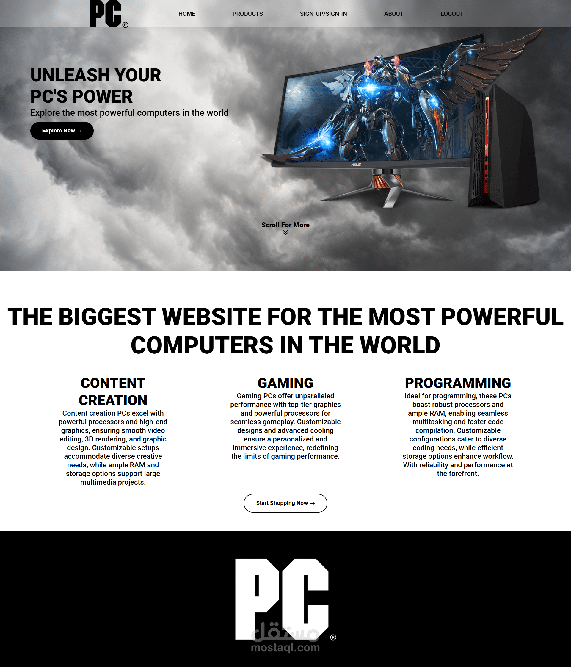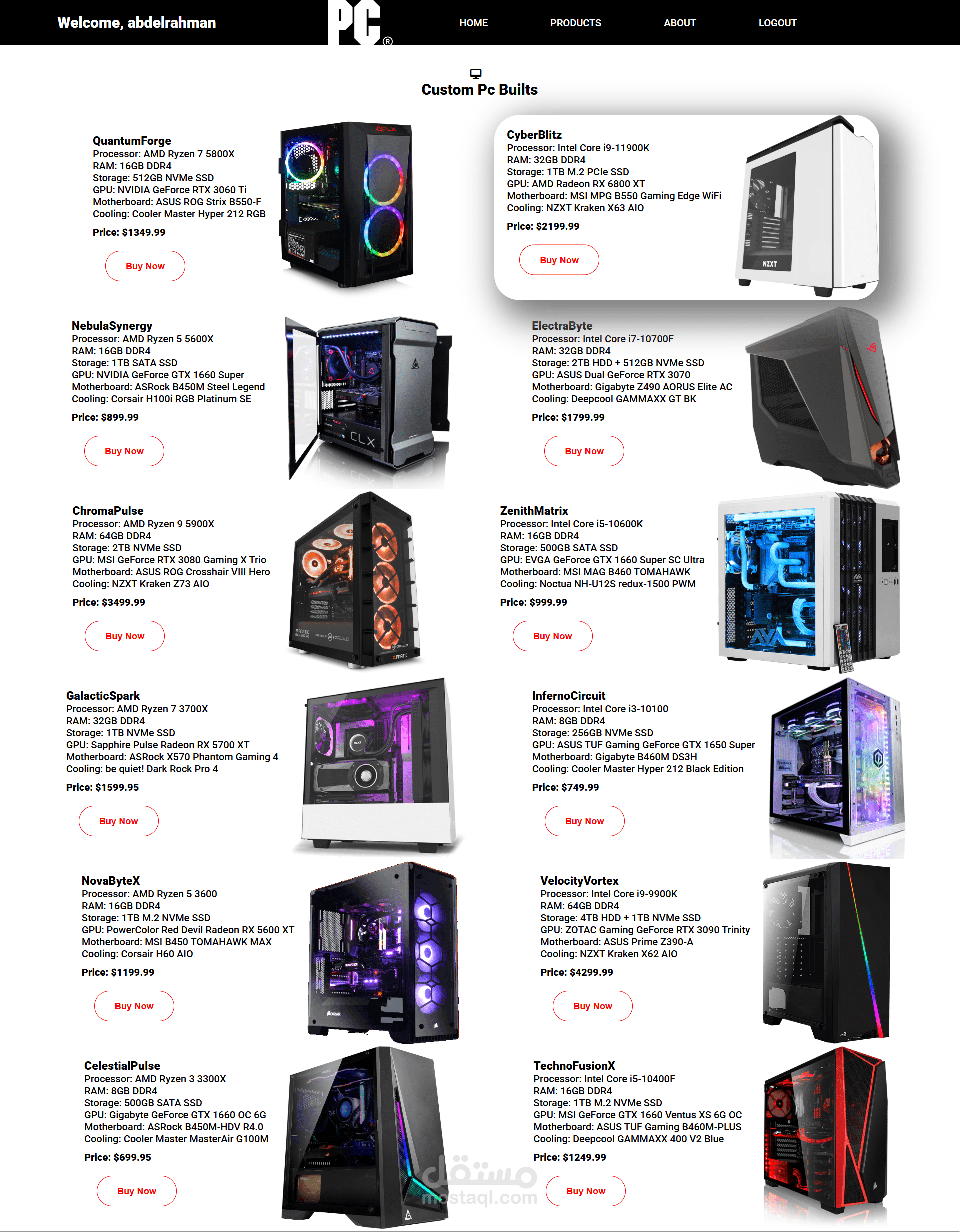 تم تصميم وتطوير هذا المشروع كموقع ويب متكامل لمتجر إلكتروني متخصص في بيع أجهزة الكمبيوتر المجمعة (Pre-built PCs). يجمع المشروع بين تصميم واجهة أمامية جذاب وعصري، مع بناء واجهة خلفية قوية وآمنة لإدارة المستخدمين، مما يوفر تجربة مستخدم كاملة من البداية إلى النهاية.