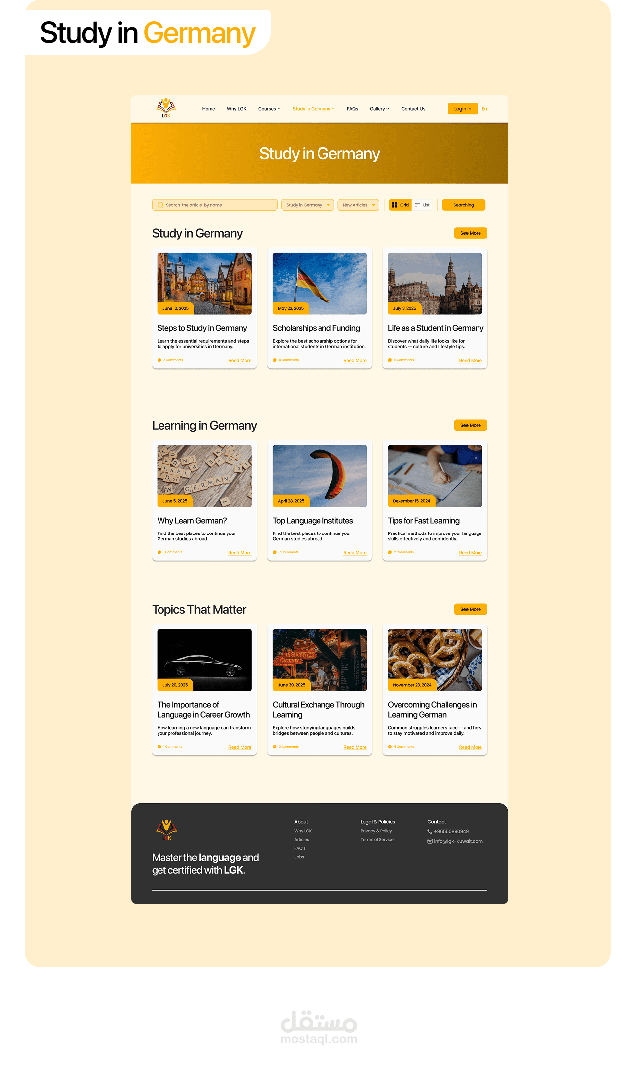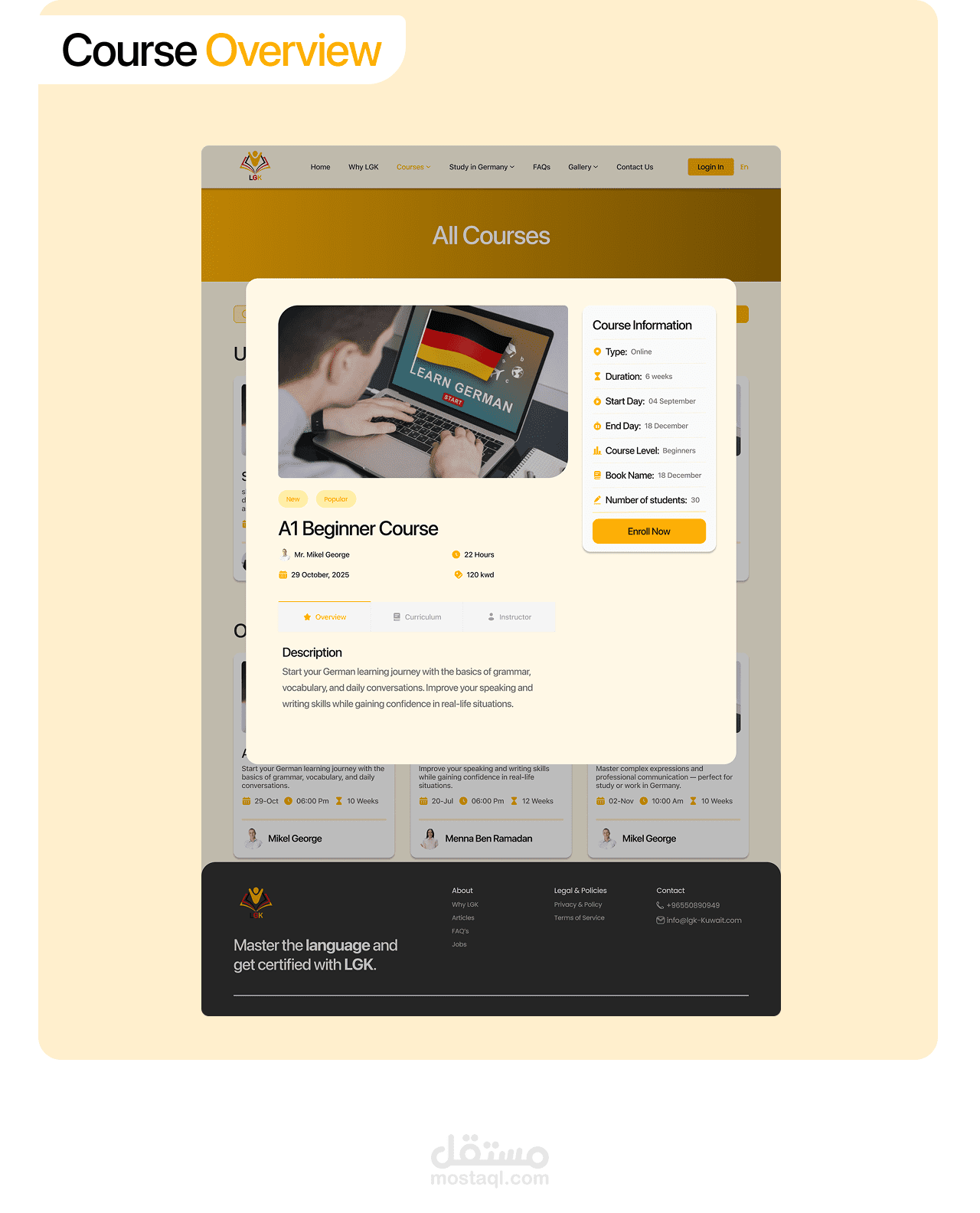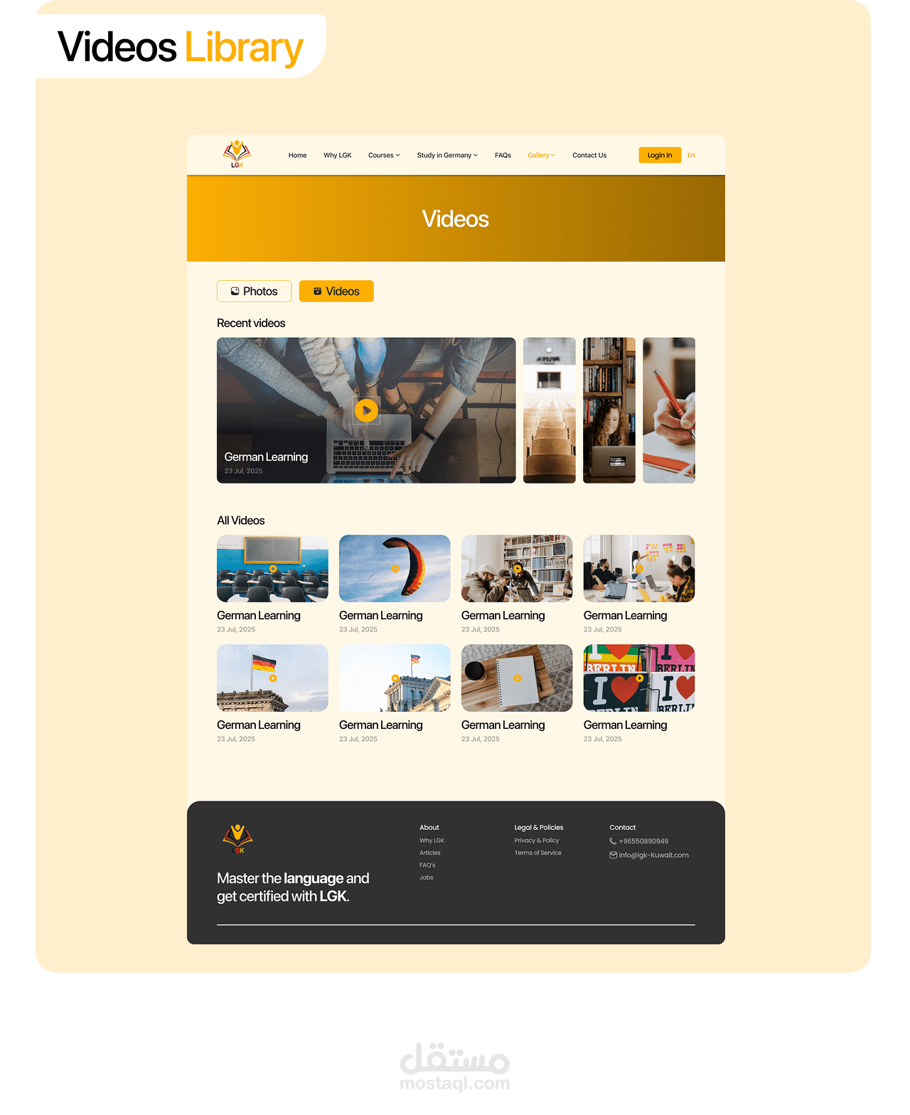 مشروع تصميم موقع Learn German Kuwait (LGK) هو عمل حر (Freelance) قمت فيه بإعادة تصميم شاملة للموقع الإلكتروني الخاص بالأكاديمية التعليمية المتخصصة في تعليم اللغة الألمانية. ركّزت في المشروع على تحسين تجربة المستخدم وتبسيط رحلة التعلّم داخل المنصة، مع إبراز الهوية البصرية للأكاديمية بشكل عصري واحترافي. تضمن العمل تصميم الصفحات الأساسية مثل الصفحة الرئيسية، والدورات، ونموذج التسجيل، والأسئلة الشائعة، وصفحات التواصل، مع تطوير واجهة متناسقة وسهلة الاستخدام تُظهر الموثوقية والاحترافية وتخدم أهداف الأكاديمية التعليمية.