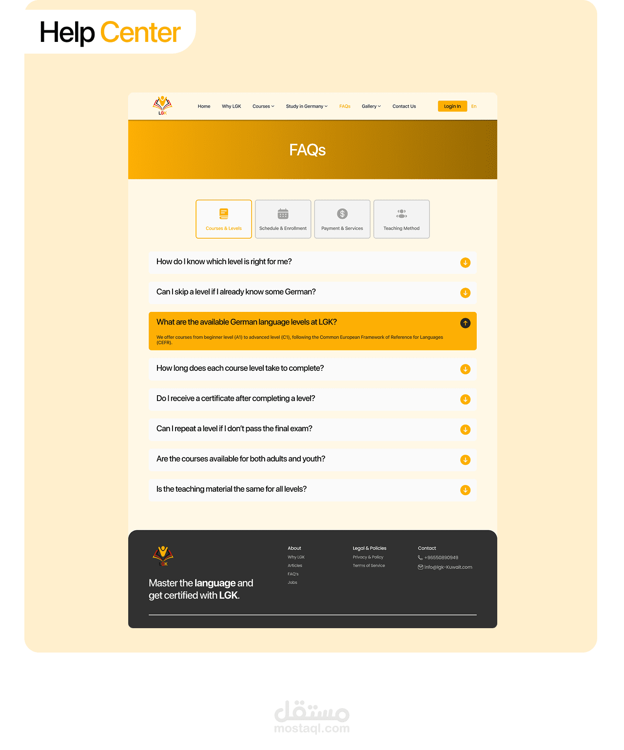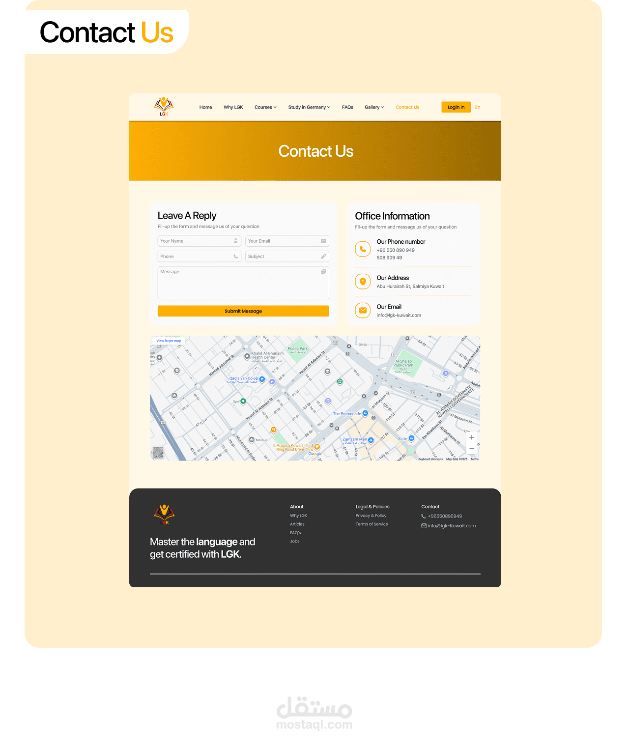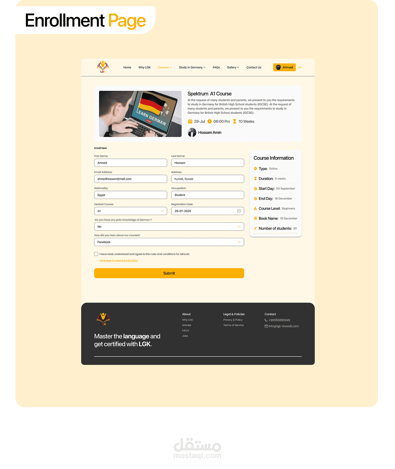 مشروع تصميم موقع Learn German Kuwait (LGK) هو عمل حر (Freelance) قمت فيه بإعادة تصميم شاملة للموقع الإلكتروني الخاص بالأكاديمية التعليمية المتخصصة في تعليم اللغة الألمانية. ركّزت في المشروع على تحسين تجربة المستخدم وتبسيط رحلة التعلّم داخل المنصة، مع إبراز الهوية البصرية للأكاديمية بشكل عصري واحترافي. تضمن العمل تصميم الصفحات الأساسية مثل الصفحة الرئيسية، والدورات، ونموذج التسجيل، والأسئلة الشائعة، وصفحات التواصل، مع تطوير واجهة متناسقة وسهلة الاستخدام تُظهر الموثوقية والاحترافية وتخدم أهداف الأكاديمية التعليمية.