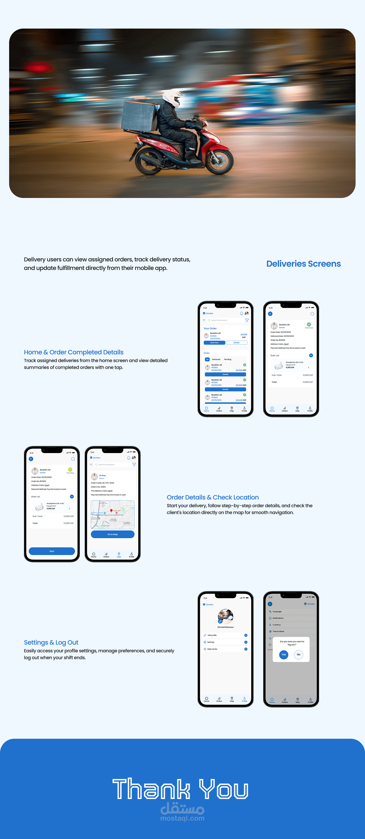 التوصيل (Delivery): استلام الطلبات، توصيلها، وتحديث الحالة في الوقت الفعلي.