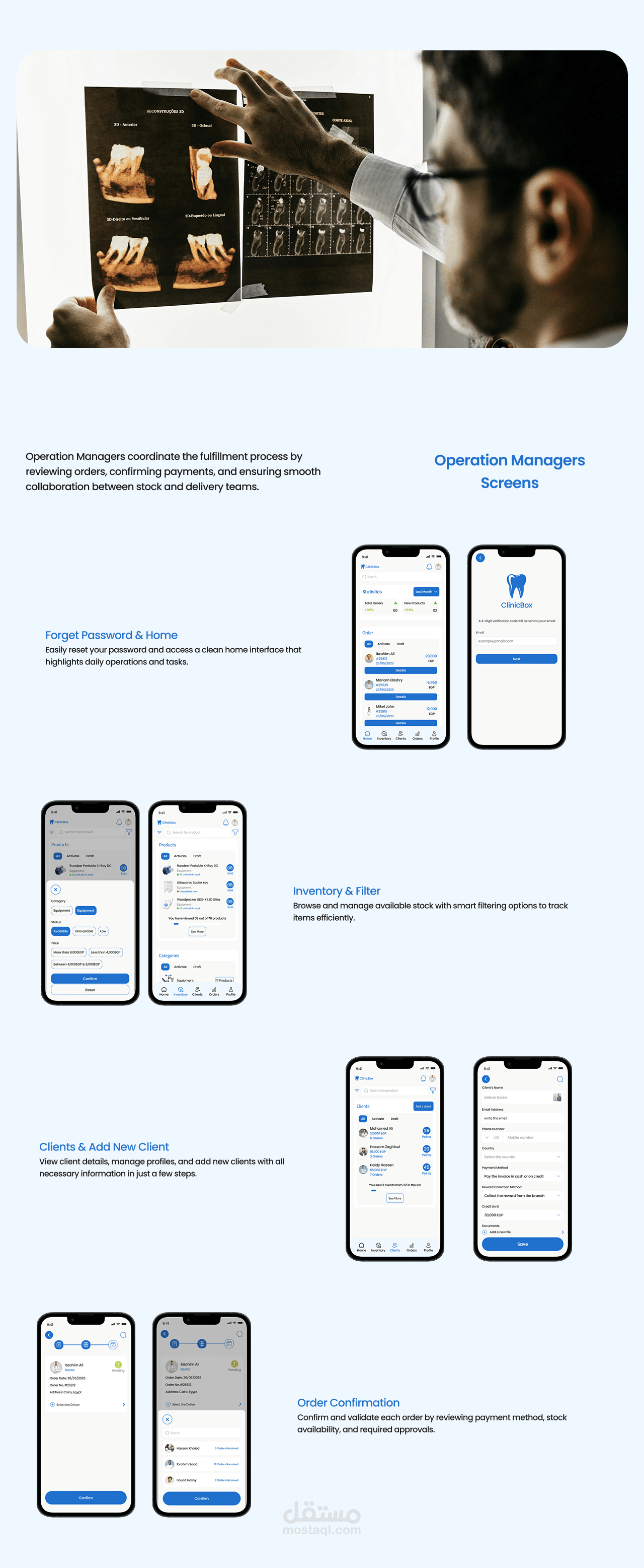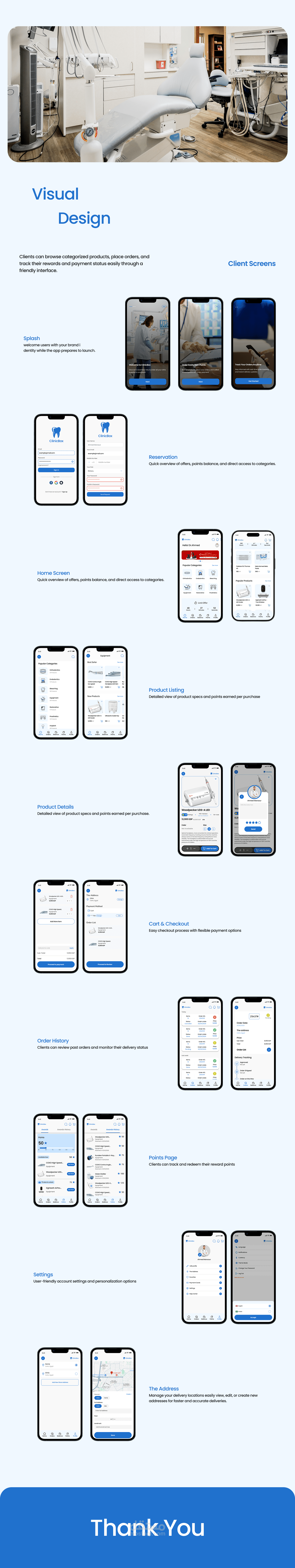 ClinicBox هو نظام متكامل (B2B SaaS) مصمم خصيصًا للعيادات والمراكز الطبية، لتسهيل عملية طلب الأدوات والمستلزمات الطبية بسرعة وكفاءة. المنصة بتوفر تجربة سلسة لكل من العملاء والإدارة، من خلال تصميم بسيط وواضح يراعي احتياجات كل مستخدم داخل النظام و توفير تجربة شراء طبية ذكية وسريعة لأصحاب العيادات والمراكز، مع نظام نقاط ومكافآت لتحفيز العملاء على الاستمرار في التعامل.
