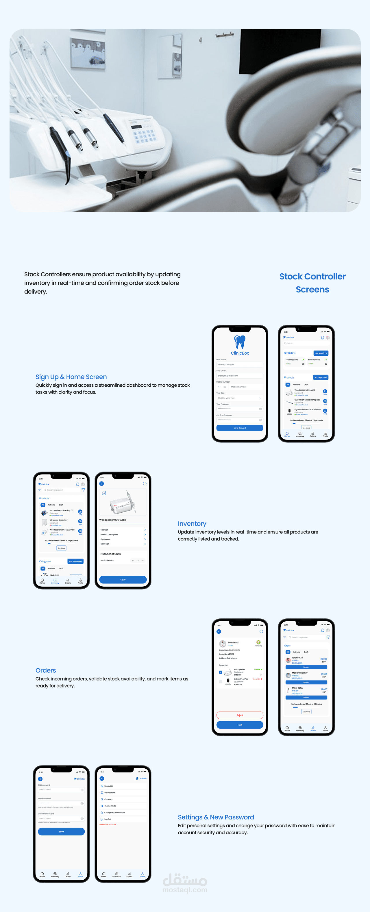 المخزون (Stock Controller): متابعة الكميات، إدارة التوريدات، وتأكيد الطلبات.