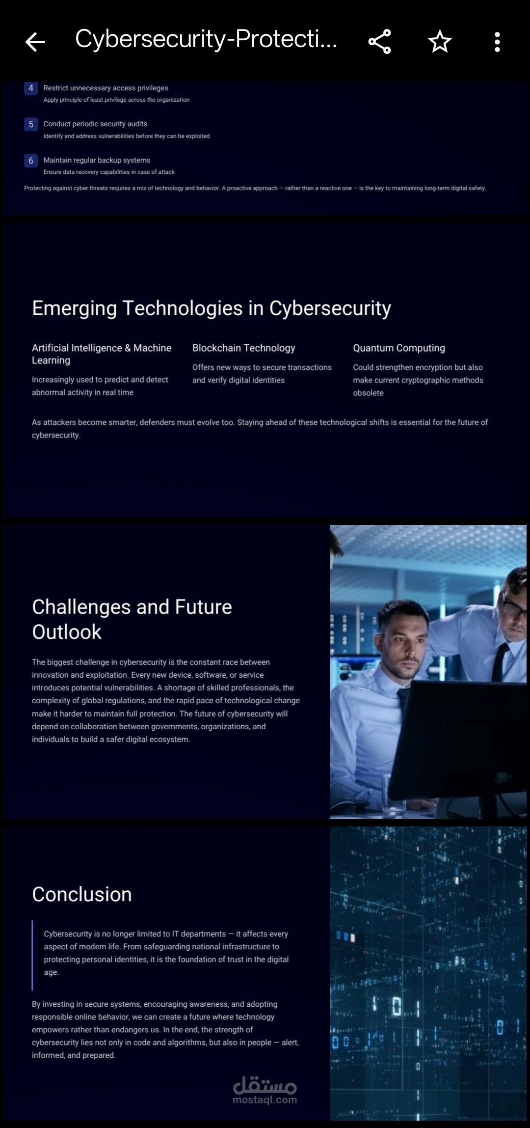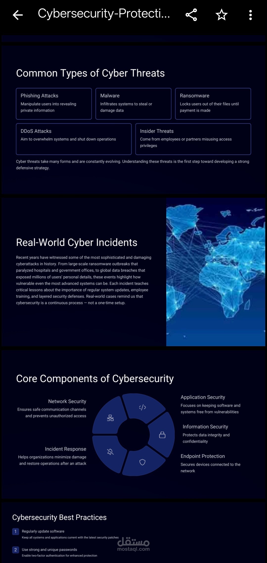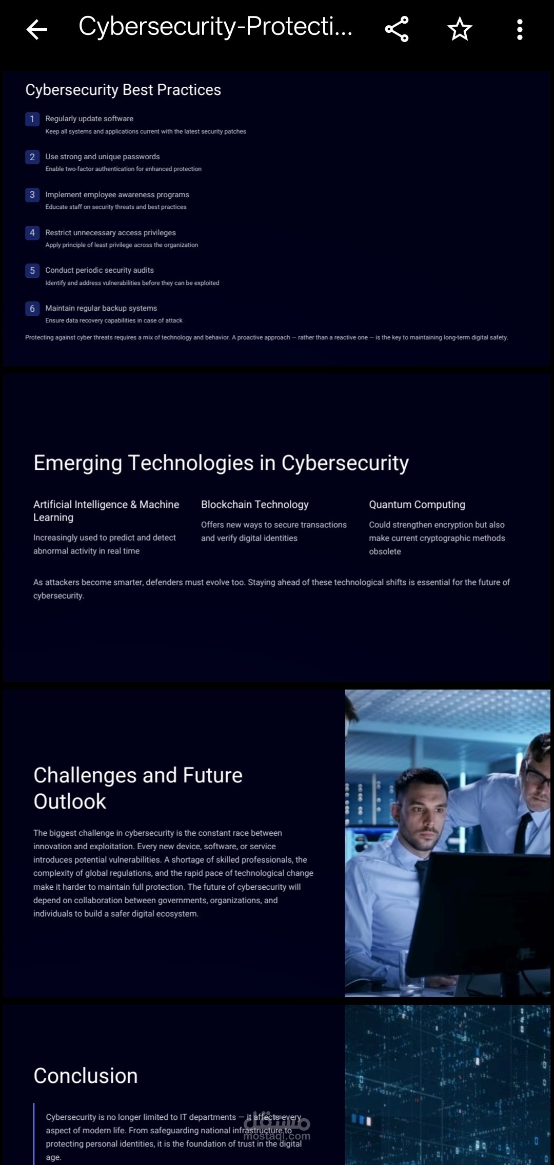 إضافة عناصر تفاعلية ورسوم بيانية توضح المفاهيم الأساسية (مثل أنواع الهجمات، أساليب الحماية، أهمية الوعي الأمني).